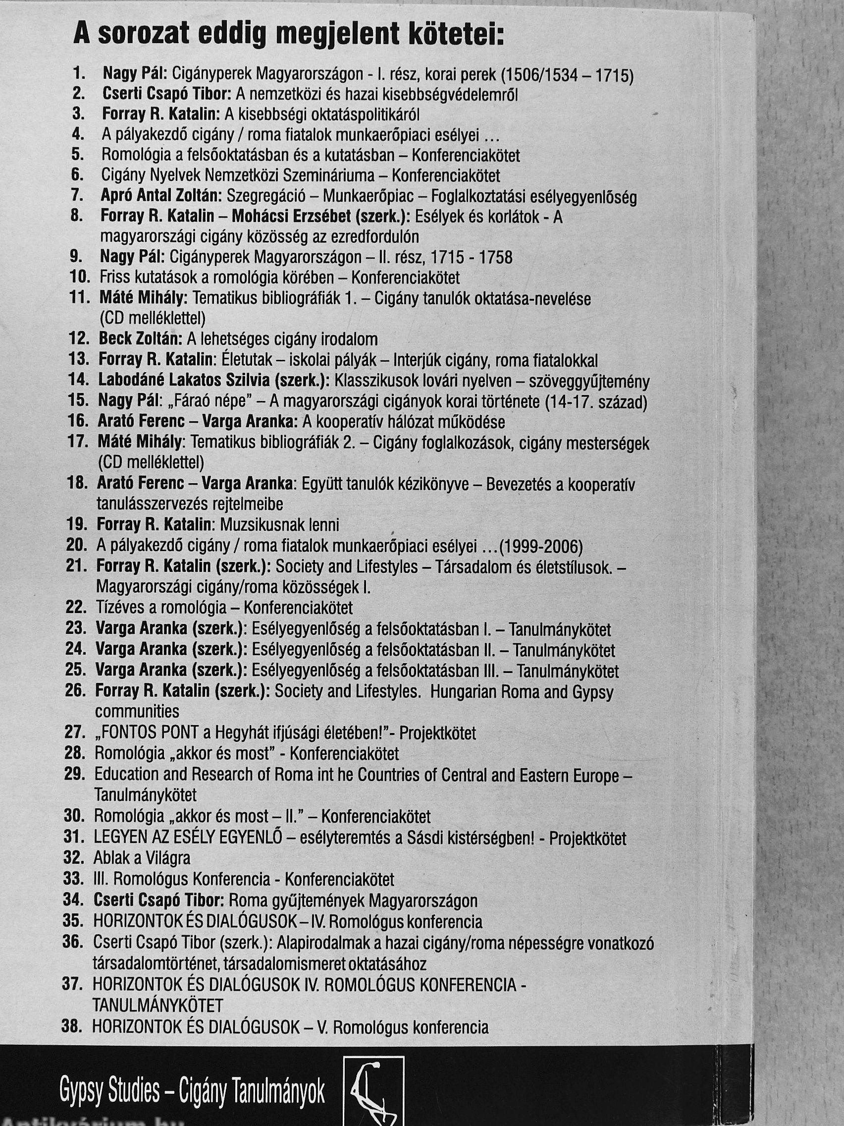 36. Cserti Csapó Tibor (szerk.): Alapirodalmak a hazai cigány/roma népességre vonatkozó társadalomtörténet, társadalomismeret oktatásához
