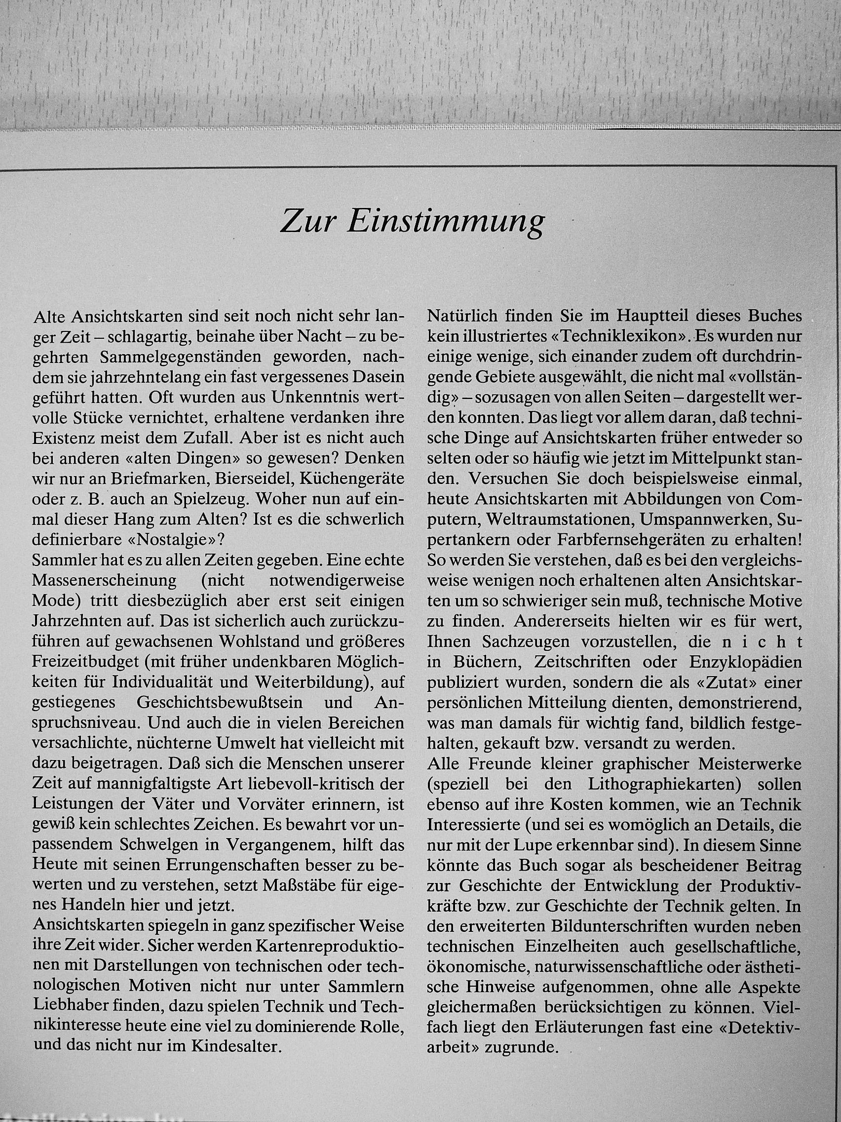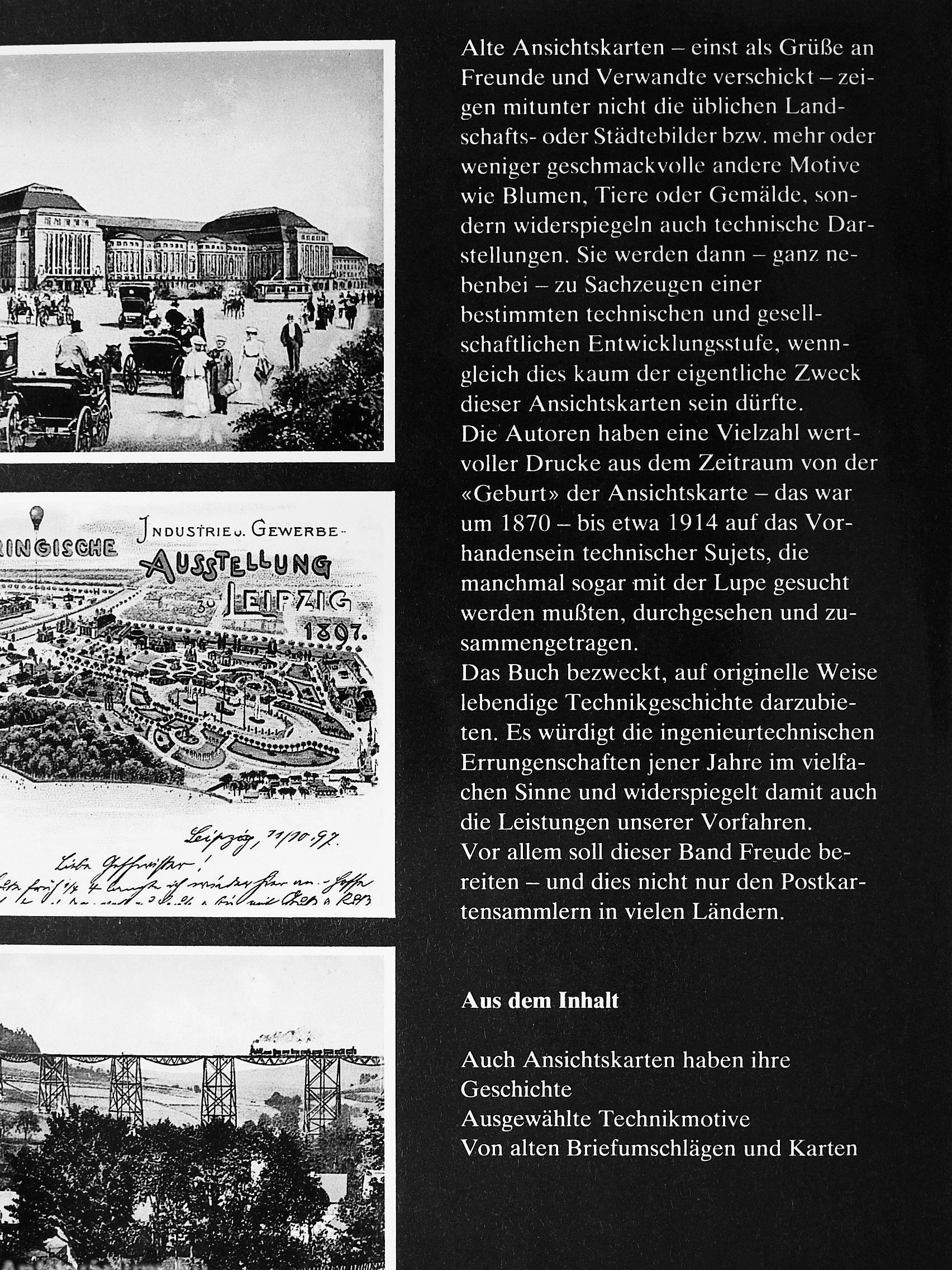 Alte Ansichtskarten — einst als Grüße an Freunde und Verwandte verschicict-zeigen mitunter nicht die üblichen Landschafts- oder Städtebilder bzw. mehr oder weniger geschmackvolle andere Motive wie Blumen, Tiere oder Gemälde, sondern widerspiegeln auch technische Darstellungen. Sie werden dann - ganz nebenbei — zu Sachzeugen einer bestimmten technischen und gesellschaftlichen Entwicklungsstufe, wenngleich dies kaum der eigentliche Zweck dieser Ansichtskarten sein dürfte. Die Autoren haben eine Vielzahl wertvoller Drucke aus dem Zeitraum von der «Geburt» der Ansichtskarte - das war um 1870 - bis etwa 1914 auf das Vorhandensein technischer Sujets, die manchmal sogar mit der Lupe gesucht werden mußten, durchgesehen und zusammengetragen.