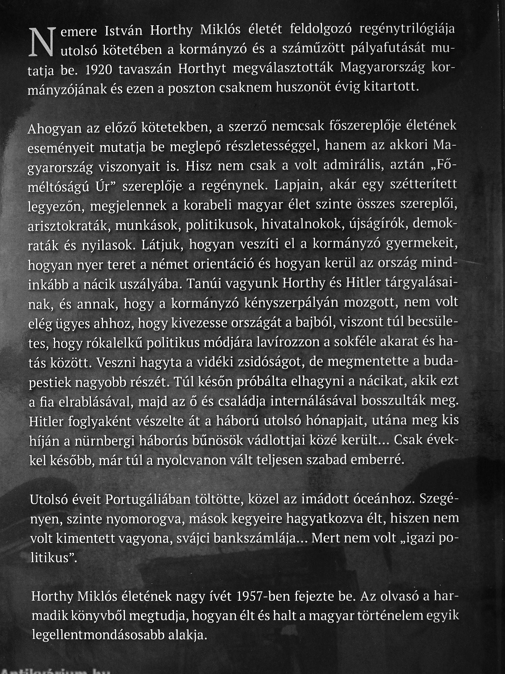 Horthy Miklós életének nagy ívét 1957-ben fejezte be. Az olvasó a harmadik könyvből megtudja, hogyan élt és halt a magyar történelem egyik legellentmondásosabb alakja.
