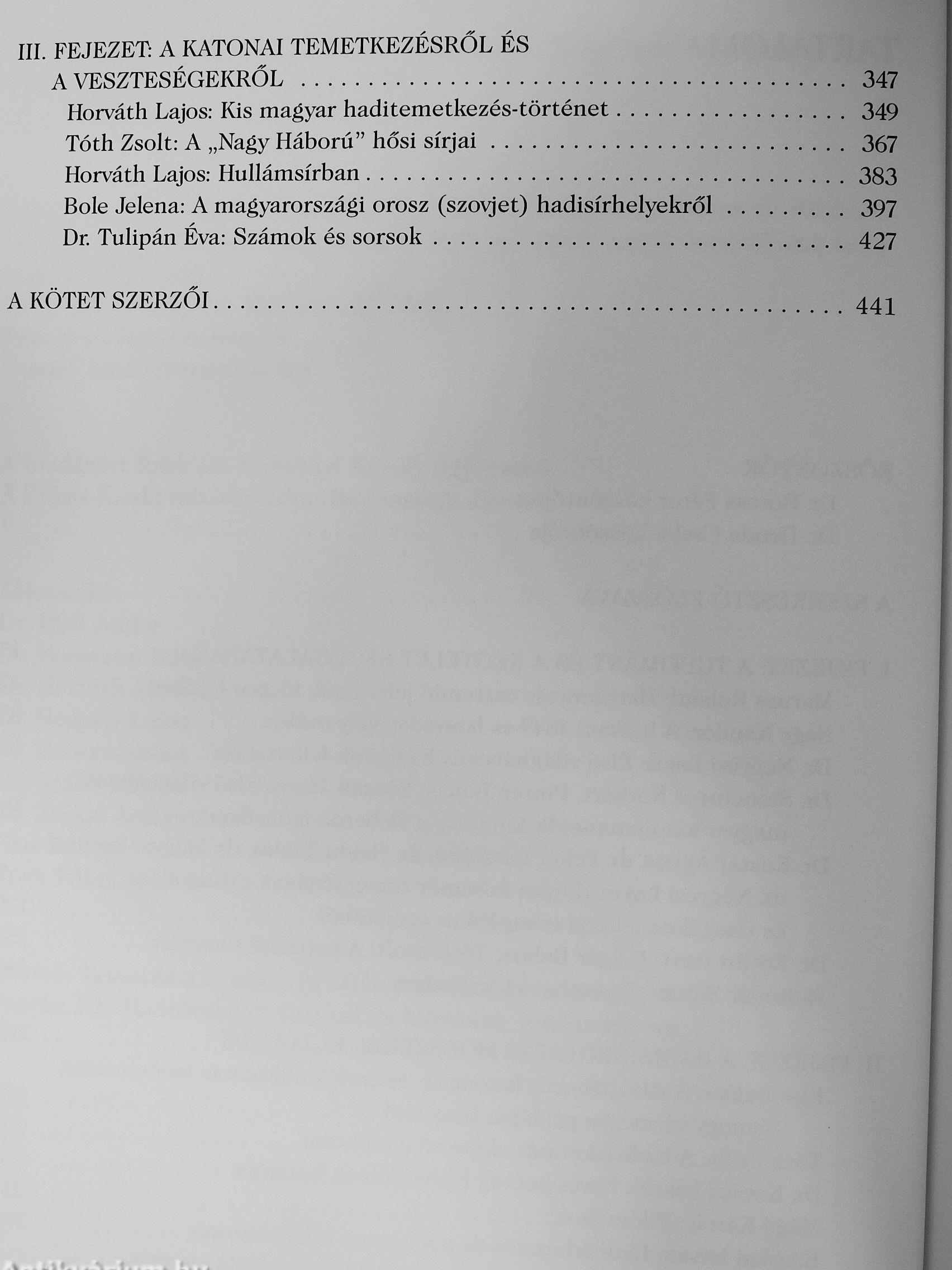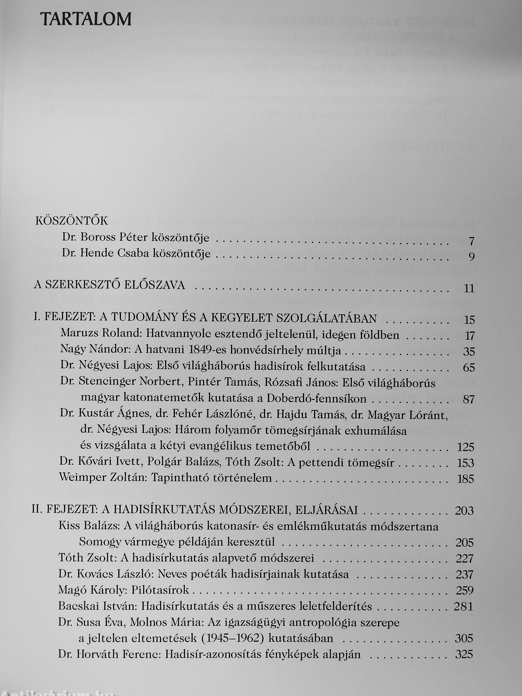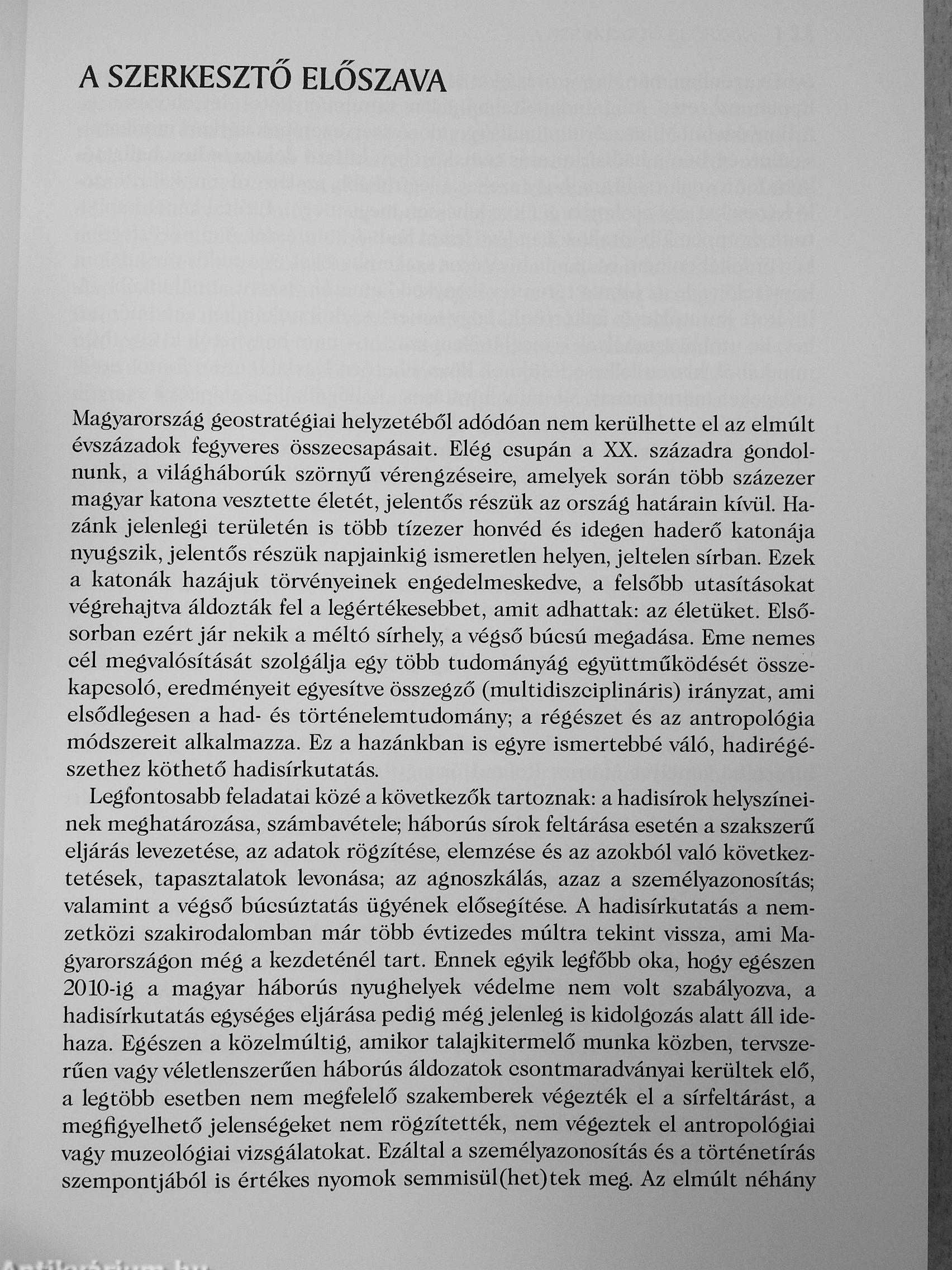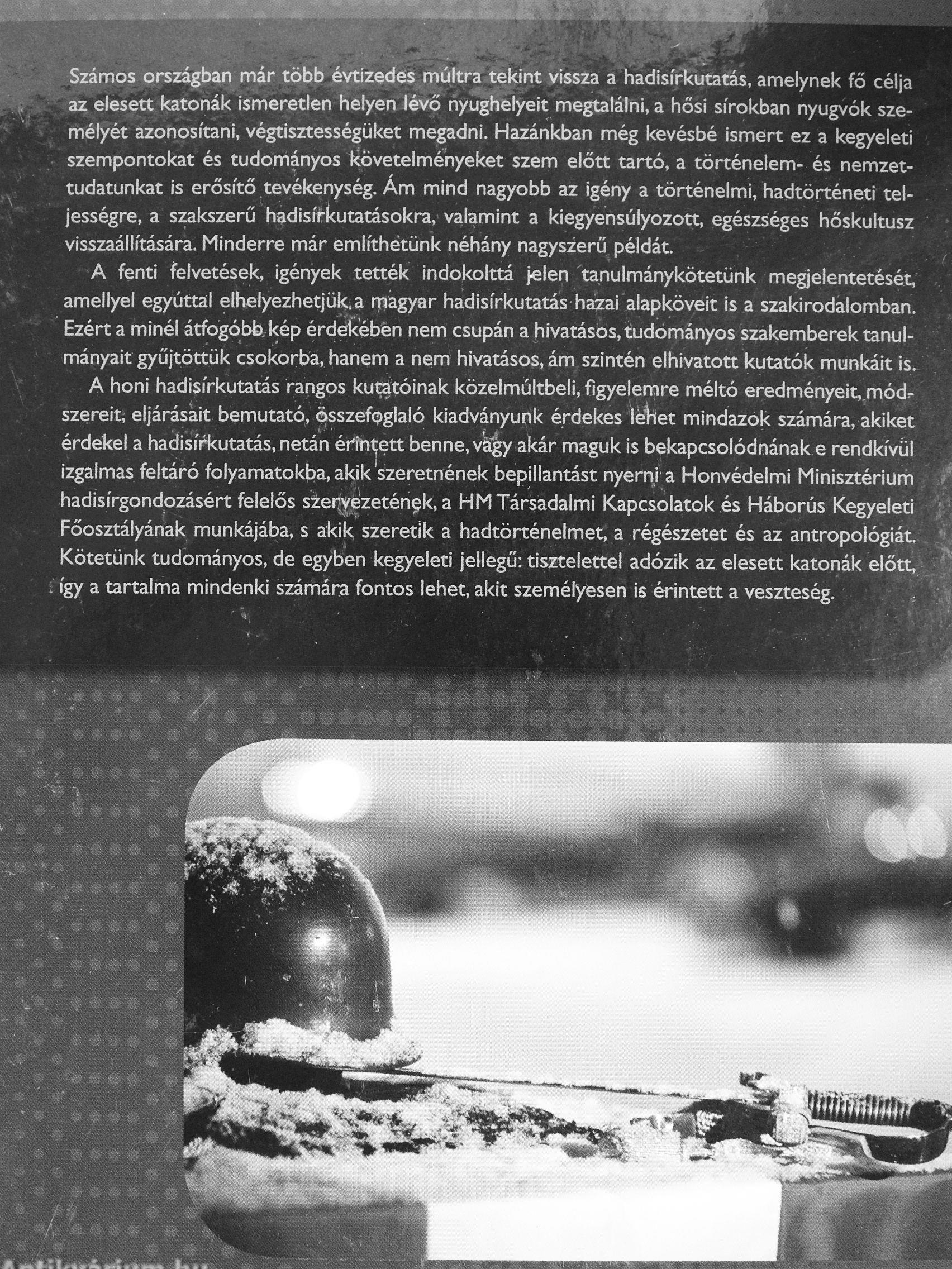 A honi hadisírkutatás rangos kutatóinak közelmúltbeli, figyelemre méltó eredményeit módr szereit, eljárásait bemutató, CKSzefoglaló kiadványunk érdekes iáiet mindazok számára, akiket érdekel a hadisírt<utatás. netán értnifett benne, v^ akár maguk is bekapcsolódnának e rendkívül izgalmas feltáró folyamatokba, akik szeretnének bepillantást nyerni a Honvédelmi Minisztérium hadisírgondozásért felelős sier^zeténgk. a HM Társadalmi Kapcsolatok és Háborús Kegyeleti Főosztályának munkájába, s akik szeretik a hadtörténelmet, a régészetet és az antropologiat Kötetünk tudományos, de egyben kegyeleti jellegű: dsztelettel adózik az elesett katonak elot.