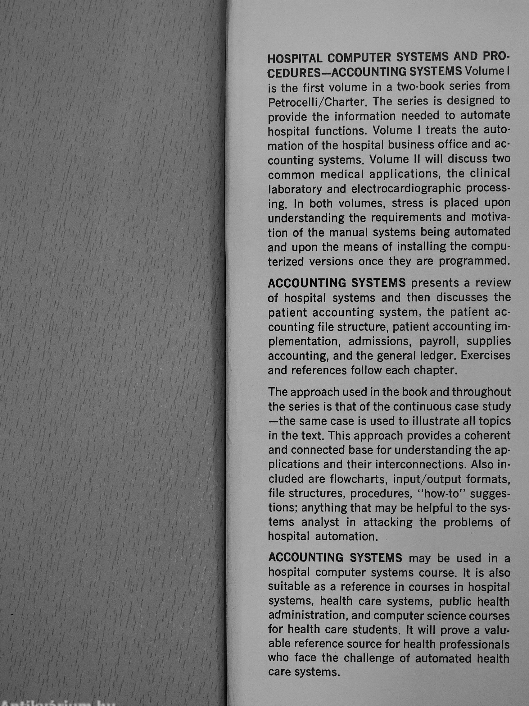 HOSPITAL COMPUTER SYSTEMS AND PROCEDURES-ACCOUNTING SYSTEMS Volume I is the first volume in a two-book series from Petrocelli/Charter. The series is designed to provide the information needed to automate hospital functions. Volume I treats the automation of the hospital business office and accounting systems. Volume II viiill discuss two common medical applications, the clinical laboratory and electrocardiographic processing. In both volumes, stress is placed upon understanding the requirements and motivation of the manual systems being automated and upon the means of installing the computerized versions once they are programmed.
