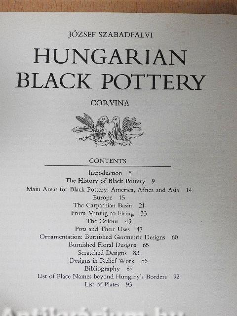 | Népművészet, magyar, fekete agyag, használati tárgyak, alkalmazott művészet, dísztárgyak, díszítő művészet, fekete-fehér fotókkal és illusztrációkkal, technológia, előfordulási helyek (Magyarországon kívül is), minták, formák |