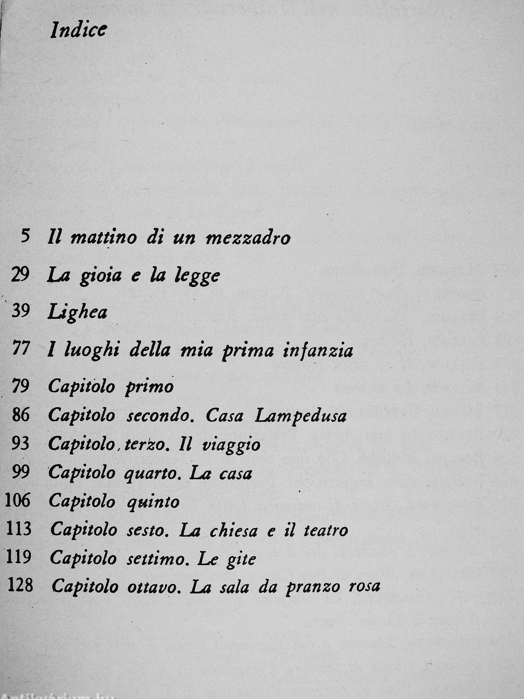 Chiudono il libro / luoghi della mia prima infanzia. Furono scritti a partiré dal giugno del '55, e sono importanti non soltanto perché rappresentano il primo tentativo di Tomasi di Lampedusa as a writer, ma per l'inarrivabile grazia, quasi settecentesca, del loro dettato. Buttati giú per uso privato, in commemorazione delle due case, parimenti perdute, nelle quali si svolse gran parte dell'infanzia dello scrittore, questi Luoghi della mia prima infanzia sono, invece, un "pezzo" di prim'ordine: un abbozzo del gran romanzo che giá urge alie porte della fantasia, é vero, ma insieme di piú, molto di piú. Vissza