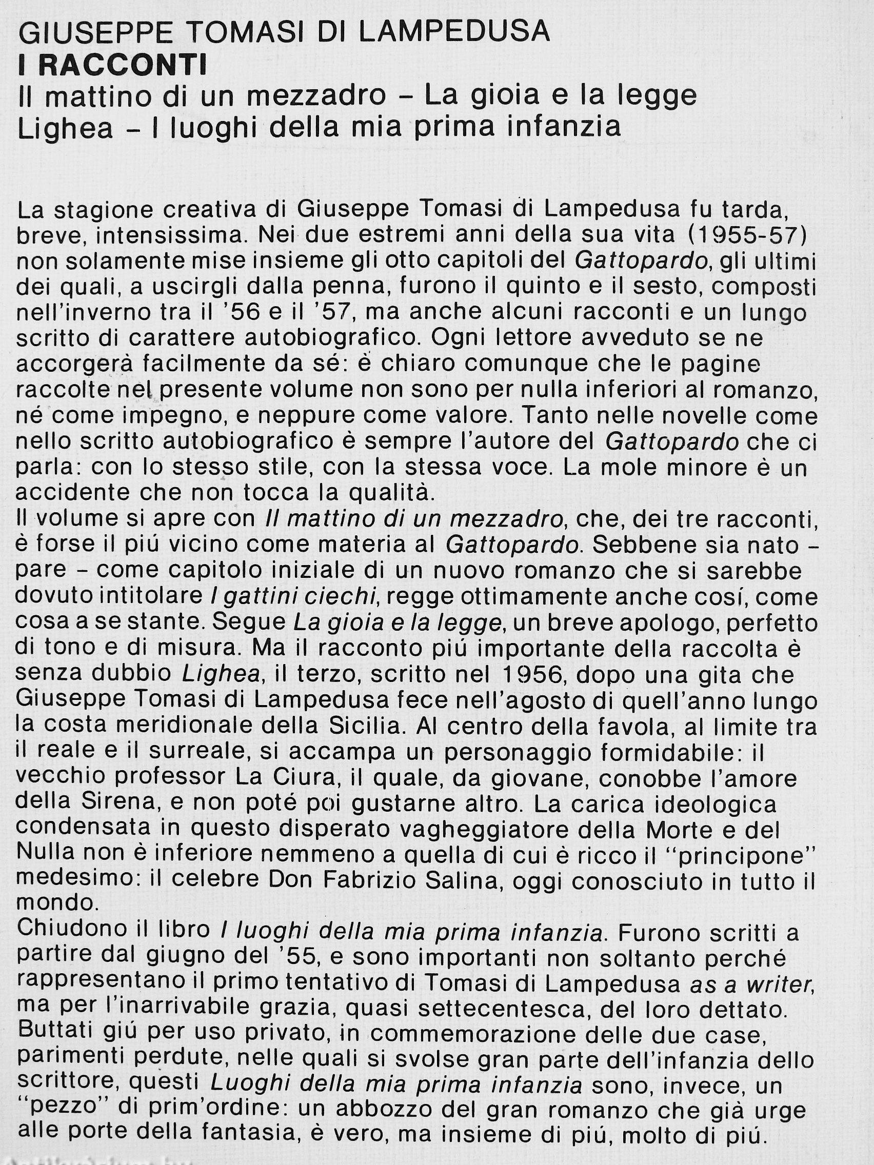 II volume si apre con II mattino di un mezzadro, che, dei tre racconti, é forse il piú vicino come materia al Gattopardo. Sebbene sia nato -pare - come capitolo iniziale di un nuovo romanzo che si sarebbe dovuto intitolare / gattini ciechi, regge ottimamente anche cosí, come cosa a se stante. Segue La gioia e la legge, un breve apologo, perfetto di tono e di misura. Ma il racconto piú importante della raccolta é senza dubbio Lighea, il terzo, scritto nel 1956, dopo una gita che Giuseppe Tomasi di Lampedusa fece nell'agosto di quell'anno lungo la costa meridionale della Sicilia. Al centro della favola, al limite tra il reale e il surreale, si accampa un personaggio formidabile: il vecchio professor La Ciura, il quale, da giovane, conobbe l'amore della Sirena, e non poté poi gústame altro. La carica ideológica condénsala in questo disperato vagheggiatore della Morte e del Nulla non é inferiore nemmeno a quella di cui é ricco il "principone" medesimo: il celebre Don Fabrizio Salina, oggi conosciuto in tutto il mondo.