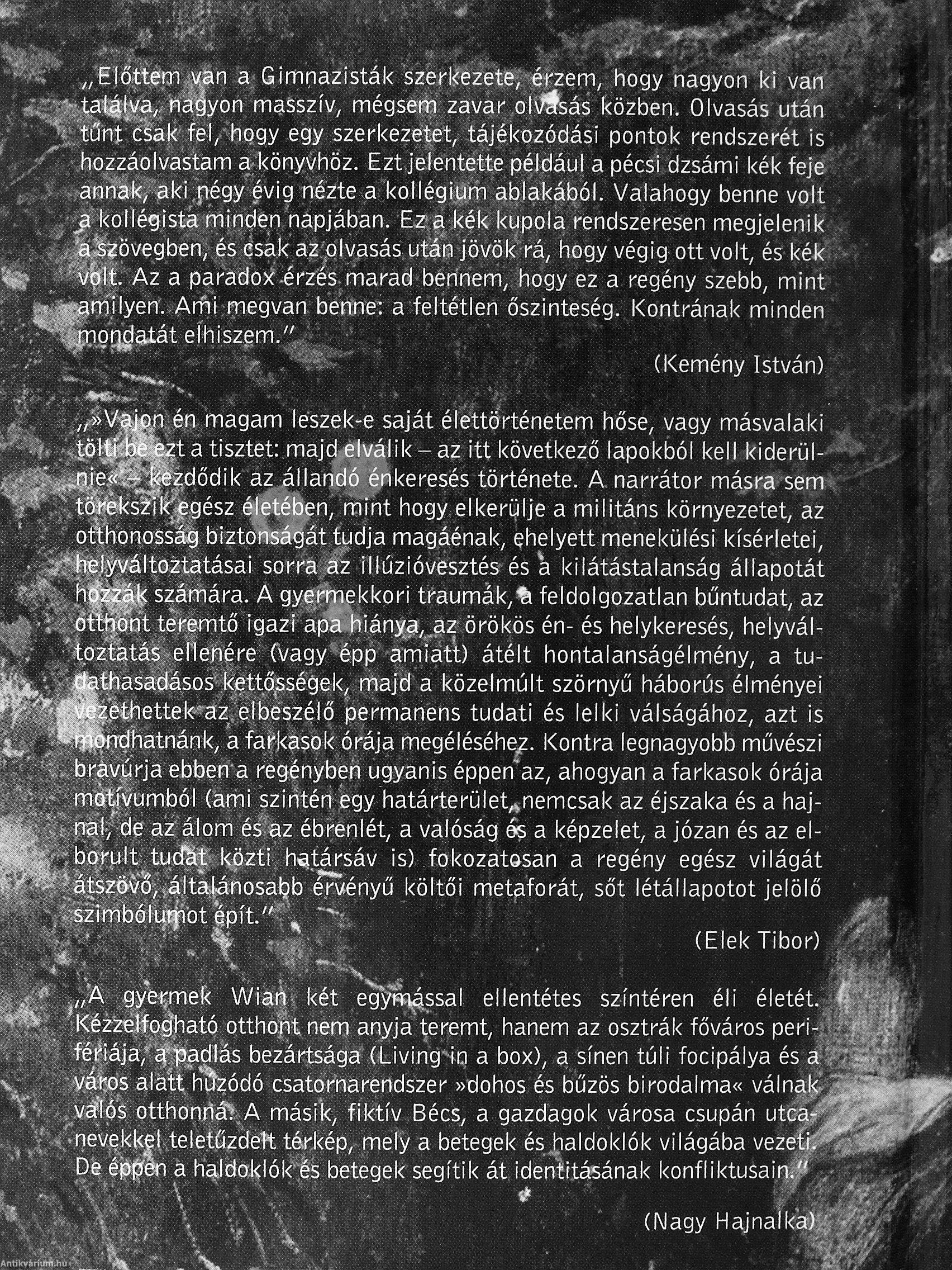 «thasadásos'kettő,sségek, majd a közelmúlt szörnyű háborús élményei vethettek-^az elbeszélő permanens tudati és lelki válságához, azt is S^rrdhatnánk, a farkasok órája megéléséhe/. Kontra legnagyobb művészi ., brávúrja ebben a regényben ugyanis éppen'az, ahogyan a farkasok órája - mótívumból (ami szintén egy határterület,»nemcsak az éjszaka és a haj-nai, de az álom és az ébrenlét, a valóság és a képzelet, a józan és az el--borult tudSt közti határsáv is) fokozatasan a regény egész világát ^'áfeövo,.álta|ánosal?b érvényű költői metaforát, sőt létállapotot jelölő , l.szimbólui^ot Ipít."