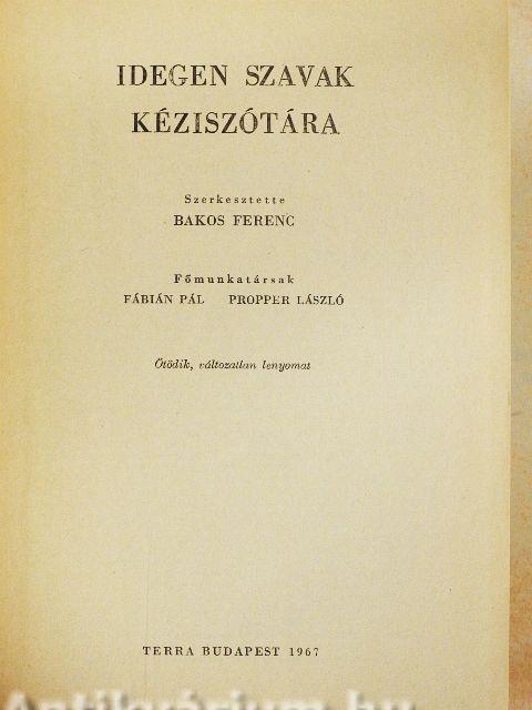 Szótárunk megjelentetésekor az volt a tervünk, hogy bizonyos idő eltelte után javítottan adjuk ki újra, ám könyvünknek már említett gyors kifogyása s ugyanakkor az iránta megnyilvánuló s nem csökkenő érdeklődés azt kívánta, hogy szándékunk valóraváltását halasszuk későbbre, és az Idegen Szavak Kéziszótárát változatlan lenyomatban hozzuk újra forgalomba. A fentebbi okok miatt ez új lenyomatban csupán arra nyílt módunk, hogy 777. oldalon közölhessük szótárunk azon szavait, amelyeknek írásmódja "A magyar helyesírás szabályai"-tól eltér. Sikerült továbbá szótárunkat néhány, jegyzetek bevezetésére szánt üres lappal megtoldani.
