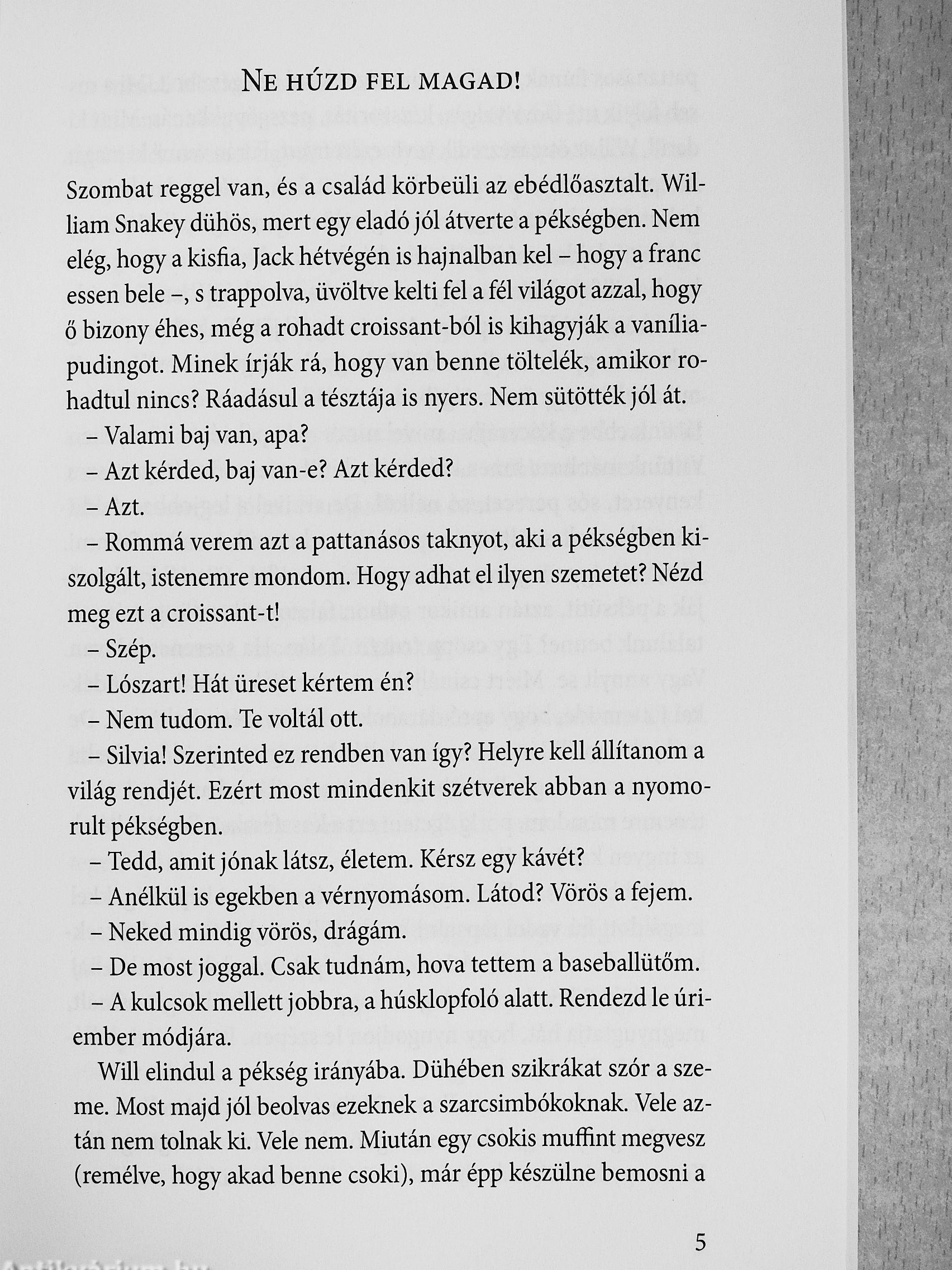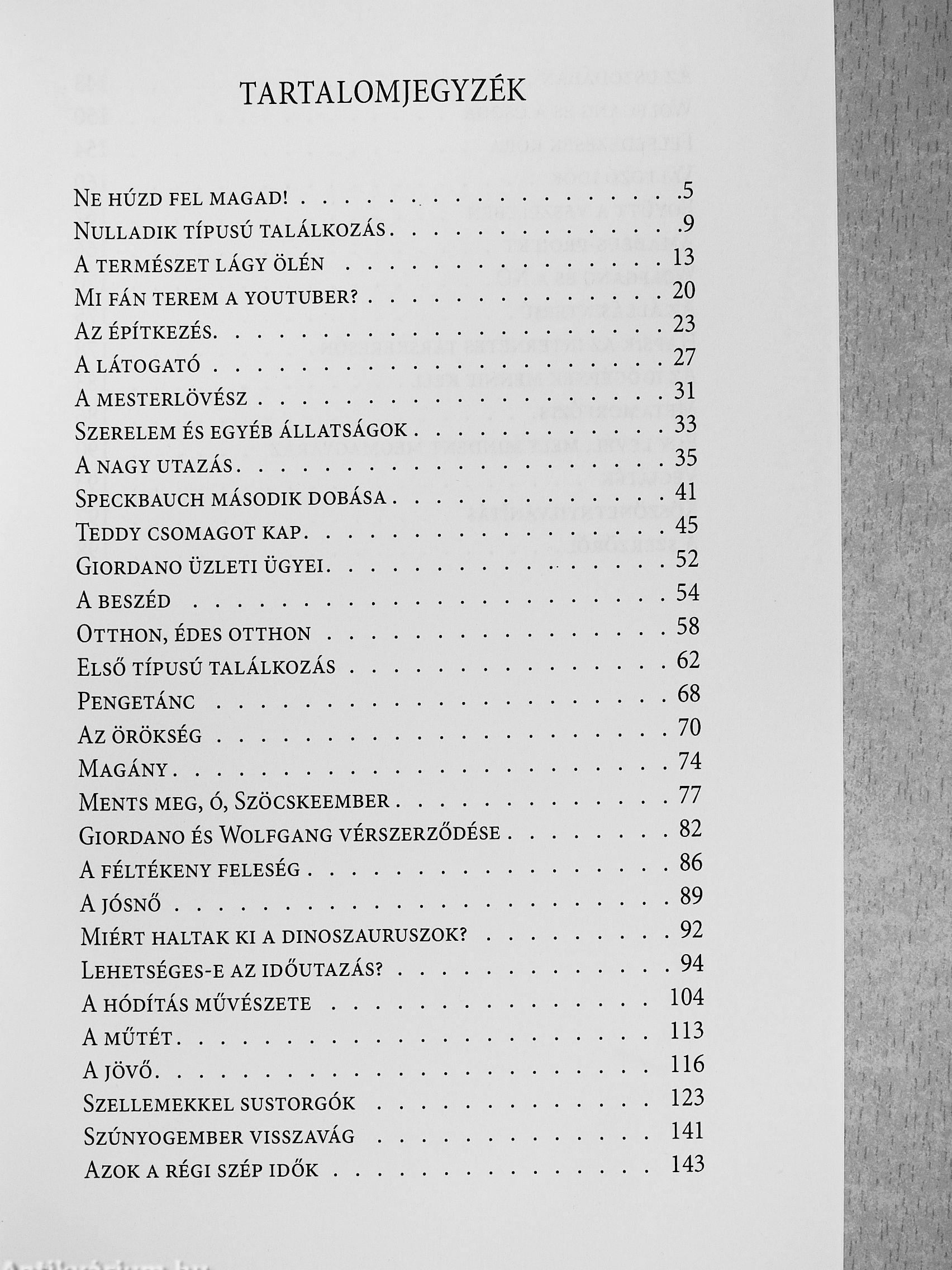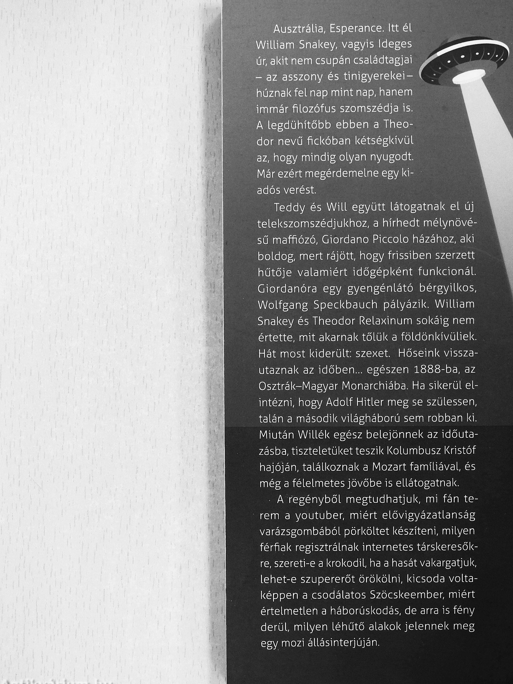 A regényből megtudhatjuk, mi fán terem a youtuber, miért elővigyázatlanság varázsgombából pörköltet készíteni, milyen férfiak regisztrálnak internetes társkeresőkre, szereti-e a krokodil, ha a hasát vakargatjuk, lehet-e szupererőt örökölni, kicsoda voltaképpen a csodálatos Szöcskeember, miért értelmetlen a háborúskodás, de arra is fény derül, milyen léhűtő alakok jelennek meg egy mozi állásinterjúján. Vissza