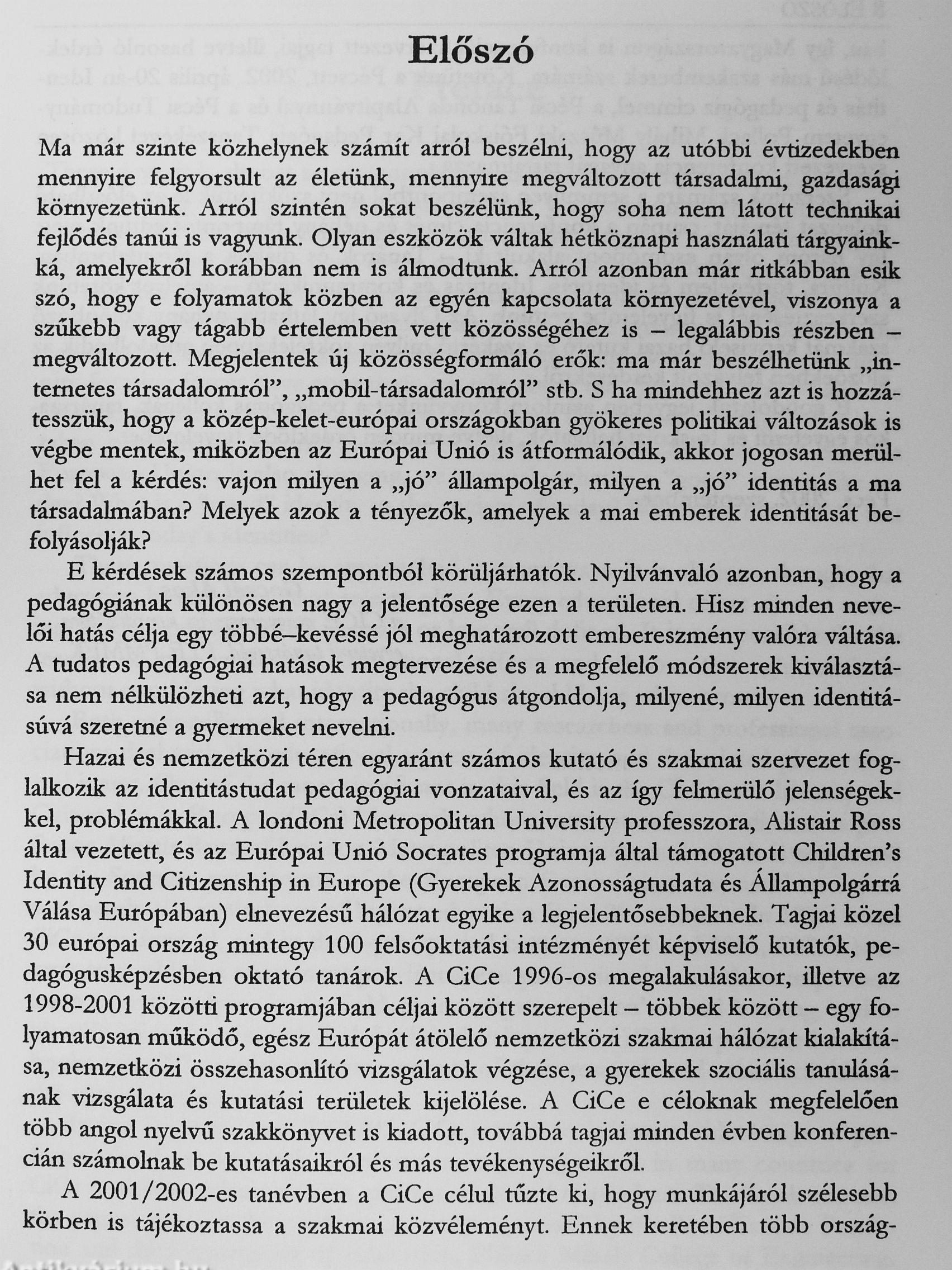 | Megjegyzés: | A kötet részben a 2002. április 20-án, Pécsett tartott "Identitás és pedagógia" című CICE-szeminárium anyaga. |