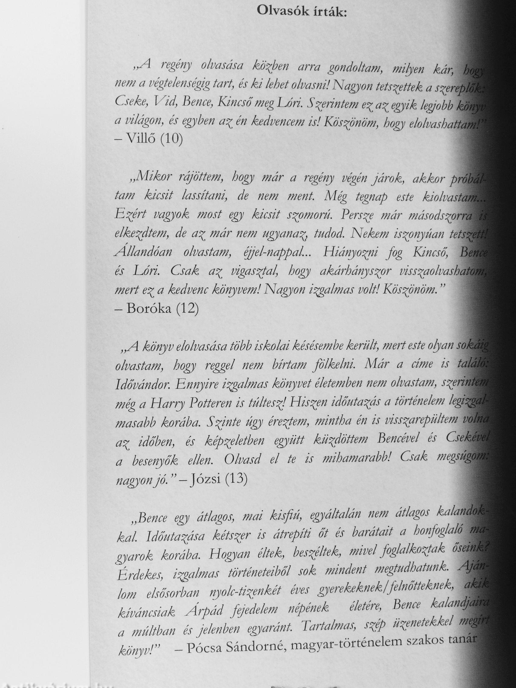 yv elolvasása több iskolai késésembe került, mert este olyan sok olvastam, hogy reggel nem bírtam fölkelni. Már a címe is találk Idővándor. Ennyire irgalmas könyvet életemben nem olvastam, szerinti még a Harry Potteren is túltesz} Hiszen időutazás a történelem legizga masabb korába. Szinte úgy éretem, mintha én is visszarepültem volm az időben, és képzeletben egmtt küzdöttem Bencével és Csekém a besenyők ellen. Olvasd el te is mihamarabb! Csak megs o nagyon jó. " — Józsi (13)