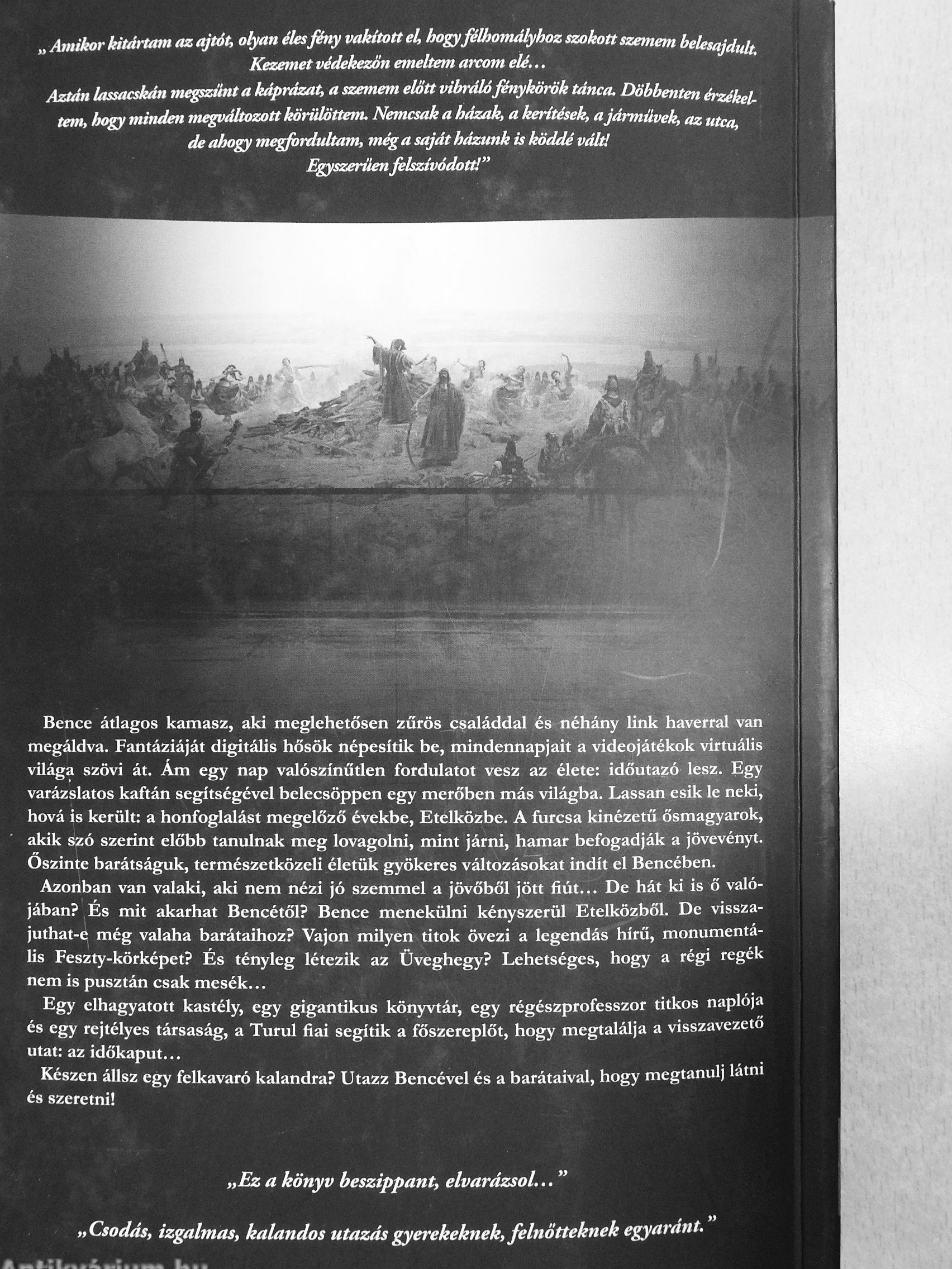 „Bence eg)i átlagos, mai kisfiú, egyáltalán nem átlagos kalandok kai Időutazása kétszer is átrepíti őt és barátait a honfoglalt ?j\ gyarok korába. Hogyan éltek, beszéltek, mivel foglalkoztak őseink Érdekes, izgalmas történeteiből sok mindent megtudhatunk. AjmA lom elsősorban nyolc-tízenkét éves gyerekeknekifelnőtteknek, ak kíváncsiak Árpád fejedelem népének életére, Bence kalandjaim a múltban és jelenben egyaránt. Tartalmas, szép üzenetekkel megn <>'" — Pócsa Sándorné, magyar-tcirténelem szakos tanári