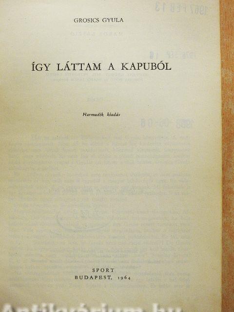 Nyolcvannyolc válogatott mérkőzés sok tízezer kilométeres utazásokkal fonódik össze. Grosics keresztül-kasul járta Európa országait, s sok minden látott, sokfajta néppel ismerkedett Afrika és Dél-Amerika országútjain. Válogatott viadalokon és nemzetközi klubmérkőzéseken sok-sok nagy küzdelem, nehezen kivívott győzelem, szép élmény részese s egyik főszereplője volt a könyv szerzője, akinek könnyed elbeszélő stílusa bizonyára leköt mindenkit, aki életében akár egyszer is, érdeklődéssel figyelte a kerek labda gurulását.