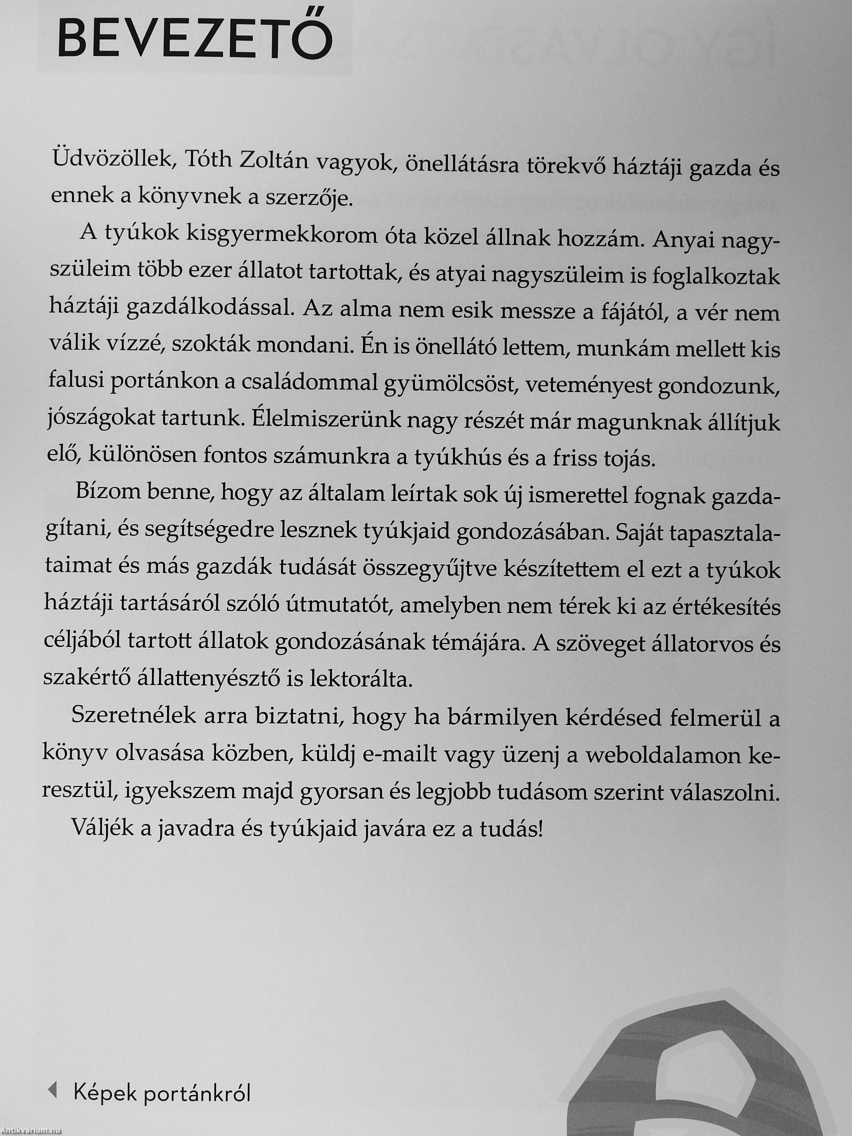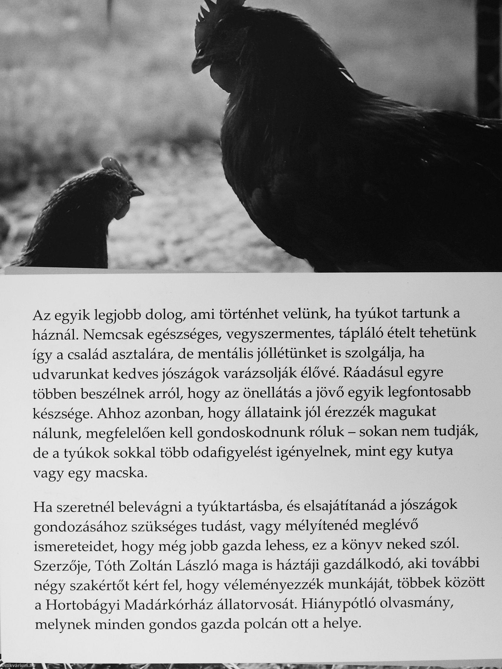 Ha szeretnél belevágni a tyúktartásba, és elsajátítanád a jószágok gondozásához szükséges tudást, vagy mélyítenéd meglévő ismereteidet, hogy még jobb gazda lehess, ez a könyv neked szól. Szerzője, Tóth Zoltán László maga is háztáji gazdálkodó, aki további négy szakértőt kért fel, hogy véleményezzék munkáját, többek között a Hortobágyi Madárkórház állatorvosát. Hiánypótló olvasmány, melynek minden gondos gazda polcán ott a helye.