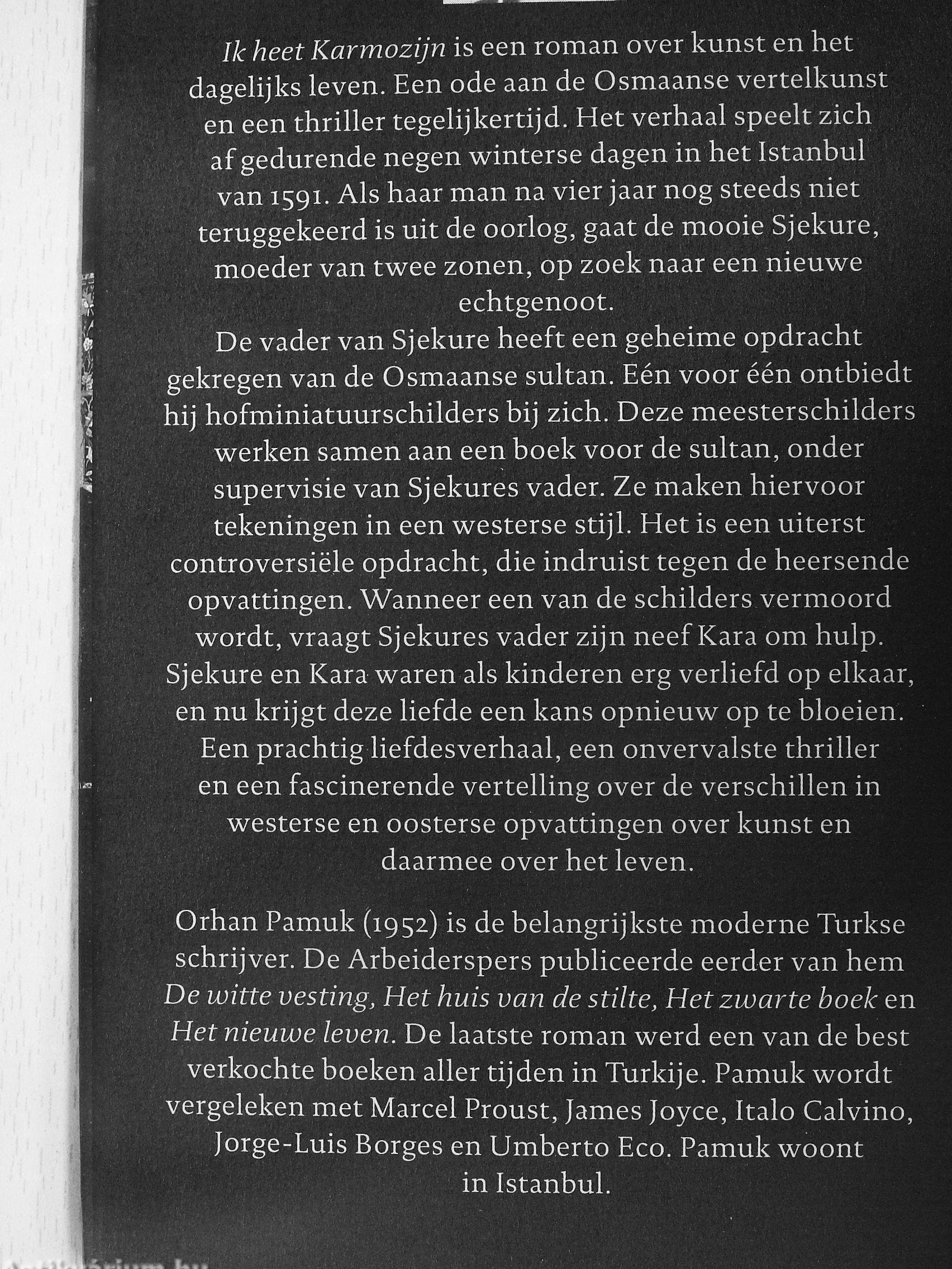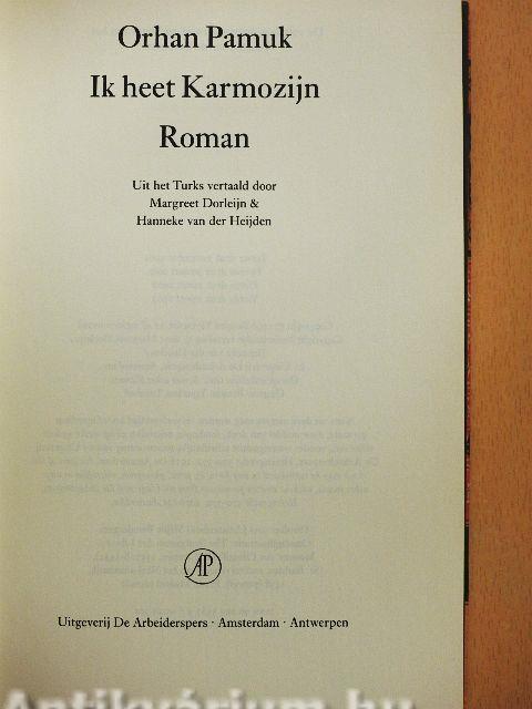 Ik heet Karmozijn is een roman over kunst en het dagelijks leven. Een ode aan de Osmaanse vertelkunst en een thriller tegelijkertijd. Het verhaal speelt zieh af gedurende negen winterse dagen in het Istanbul van 1591. Als haar man na vier jaar nog steeds niet teruggekeerd is uit de oorlog, gaat de mooie Sjekure, moeder van twee zonen, op zoek naar een nieuwe echtgenoot.