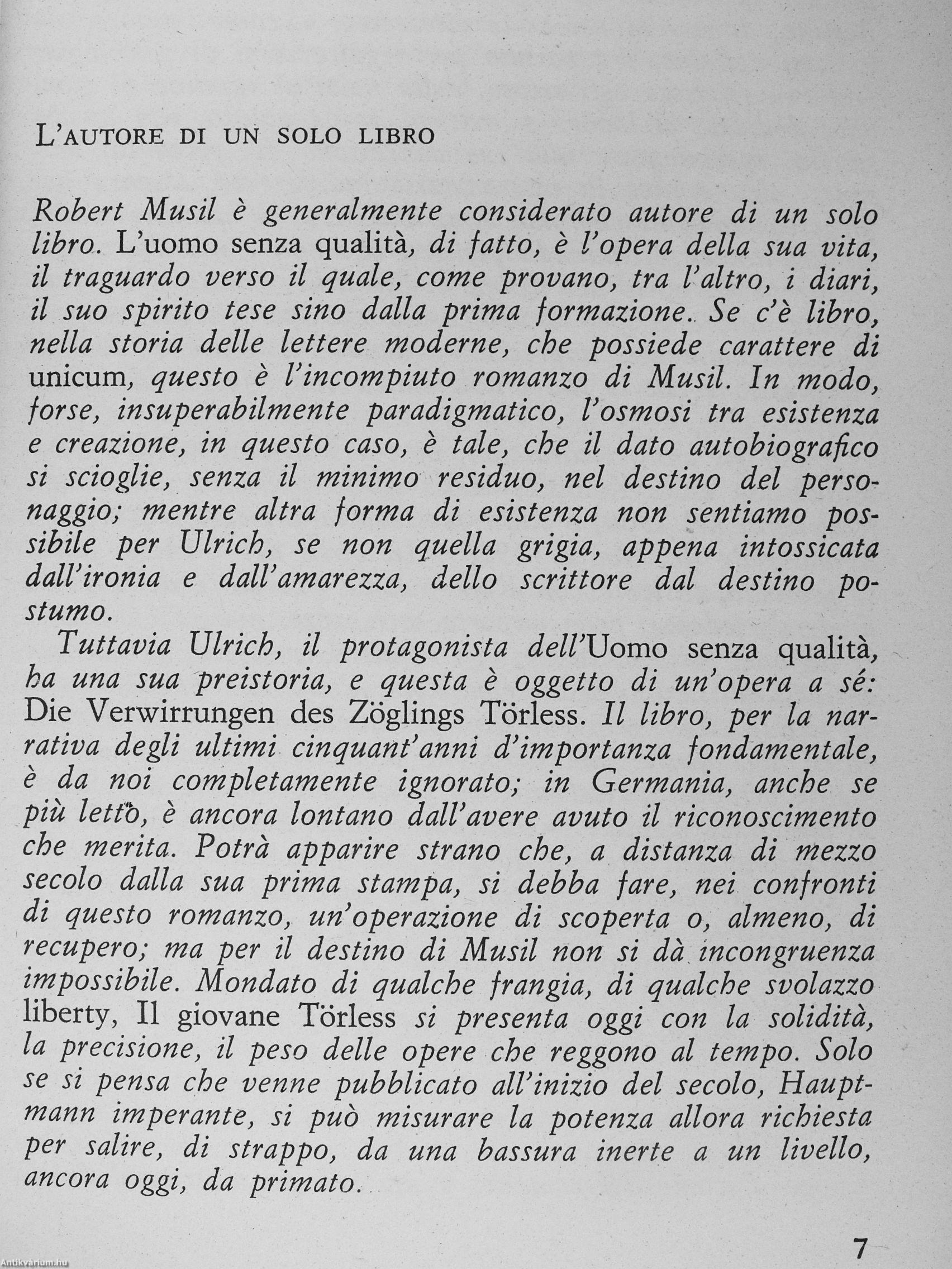 Robert Musil (Klagenfurt 1880 - Ginevra 1942), si laureó in ingegneria e in filosofía. Considerato uno dei massimi roman-zieri del Novecento, é autore di racconti, opere teatrali e ro-manzi. Ha pubblicato il primo volume della sua opera princi-pale, «L'uomo senza qualitá», nel 1931, e il secondo nel 1933. II terzo volume, incompiuto, apparve postumo nel 1943. Vissza