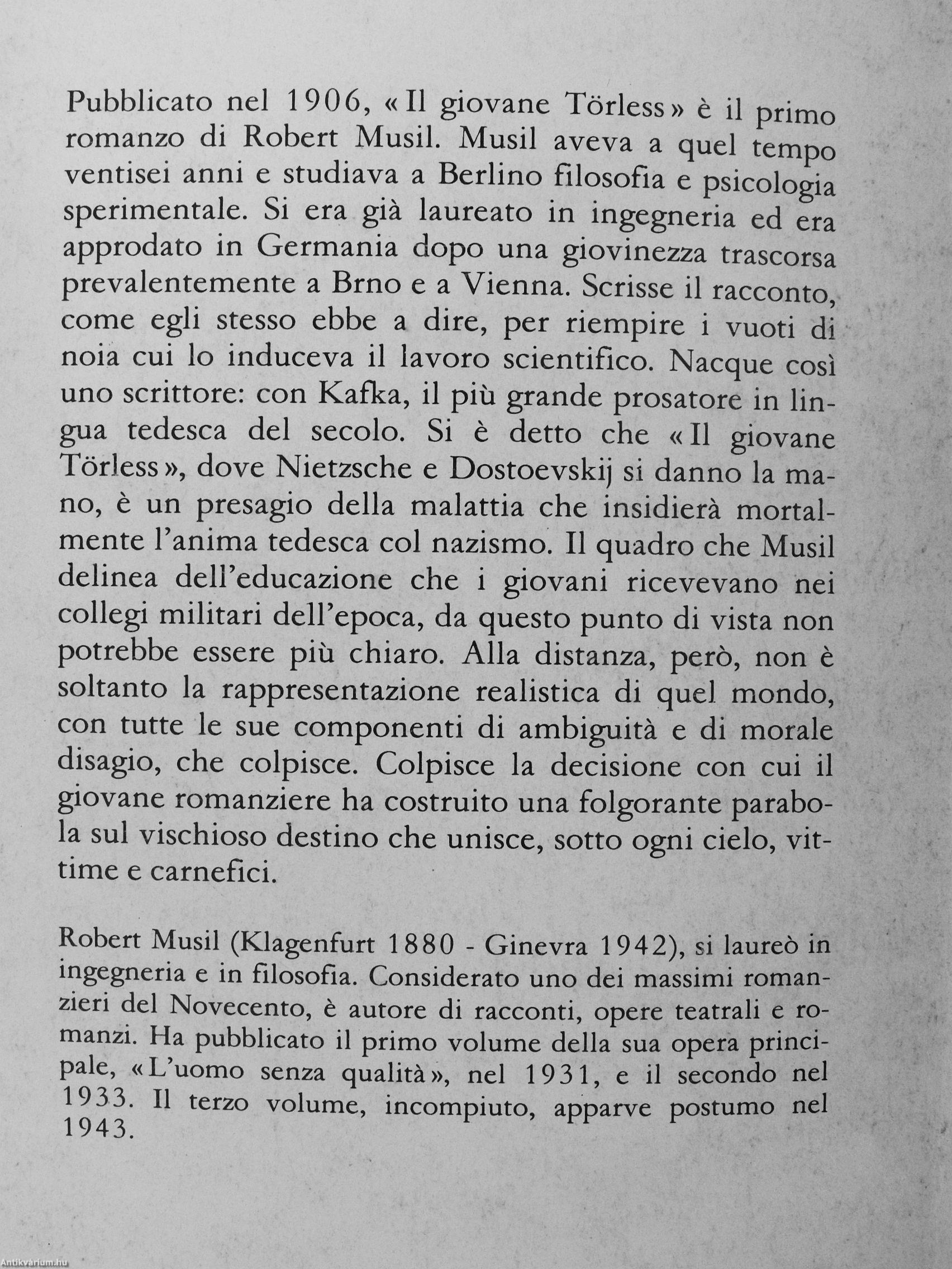 Pubblicato nel 1906, «II giovane Törless» é il primo romanzo di Robert Musil. Musil aveva a quel tempo ventisei anni e studiava a Berlino filosofía e psicología sperimentale. Si era giá laureato in ingegneria ed era approdato in Germania dopo una giovinezza trascorsa prevalentemente a Brno e a Vienna. Scrisse il racconto, come egli stesso ebbe a dire, per riempire i vuoti di noia cui lo induceva il lavoro scientifico. Nacque cosi uno scrittore: con Kafka, il piü grande prosatore in lingua tedesca del secolo. Si é detto che «II giovane Törless», dove Nietzsche e Dostoevskij si danno la mano, é un presagio della malattia che insidierá mortal-mente l'anima tedesca col nazismo. II quadro che Musil delinea dell'educazione che i giovani ricevevano nei collegi militari dell'epoca, da questo punto di vista non potrebbe essere piü chiaro. Alla distanza, pero, non é soltanto la rappresentazione realística di quel mondo, con tutte le sue componenti di ambiguitá e di morale disagio, che colpisce. Colpisce la decisione con cui il giovane romanziere ha costruito una folgorante parabola sul vischioso destino che unisce, sotto ogni cielo, vit-time e carnefici.