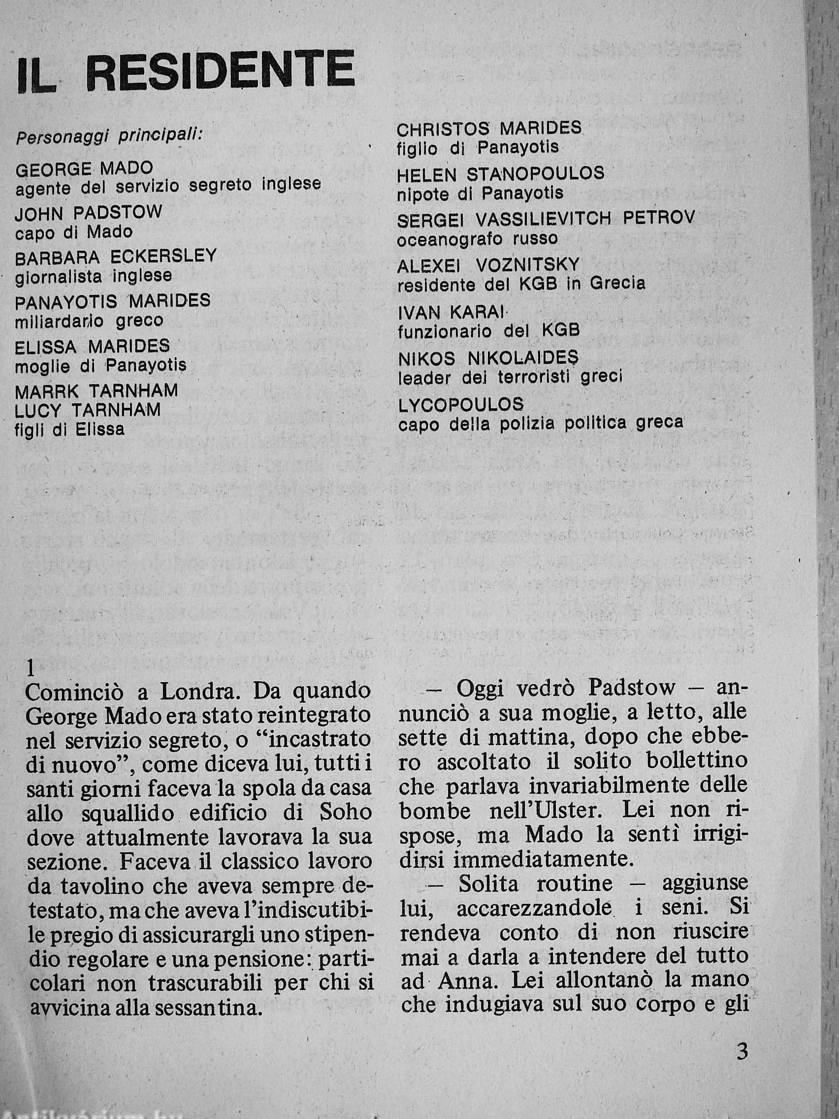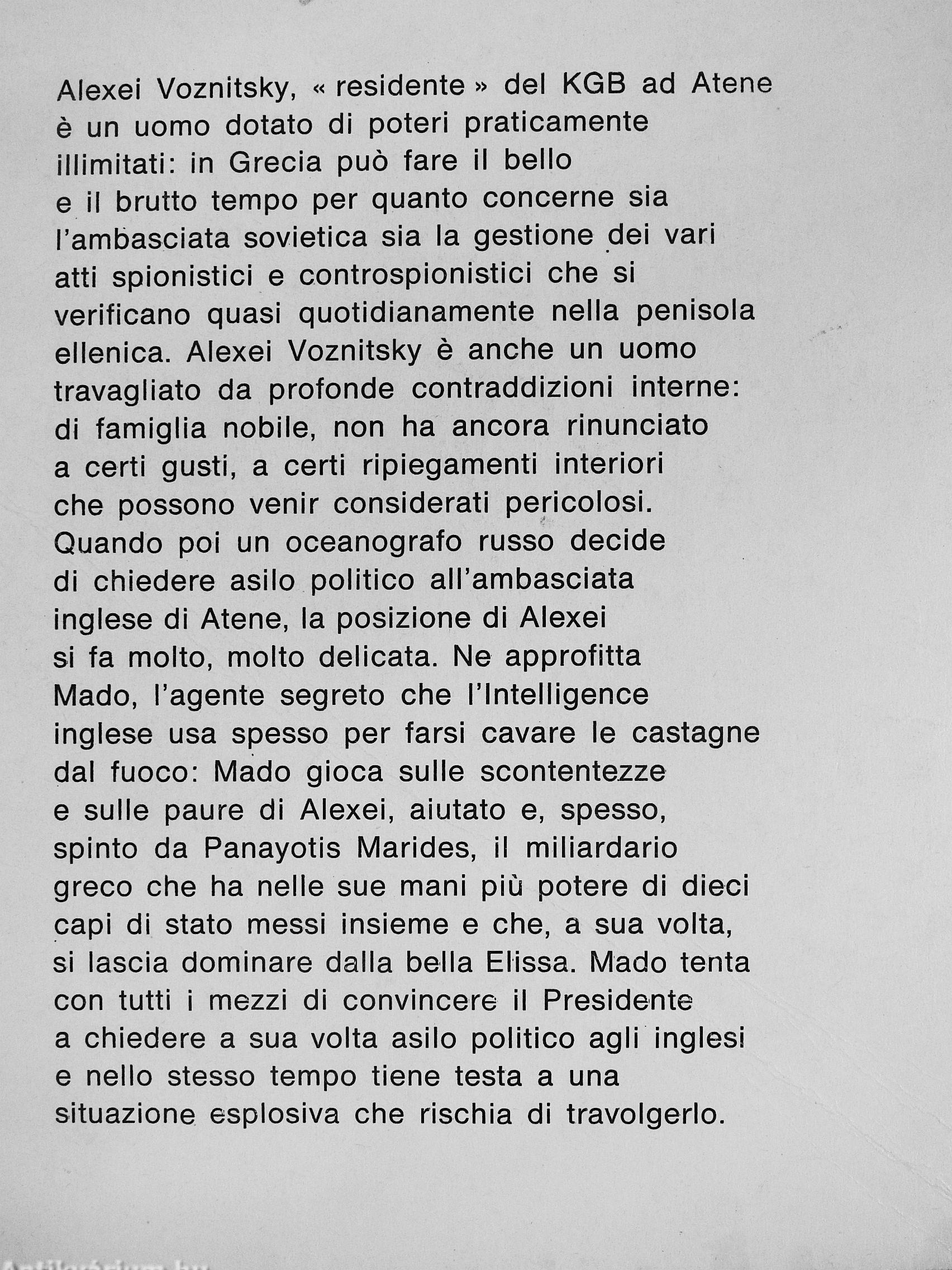 Alexei Voznitsky, « residente » del KGB ad Atene e un uomo dotato di poteri praticamente illimitati: in Grecia puó fare il bello e il brutto tempo per quanto concerne sia l'ambasciata soviética sia la gestione del vari atti spionistici e controspionistici che si verificano quasi quotidianamente nella penisola ellenica. Alexei Voznitsky e anche un uomo travagliato da profonde contraddizioni interne: di famiglia nobile, non ha ancora rinunciato a certi gusti, a certi ripiegamenti interior! che possono venir considerati pericolosi. Quando poi un oceanografo russo decide di chiedere asilo politico aü'ambasciata inglese di Atene, la posizione di Alexei si fa molto, molto delicata. Ne approfitta Mado, l'agente segreto che l'Intelligence inglese usa spesso per farsi cavare le castagne dal fuoco: Mado gioca sulle scontentezze e sulle paure di Alexei, aiutato e, spesso, spinto da Panayotis Marides, il miliardario greco che ha nelle sue mani piCi potere di died capi di stato messi insieme e... Tovább