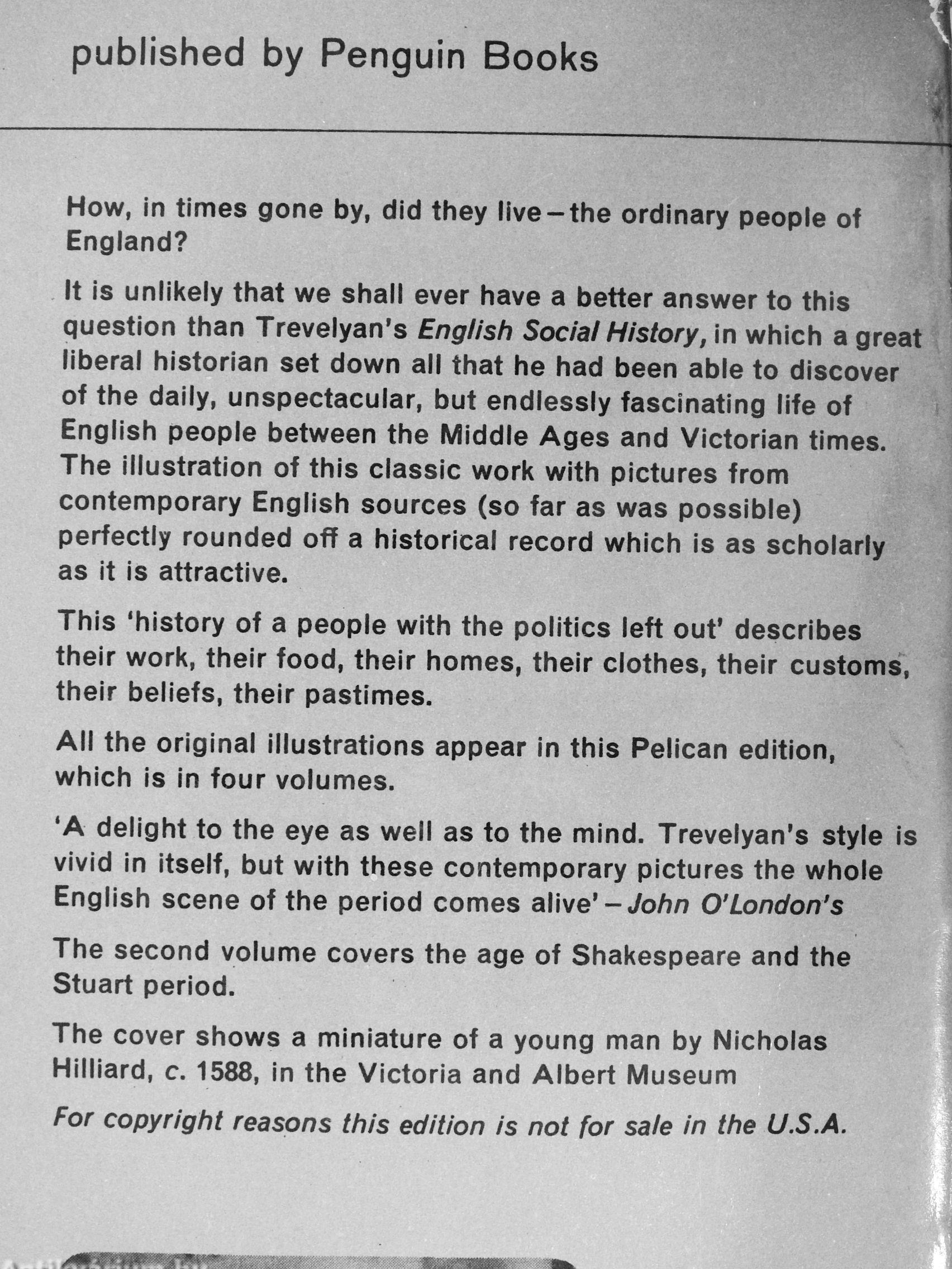 It Is unlikely that we shall ever have a better answer to this question than Trevelyan's English Social History, in which a great liberal historian set down all that he had been able to discover of the daily, unspectacular, but endlessly fascinating life of English people between the Middle Ages and Victorian times. The illustration of this classic work with pictures from contemporary English sources (so far as was possible) perfectly rounded off a historical record which Is as scholarly as It is attractive.