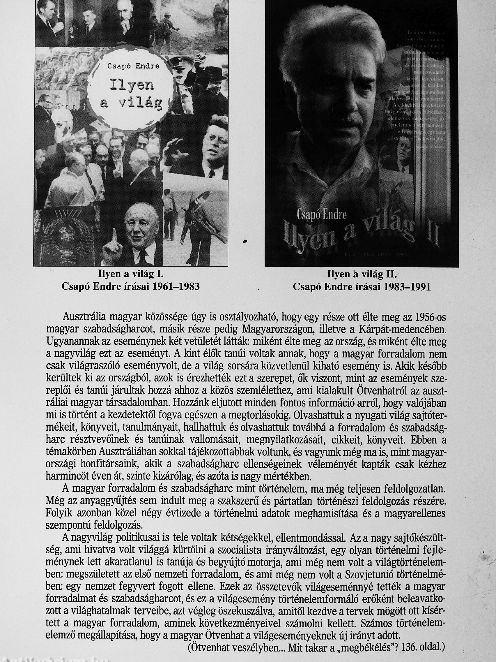 Ausztrália magyar közössége úgy is osztályozható, hogy egy része ott élte meg az 1956-os magyar szabadságharcot, másik része pedig Magyarországon, illetve a Kárpát-medencében. Ugyanannak az eseménynek két vetületét látták: miként élte meg az ország, és miként élte meg a nagyvilág ezt az eseményt. A kint élők tanúi voltak annak, hogy a magyar forradalom nem csak világraszóló eseményvolt, de a világ sorsára közvetlenül kiható esemény is. Akik késólib kerültek ki az országból, azok is érezhették ezt a szerepet, ők viszont, mint az események szereplői és tanúi járultak hozzá ahhoz a közös szemlélethez, ami kialaMt Ötvenhatról az ausztráliai magyar társadalomban. Hozzánk eljutott minden fontos információ arról, hogy valójában mi is történt a kezdetektől fogva egészen a megtorlásokig. Olvashattuk a nyugati világ sajtótermékeit, könyveit, tanuhnányait, hallhattuk és olvashattuk továbbá a forradalom és szabadság-h^c résztvevőinek és tanúinak vallomásait, megnyilatkozásait, cikkeit, könyveit. Ebben a témakörben Ausztráliában sokkal tájékozottabbak voltunk, és vagjóink még ma is, mint magyarországi honfitársaink, akik a szabadságharc ellenségeinek véleményét kapták csak kézhez harmincöt éven át, szinte kizárólag, és azóta is nagy mértékben.