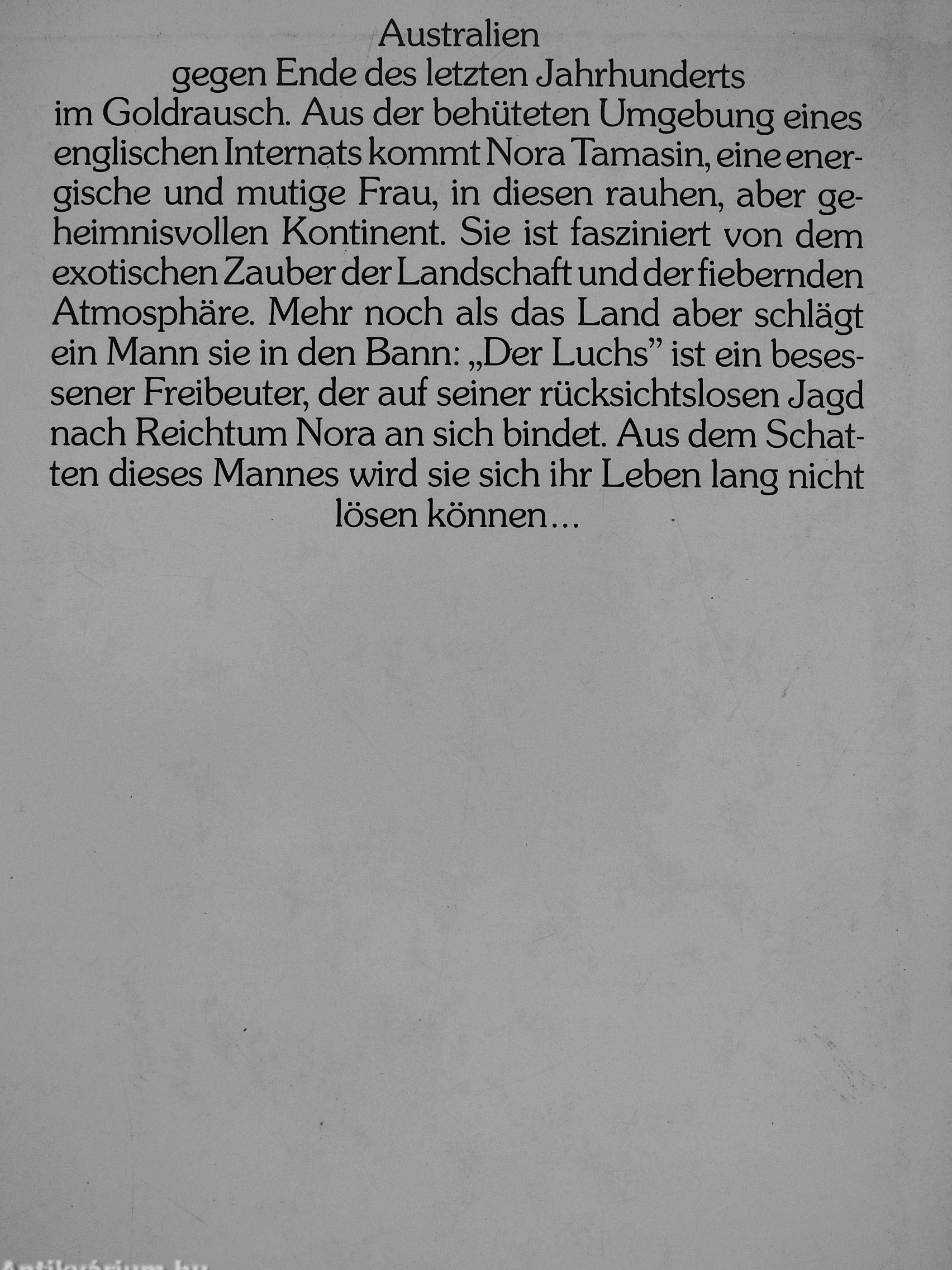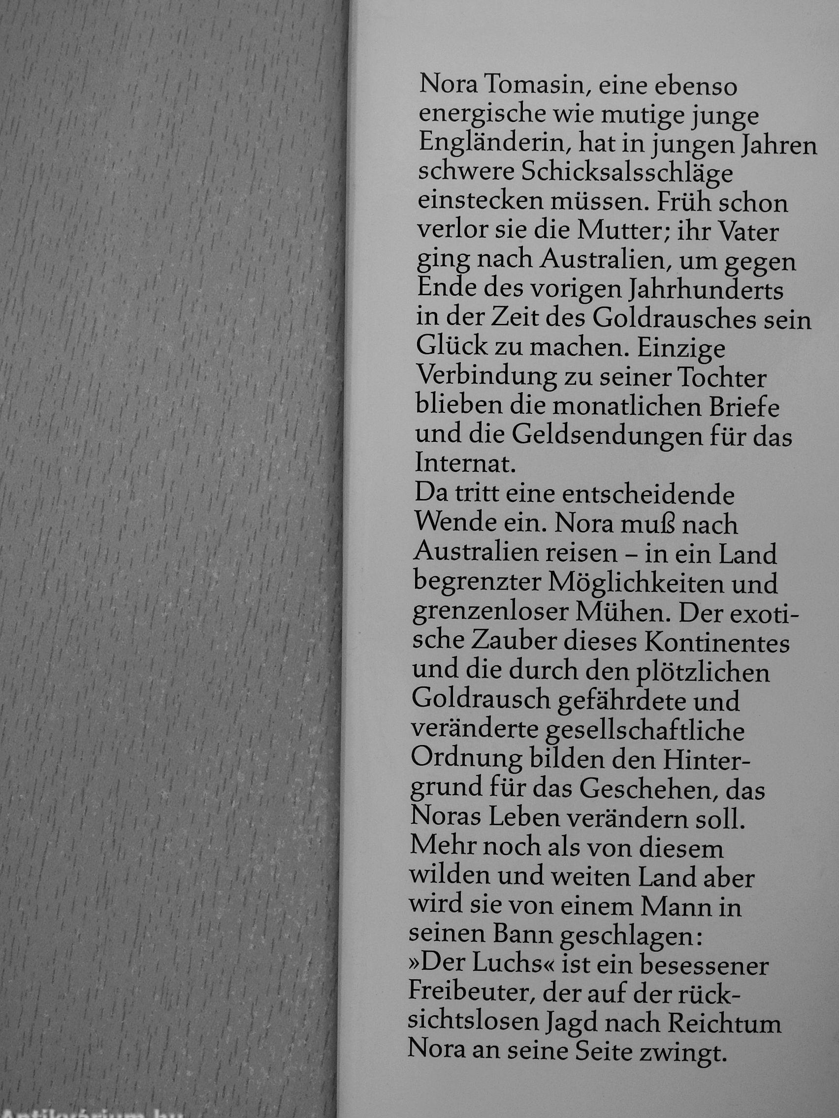 Da tritt eine entscheidende Wende ein. Nora muß nach Australien reisen - in ein Land begrenzter Möglichkeiten und grenzenloser Mühen. Der exotische Zauber dieses Kontinentes und die durch den plötzlichen Goldrausch gefährdete und veränderte gesellschaftliche Ordnung bilden den Hintergrund für das Geschehen, das Noras Leben verändern soll. Mehr noch als von diesem wilden und weiten Land aber wird sie von einem Mann in seinen Bann geschlagen: »Der Luchs« ist ein besessener Freibeuter, der auf der rücksichtslosen Jagd nach Reichtum Nora an seine Seite zwingt.