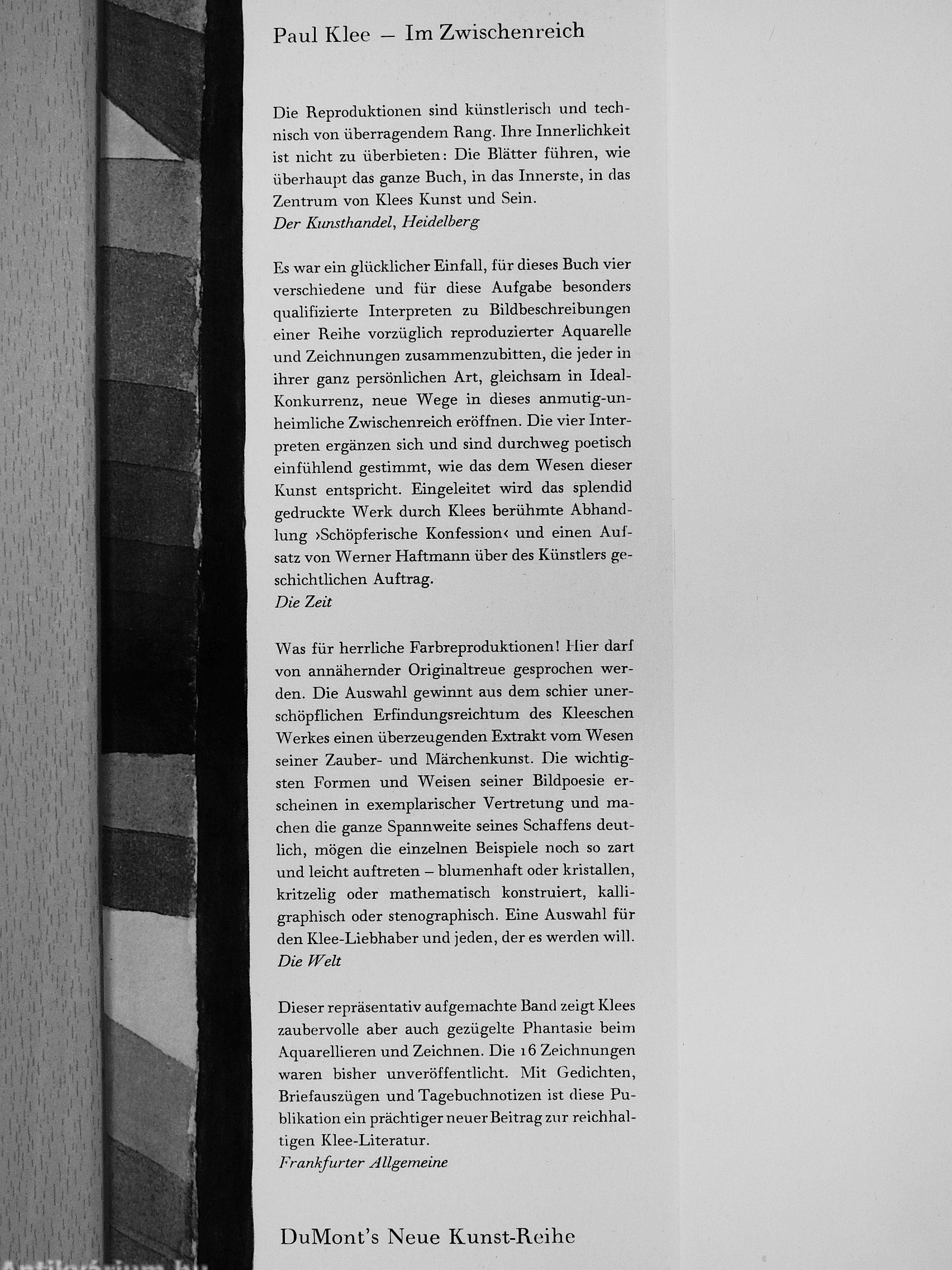 Die Reproduktionen sind künstlerisch und technisch von überragendem Rang. Ihre Innerlichkeit ist nicht zu überbieten: Die Blätter führen, wie überhaupt das ganze Buch, in das Innerste, in das Zentrum von Klees Kunst und Sein. Der Kimsthandel, Heidelberg