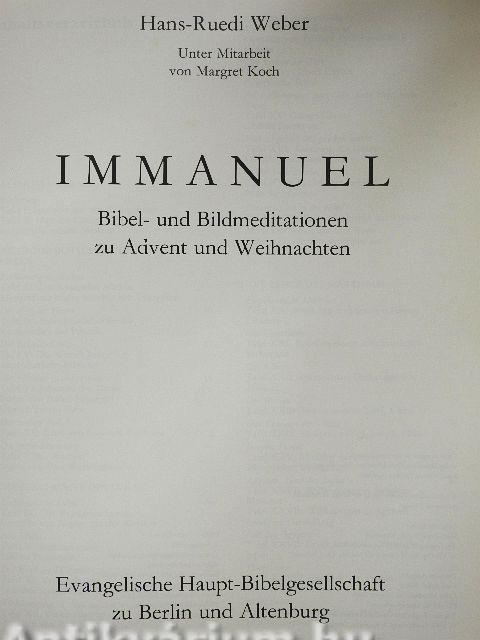 Hans-Ruedi Weber e könyvét teljes egészében az adventnek és a karácsonynak szentelte. Az Isten eljöveteléről szóló üzenet összekapcsolódik Immánuel nevével, mely név azt jelenti, hogy "Velünk az Isten". A meditációk követik az egyes evangéliumok vallomásait, melyek többféleképpen fejezik ki ezt az üzenetet. Mátyás és Lukács evangéliumának ismert születés- és gyermekkortörténetei mellett Márk és János bevezető fejezeteit is olvashatjuk e könyvben. A bibliai meditációkat és evangéliumi szövegeket különféle kultúrkörök sok évszázados képanyaga kíséri.