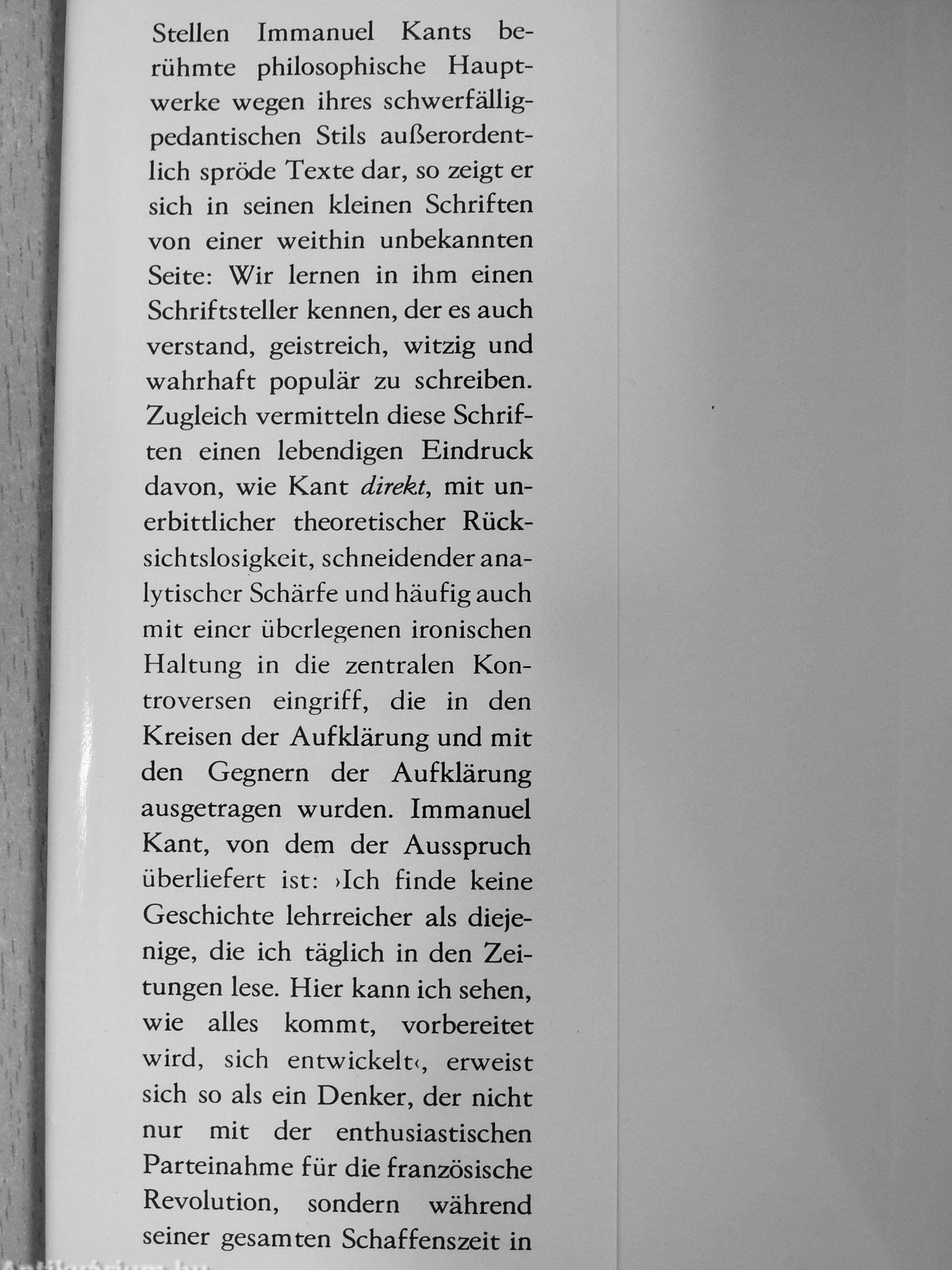 Stellen Immanuel Kants berühmte philosophische Hauptwerke wegen ihres schwerfälligpedantischen Stils außerordentlich spröde Texte dar, so zeigt er sich in seinen kleinen Schriften von einer weithin unbekannten Seite: Wir lernen in ihm einen Schriftsteller kennen, der es auch verstand, geistreich, witzig und wahrhaft populär zu schreiben. Zugleich vermitteln diese Schriften einen lebendigen Eindruck davon, wie Kant direkt, mit unerbittlicher theoretischer Rücksichtslosigkeit, schneidender analytischer Schärfe und häufig auch mit einer überlegenen ironischen Haltung in die zentralen Kontroversen eingriff, die in den Kreisen der Aufklärung und mit den Gegnern der Aufklärung ausgetragen wurden. Immanuel Kant, von dem der Ausspruch überliefert ist: )Ich finde keine Geschichte lehrreicher als diejenige, die ich täglich in den Zeitungen lese. Hier kann ich sehen, wie alles kommt, vorbereitet wird, sich entwickelt(, erweist sich so als ein Denker, der nicht nur mit der enthusiastischen Parteinahme für die französische Revolution, sondern während seiner gesamten Schaffenszeit in