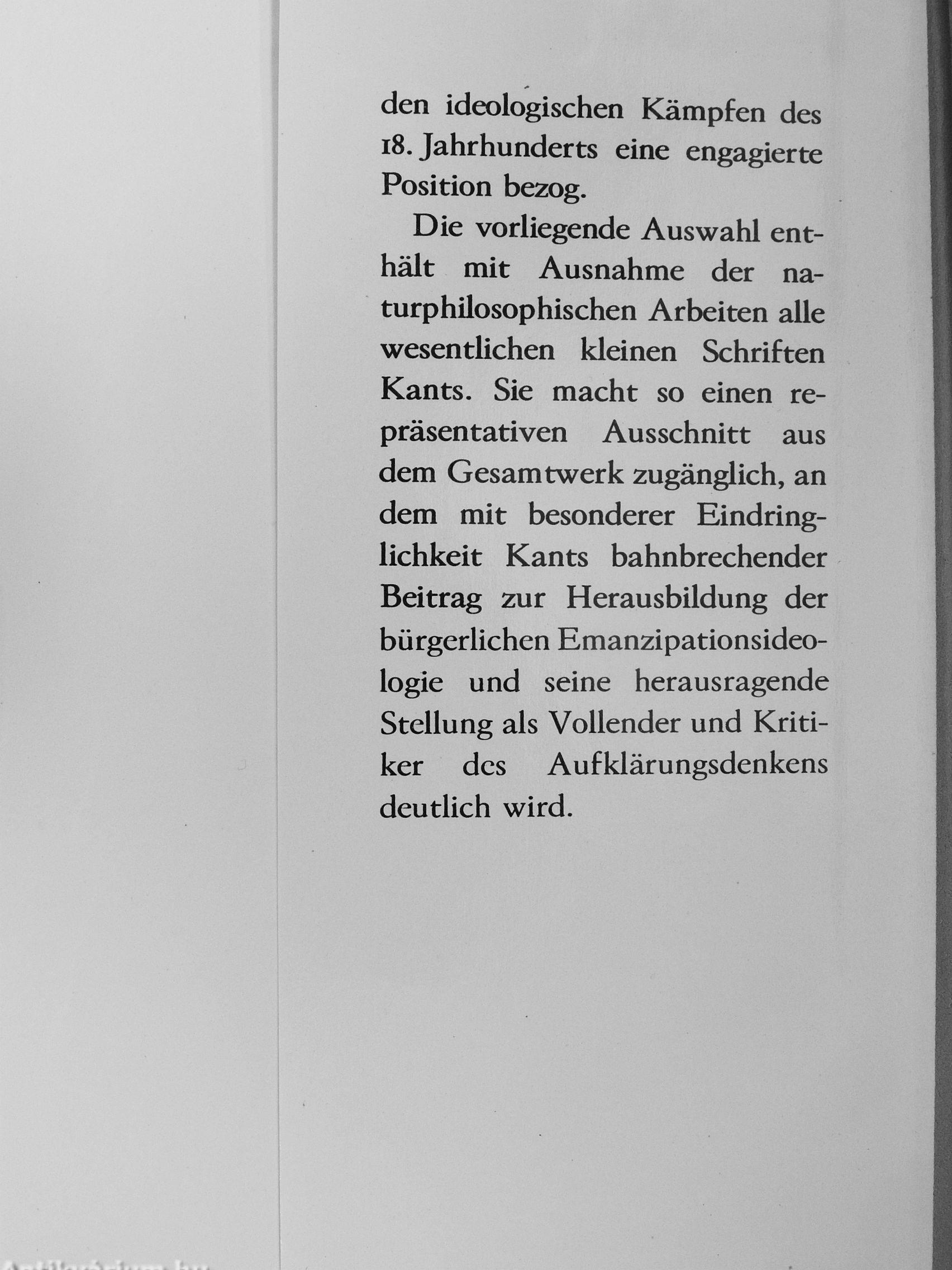 Die vorliegende Auswahl enthält mit Ausnahme der naturphilosophischen Arbeiten alle wesentlichen kleinen Schriften Kants. Sie macht so einen repräsentativen Ausschnitt aus dem Gesamtwerk zugänglich, an dem mit besonderer Eindringlichkeit Kants bahnbrechender Beitrag zur Herausbildung der bürgerlichen Emanzipationsideologie und seine herausragende Stellung als Vollender und Kritiker des Aufklärungsdenkens deutlich wird.
