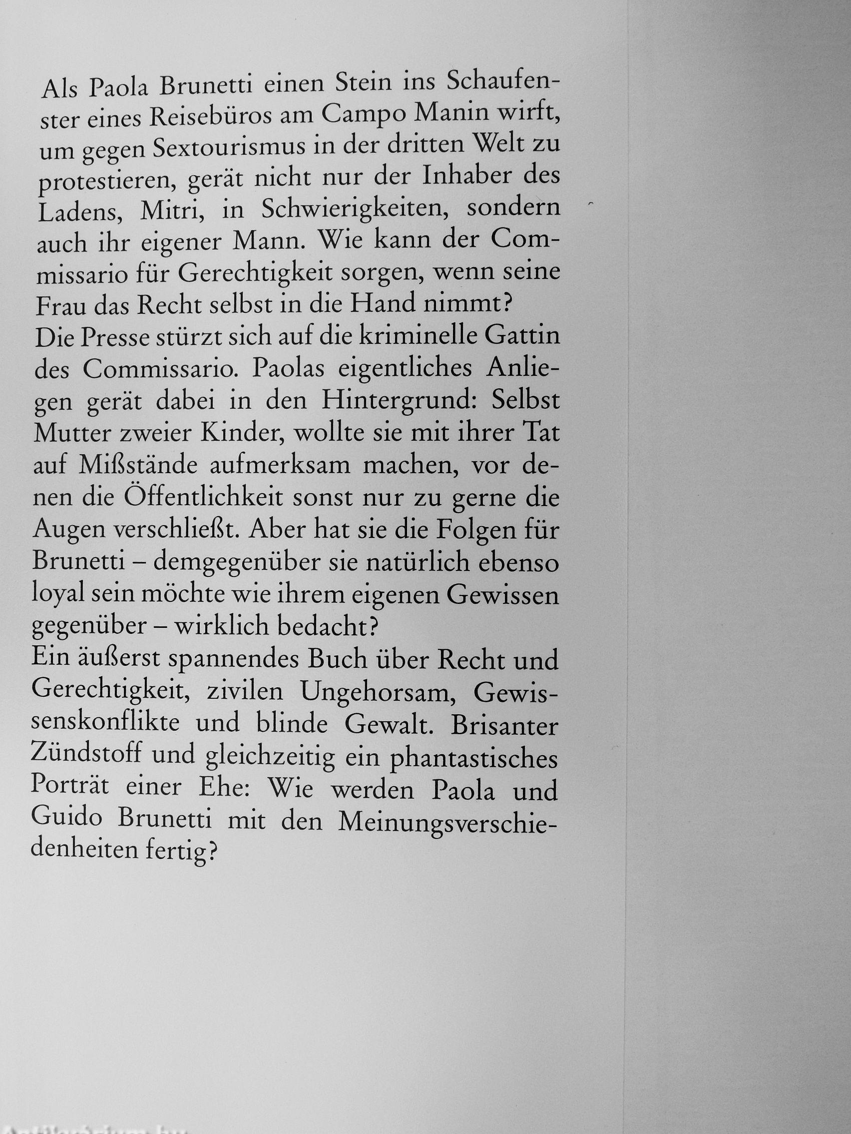 Als Paola Brunetti einen Stein ins Schaufenster eines Reisebüros am Campo Manin wirft, um gegen Sextourismus in der dritten Welt zu protestieren, gerät nicht nur der Inhaber des Ladens, Mitri, in Schwierigkeiten, sondern auch ihr eigener Mann. Wie kann der Com-missario für Gerechtigkeit sorgen, wenn seine Frau das Recht selbst in die Hand nimmt? Die Presse stürzt sich auf die kriminelle Gattin des Commissario. Paolas eigentliches Anliegen gerät dabei in den Hintergrund: Selbst Mutter zweier Kinder, wollte sie mit ihrer Tat auf Mißstände aufmerksam machen, vor denen die Öffentlichkeit sonst nur zu gerne die Augen verschließt. Aber hat sie die Folgen für Brunetti - demgegenüber sie natürlich ebenso loyal sein möchte wie ihrem eigenen Gewissen gegenüber - wirklich bedacht? Ein äußerst spannendes Buch über Recht und Gerechtigkeit, zivilen Ungehorsam, Gewissenskonflikte und blinde Gewalt. Brisanter Zündstoff und gleichzeitig ein phantastisches Porträt einer Ehe: Wie werden Paola und Guido Brunetti mit den Meinungsverschiedenheiten fertig?