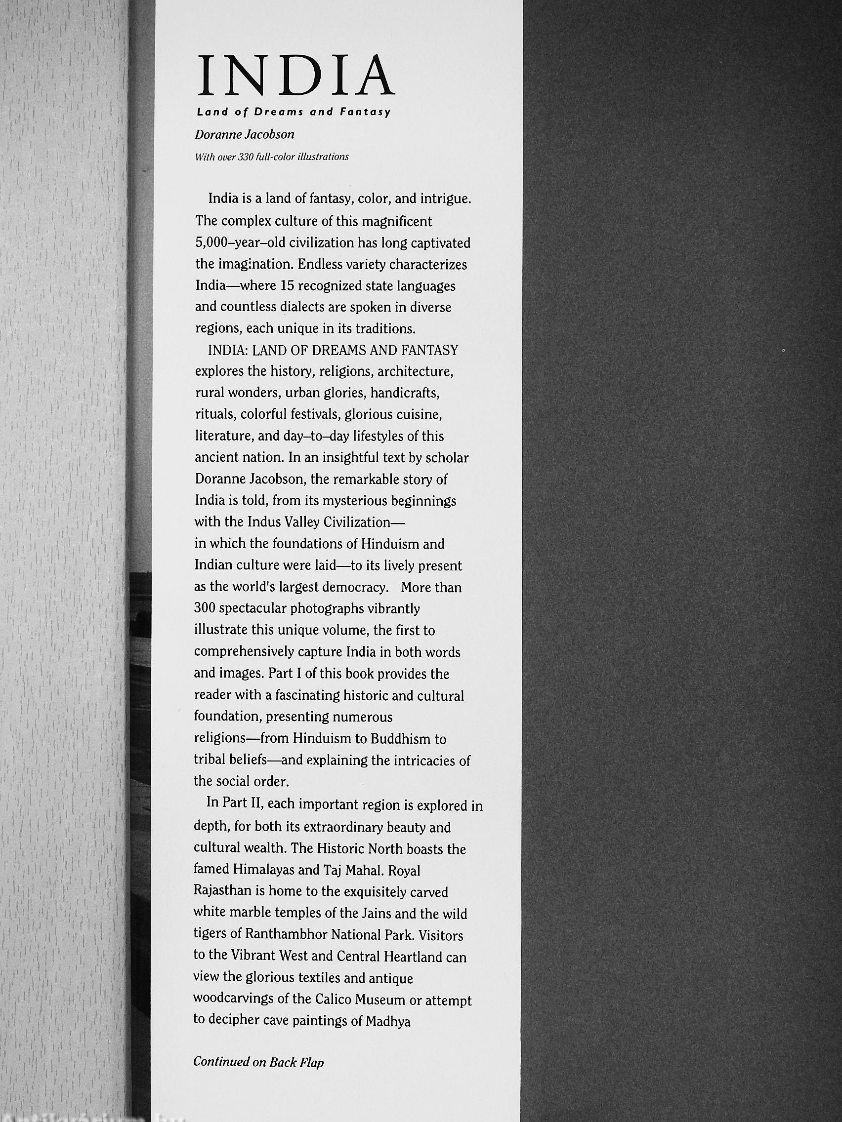 INDIA; LAND OF DREAMS AND FANTASY explores the history, religions, architecture, rural wonders, urban glories, handicrafts, rituals, colorful festivals, glorious cuisine, literature, and day-to-day lifestyles of this ancient nation. In an insightful text by scholar Doranne Jacobson, the remarkable story of India is told, from its mysterious beginnings with the Indus Valley Civilization— in which the foundations of Hinduism and Indian culture were laid—to its lively present as the world's largest democracy. More than 300 spectacular photographs vibrantly illustrate this unique volume, the first to comprehensively capture India in both words and images. Part I of this book provides the reader with a fascinating historic and cultural foundation, presenting numerous religions—from Hinduism to Buddhism to tribal beliefs—and explaining the intricacies of the social order.