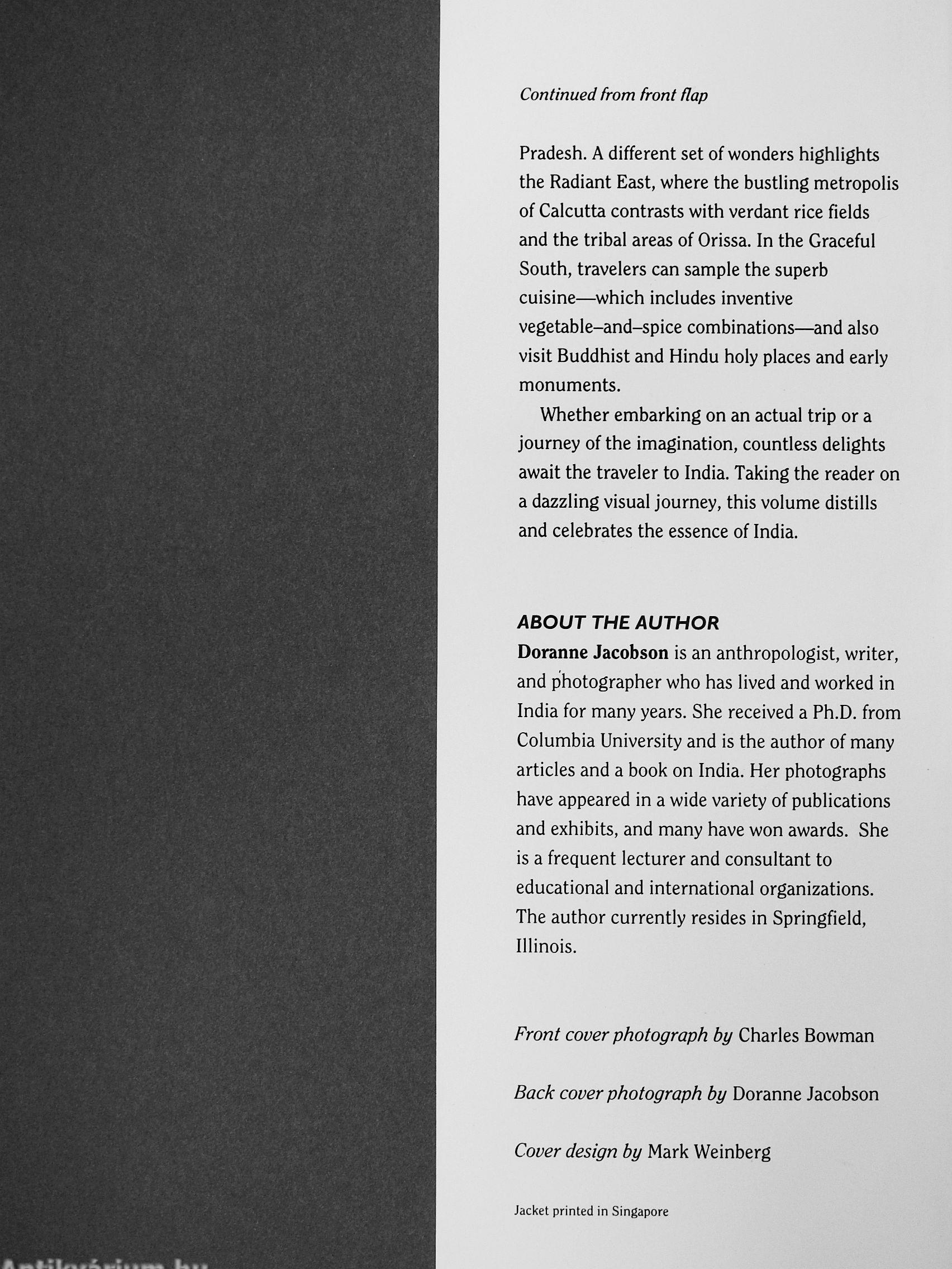 ABOUT THE AUTHOR Doranne Jacobson is an anthropologist, writer, and photographer who has lived and worked in India for many years. She received a Ph.D. from Columbia University and is the author of many articles and a book on India. Her photographs have appeared in a wide variety of publications and exhibits, and many have won awards. She is a frequent lecturer and consultant to educational and international organizations. The author currently resides in Springfield, Illinois.