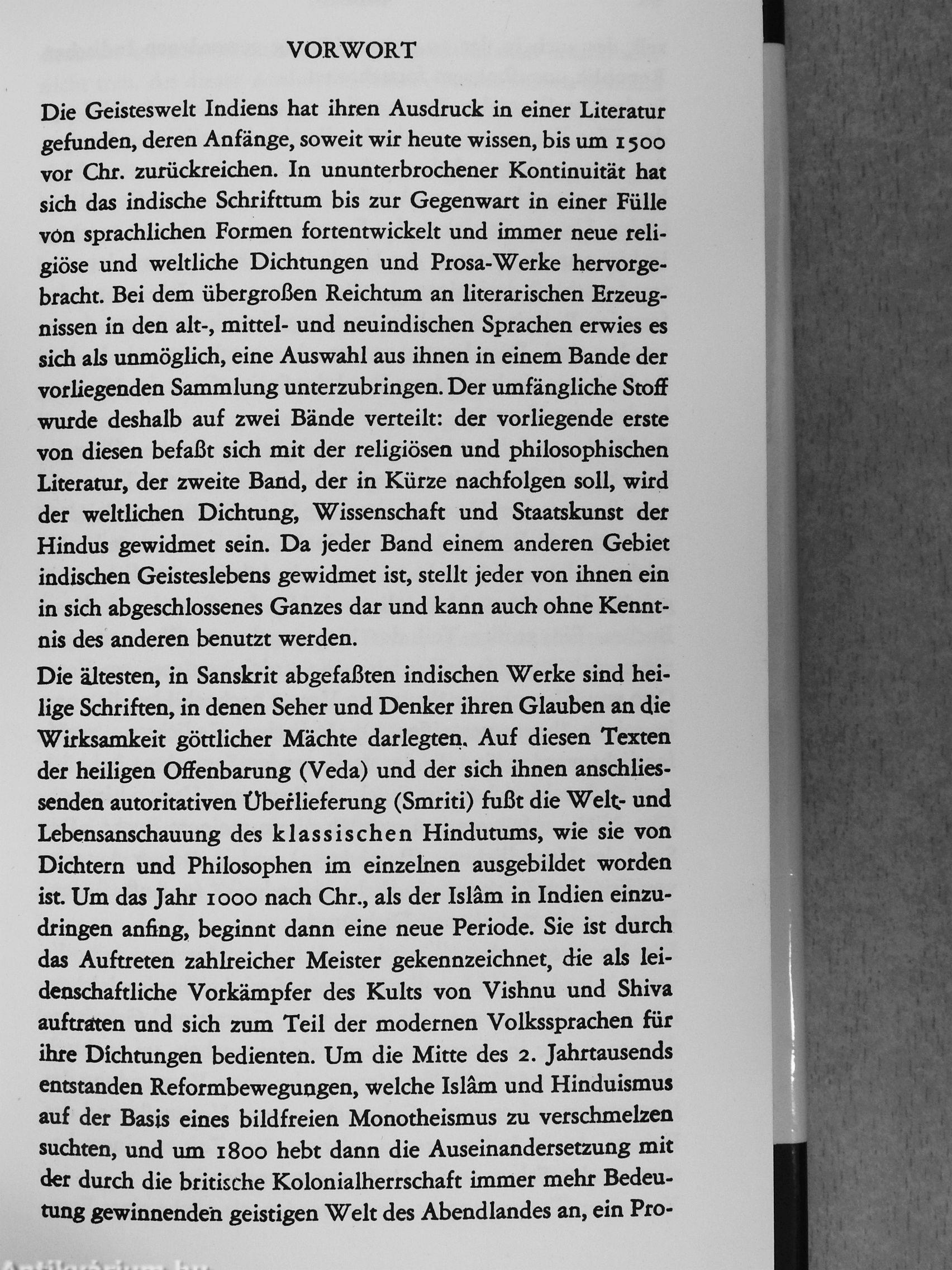 Auf den ältesten Schriften der Veda, der heiligen Offenbarung, fußt die Wek- und Lebensanschauung des klassischen Hinduismus, (Veda, Brahmana-Texte, Upanishaden, Mahabharata, Ramayana, Puranas, TantrasV Um 1000 nach Chr., als der Islam nach Indien einzudringen anfing, begann eine neue Periode mit dem Vishnu-und Shiva-Glauben (Krishna-My-stik, Rama-Kult u.a.) und mit Beginn des 19. Jhs. hebt dann die Auseinandersetzung mit der (durch die britische Kolonialherrschaft ins Land gebrachten) geistigen Welt des Abendlandes an. Bekannt sind Mahatma Gandhi, Rabindranath Thakur (Tagore) und Shri Aurobindo).