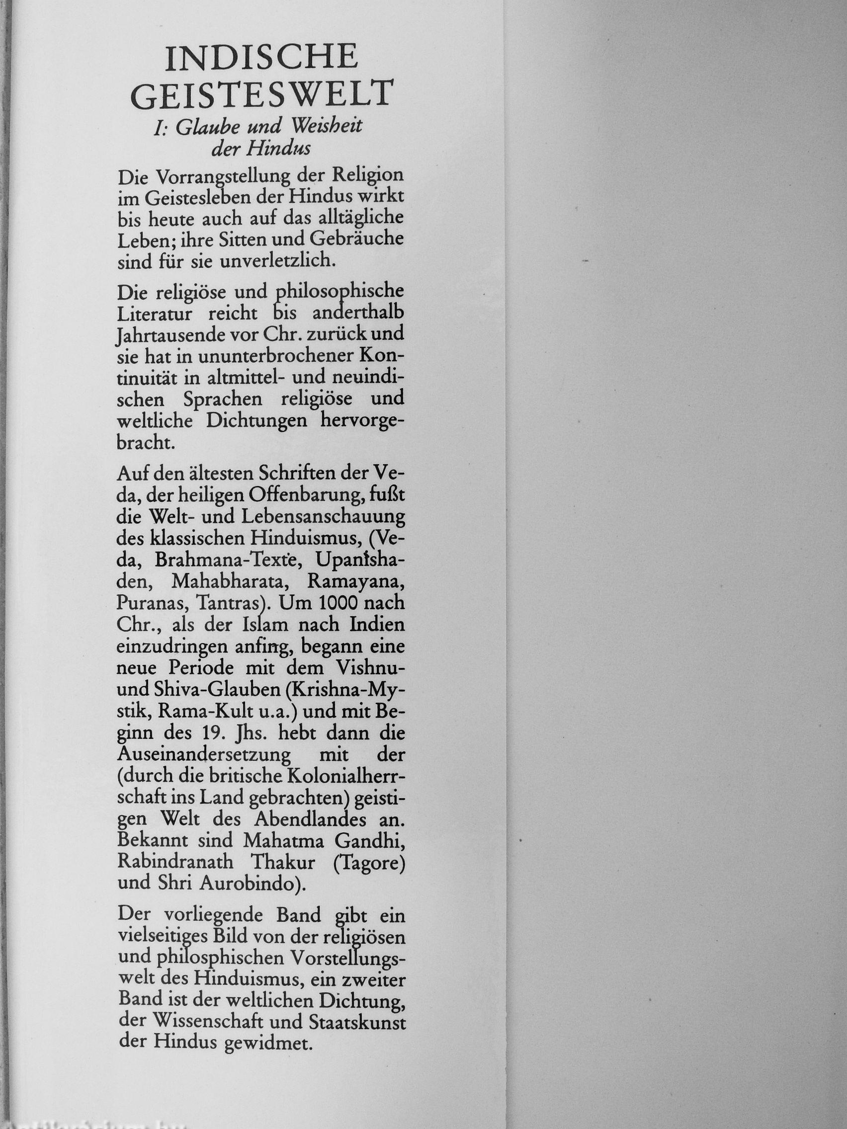 Auf den ältesten Schriften der Veda, der heiligen Offenbarung, fußt die Wek- und Lebensanschauung des klassischen Hinduismus, (Veda, Brahmana-Texte, Upanishaden, Mahabharata, Ramayana, Puranas, TantrasV Um 1000 nach Chr., als der Islam nach Indien einzudringen anfing, begann eine neue Periode mit dem Vishnu-und Shiva-Glauben (Krishna-My-stik, Rama-Kult u.a.) und mit Beginn des 19. Jhs. hebt dann die Auseinandersetzung mit der (durch die britische Kolonialherrschaft ins Land gebrachten) geistigen Welt des Abendlandes an. Bekannt sind Mahatma...