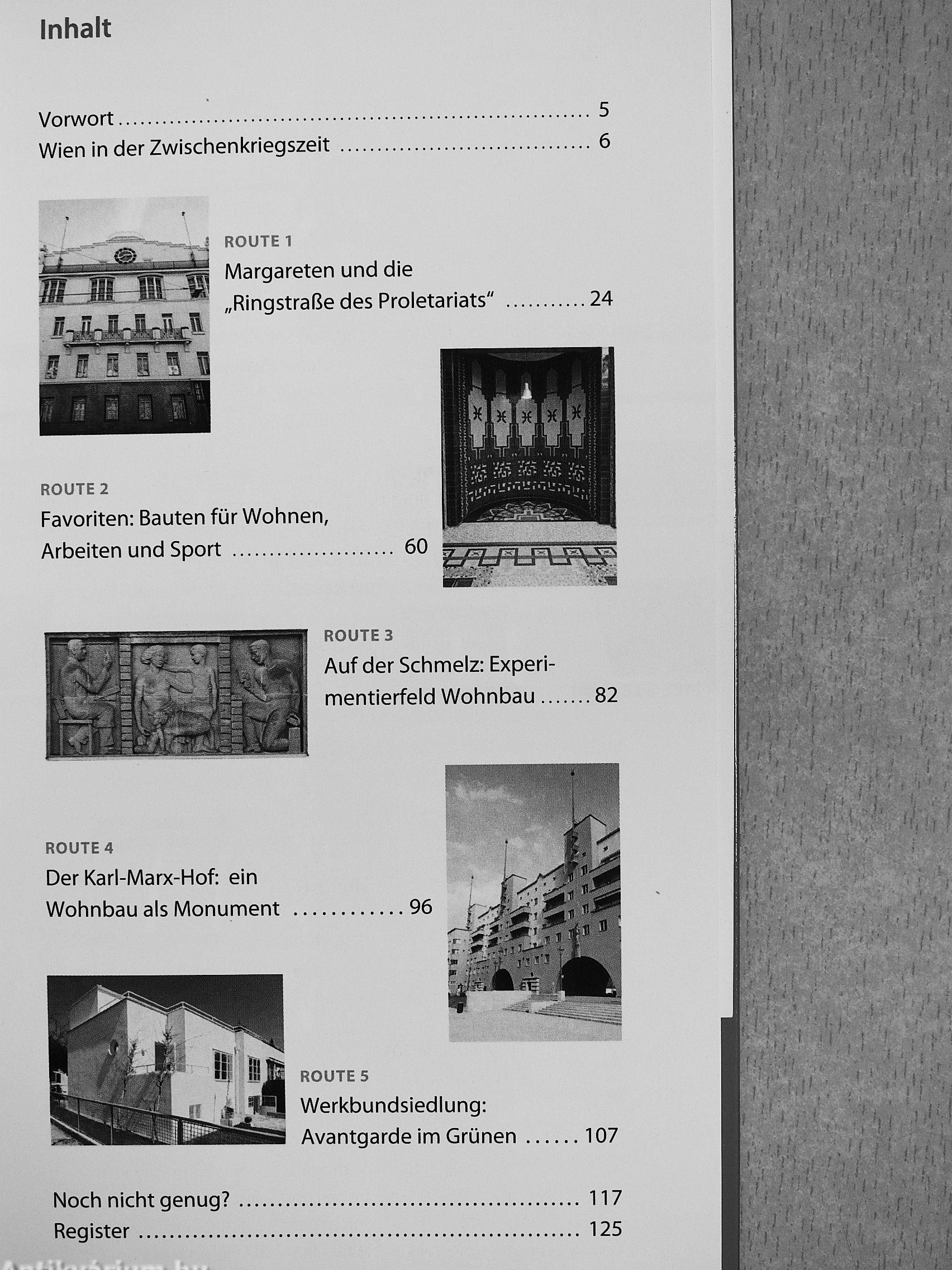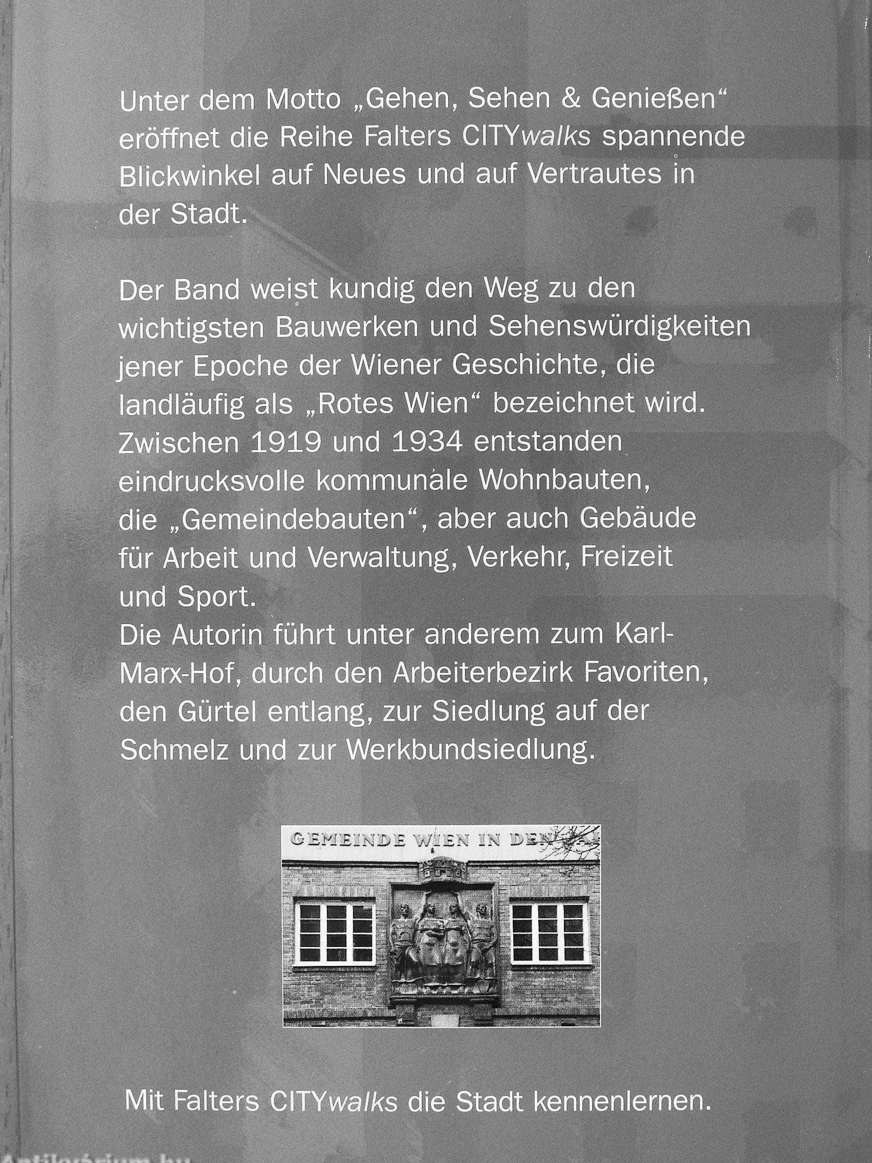 Die Autorin führt unter anderem zum Karl-Marx-Hof, durch den Arbeiterbezirk Favoriten, den Gürtel entlang, zur Siedlung auf der Schmelz und zur Werkbundsiedlung.