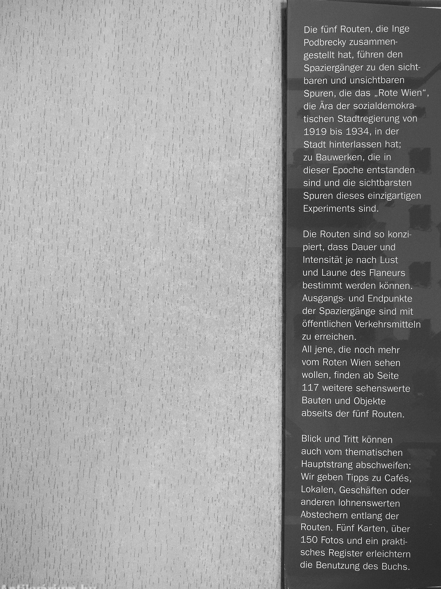 Die fünf Routen, die Inge Podbrecky zusammengestellt hat, führen den Spaziergänger zu den sichtbaren und unsichtbaren Spuren, die das „Rote Wien" die Ära der sozialdemokratischen Stadtregierung von 1919 bis 1934, in der Stadt hinterlassen hat; zu Bauwerken, die in dieser Epoche entstanden sind und die sichtbarsten Spuren dieses einzigartigen Experiments sind.