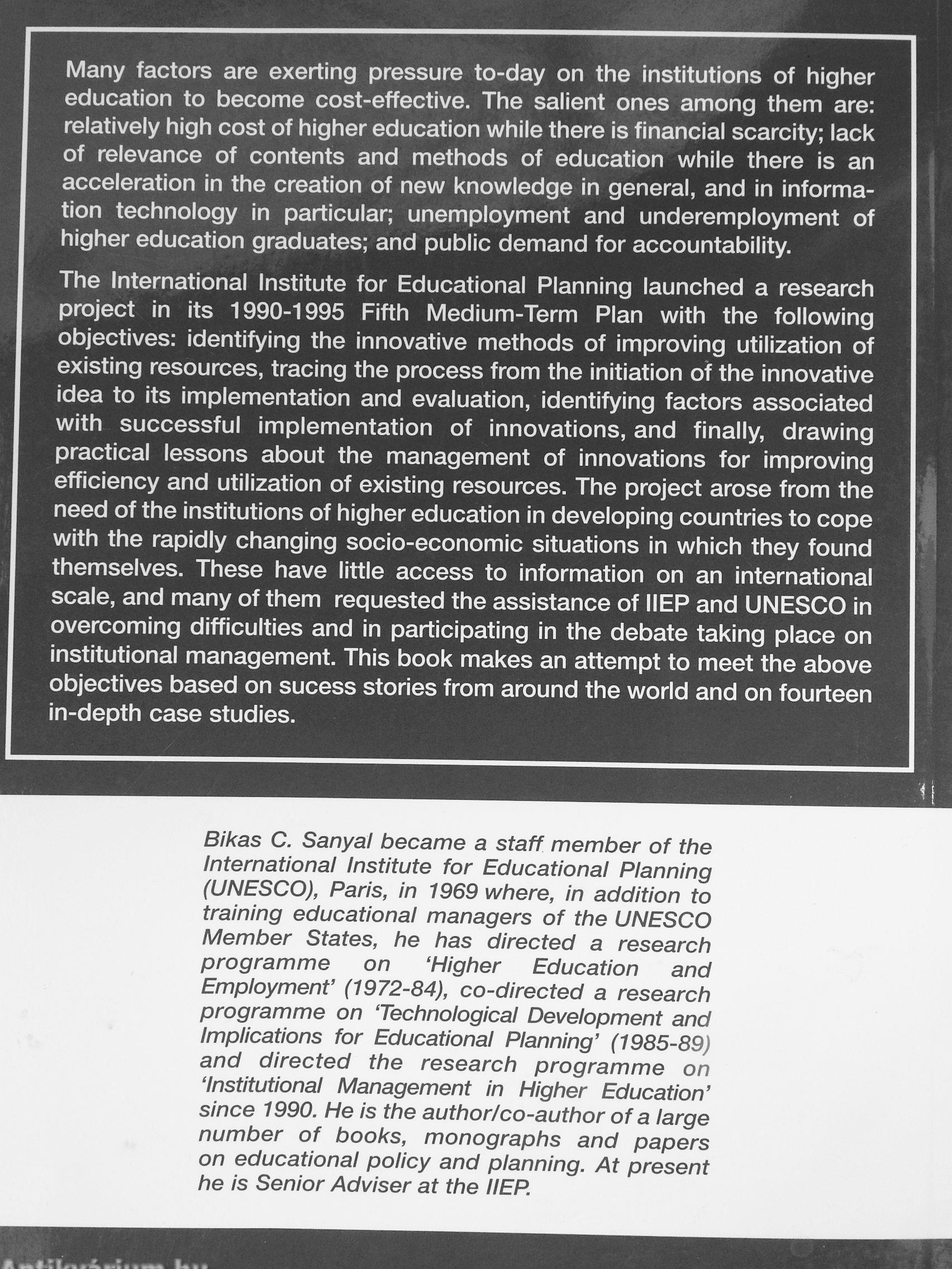 Bikas C. Sanyal became a staff member of the International Institute for Educational Planning (UNESCO), Paris, in 1969 where, in addition to training educational managers of the UNESCO Member States, he has directed a research programme on 'Higher Education and Employment' (1972-84), co-directed a research programme on 'Technological Development and Implications for Educational Planning' (1985-89) and directed the research programme on 'Institutional Management in Higher Education' since 1990. He is the author/co-author of a large number of books, monographs and papers on educational policy and planning. At present he is Senior Adviser at the HEP.