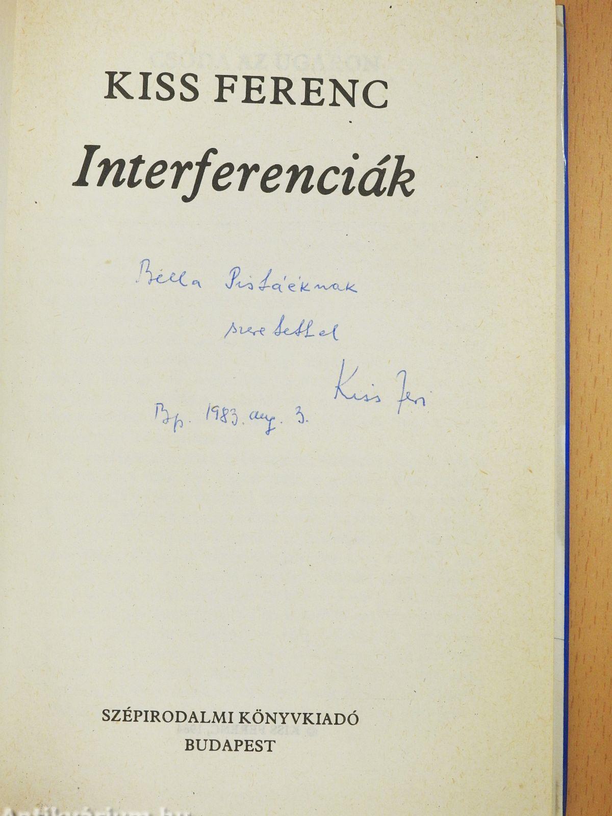 Az interferencia fogalma a fizikából került e gyűjtemény homlokzatára. Annyi önkényességgel, amennyit a fizikai és szellemi jelenségek közötti különbség engedélyez. A fényinterferencia egymást erősítő csak akkor lehet, ha egyazon fényforrásból s kedvező hullámokban induló sugarak találkoznak egymással. A szellemi interferenciákban épp az a csodálatos, hogy benne távoli, sőt egymástól idegen forrásokból eredő sugarak is találkozhatnak. A fáziskülönbség, a megtett út hossza, a közeg, melyen át kell hatolnia s amelyről vissza kell verődni, természetesen a költő és olvasó viszonyára is kihat: gyöngíthetik, ki is olthatják egymást. Kiss Ferenc úgy véli, az a dolga, hogy a találkozást elősegítse. Nem az tehár, hogy mindenféle fények egymást félerősítő találkozását intézze, hanem az, hogy a sugárzások erejét, természetét mérje, megértse és megismertesse. Ez a szerep magyarázhatja ellen- és rokonszenveit is.