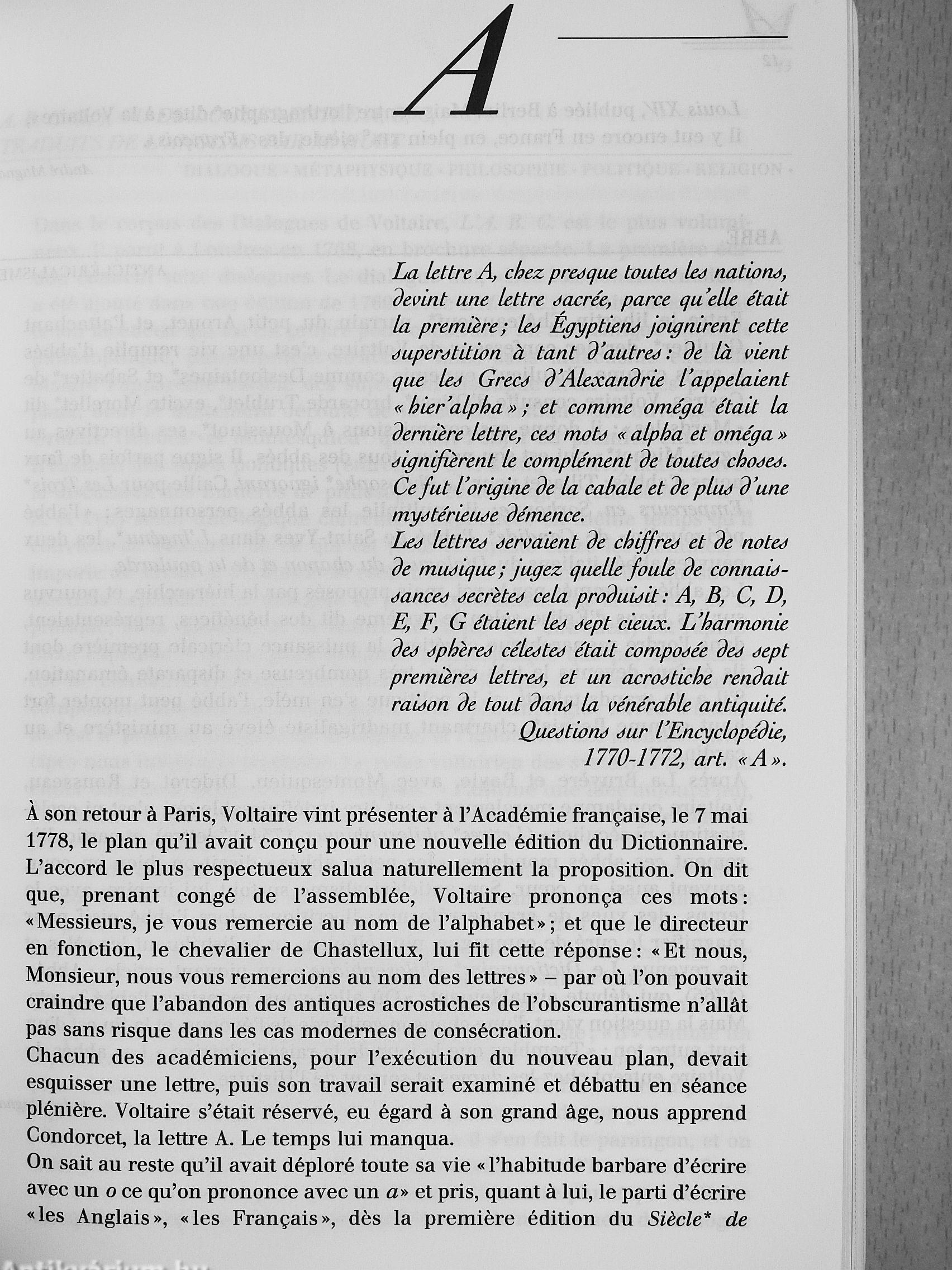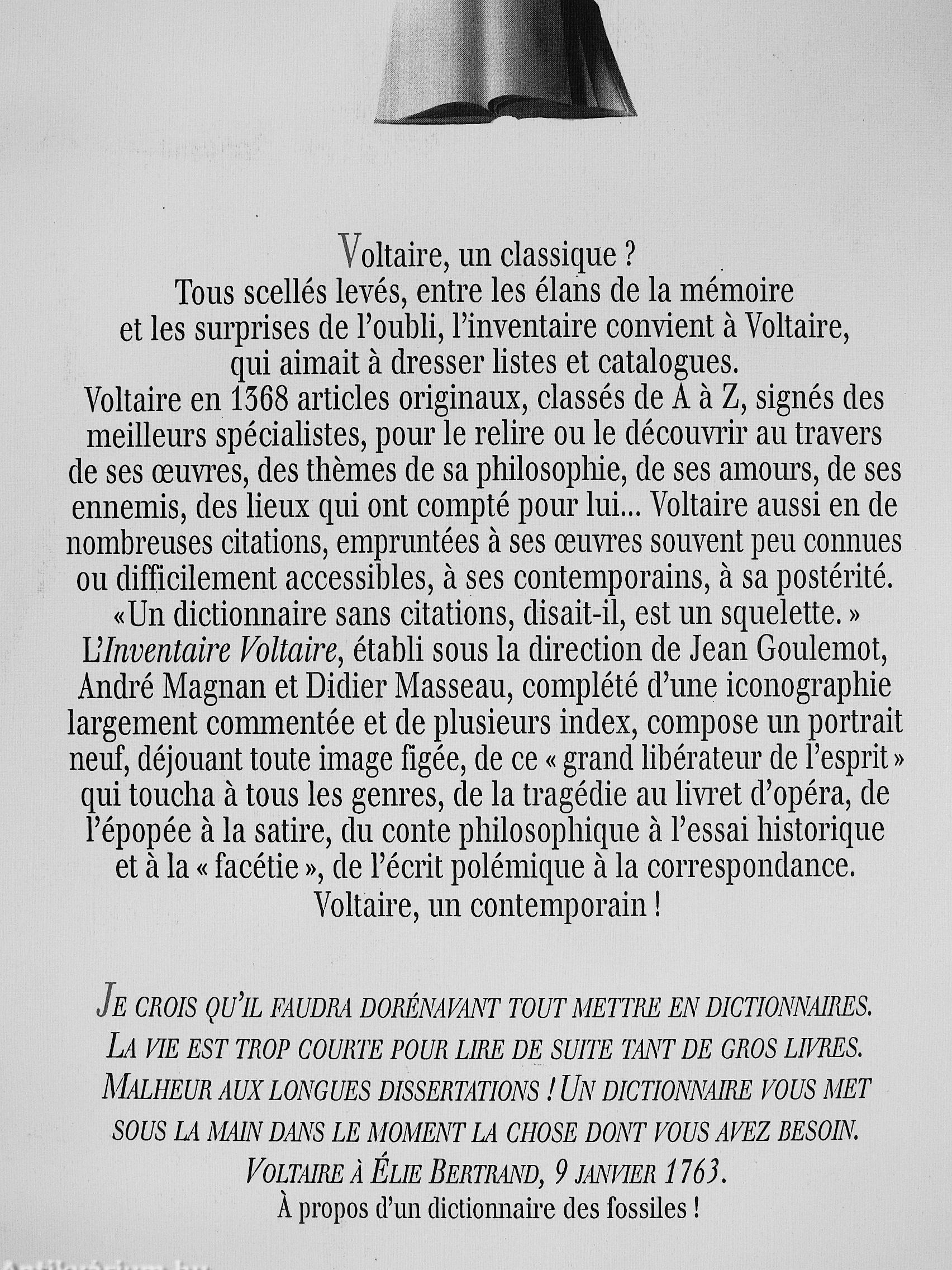 Tous scellés levés, entre les élans de la mémoire et les surprises de l'oubli, l'inventaire convient a Voltaire, qui aimait a dresser listes et catalogues. Voltaire en 1368 articles originaux, classés de A a Z, signés des meilleurs spécialistes, pour le relire ou le découviir au travers de ses ouwes, des themes de sa philosophie, de ses amours, de ses ennemis, des heux qui ont compté pour lui Voltaire aussi en de nombreuses citations, empruntées a ses ouvres souvent peu connues ou difficilement accessibles, a ses contemporains, a sa postérité.