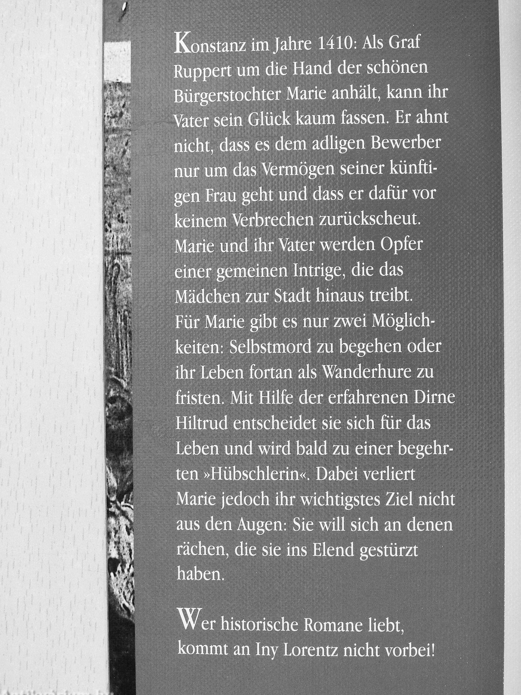 Konstanz im Jahre 1410: Als Graf Huppert um die Hand der schönen Bürgerstochter Marie anhält, kann ihr Vater sein Glück kaum fassen. Er ahnt nicht, dass es dem adligen Bewerber nur um das Vermögen seiner künftigen Frau geht und dass er dafür vor keinem Verbrechen zurückscheut. Marie und ihr Vater werden Opfer einer gemeinen Intrige, die das Mädchen zur Stadt hinaus treibt. Für Marie gibt es nur zwei Möglichkeiten: Selbstmord zu begehen oder ihr Leben fortan als Wanderhure zu fristen. Mit Hilfe der erfahrenen Dirne Hiltrud entscheidet sie sich für das Leben und wird bald zu einer begehrten »Hübschlerin«. Dabei verliert Marie jedoch ihr wichtigstes Ziel nicht aus den Augen: Sie will sich an denen rächen, die sie ins Elend gestürzt haben.
