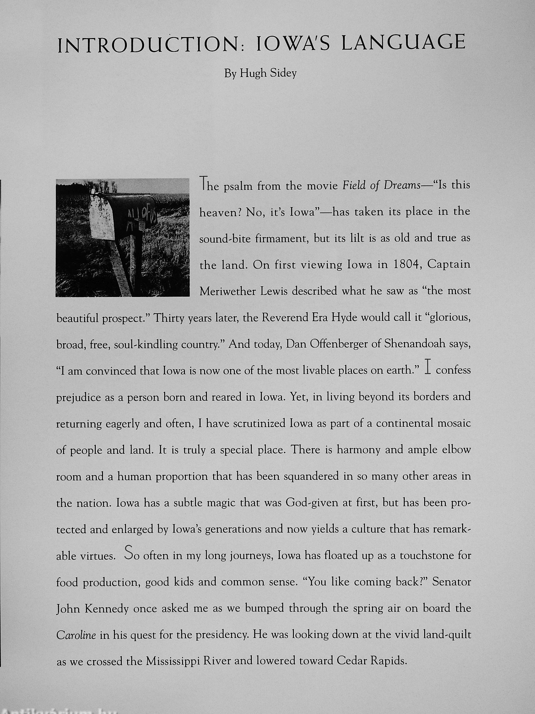 "Iowa is that special place which has crafted itself to claim a big part of the future but, at the same time, never sacrificed those values of person and community on which a successful society must rest. From my perch, I see Iowa as a unique blend of land and people and purpose."