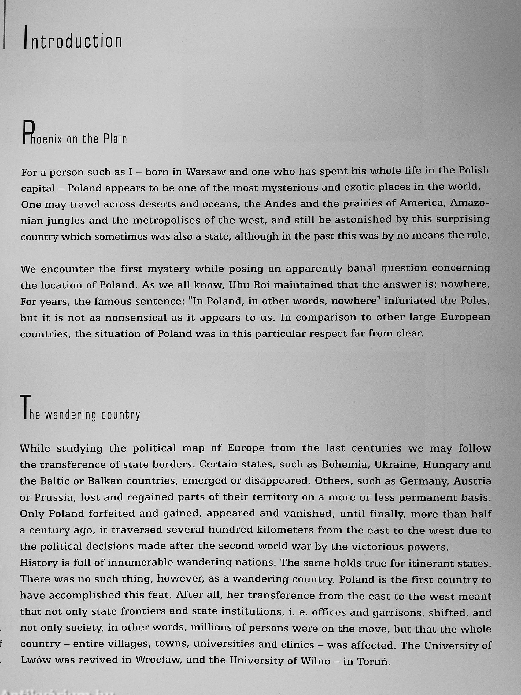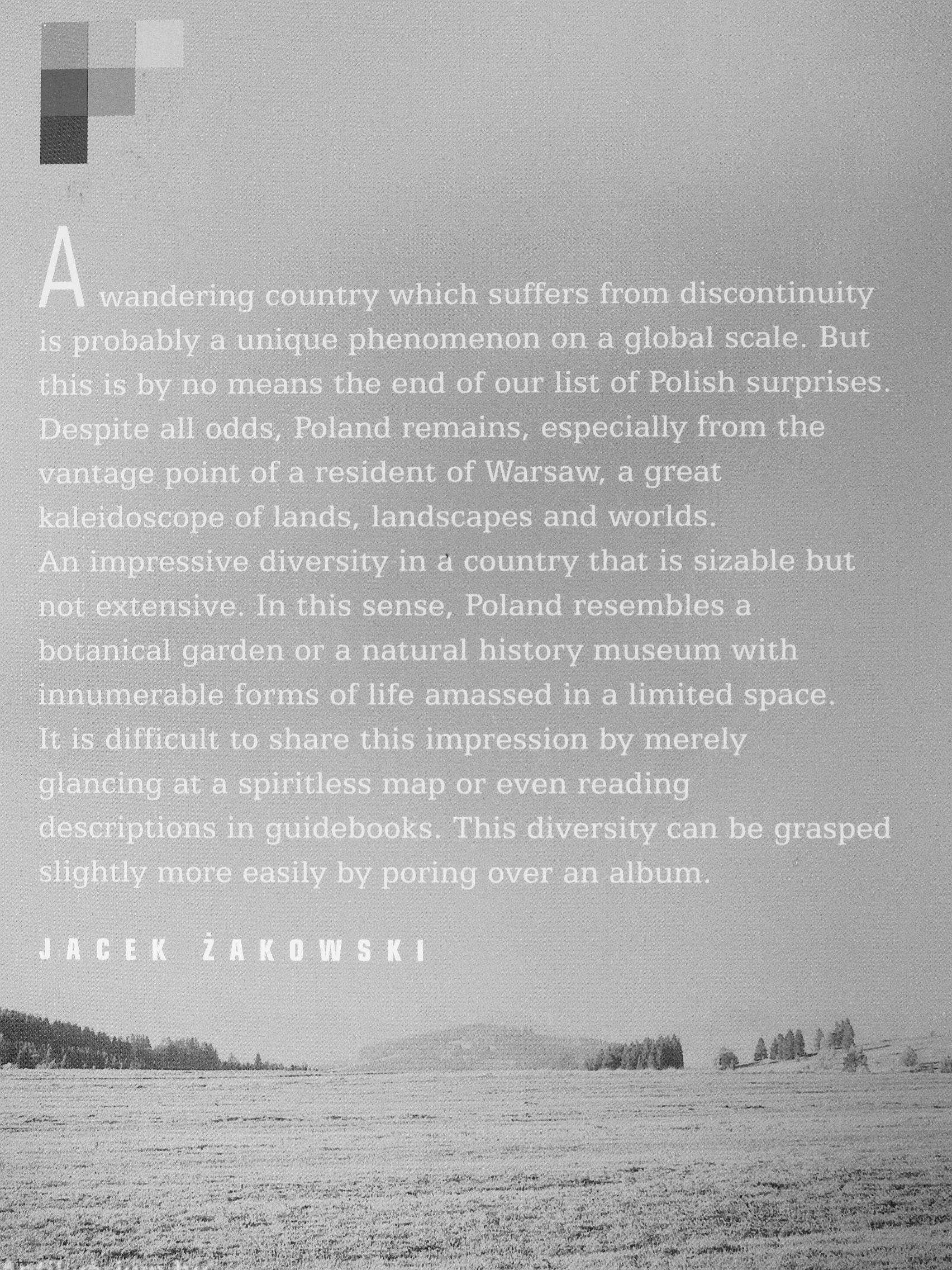 t^ wandering country which suffers from discontinuity is probably a unique phenomenon on a global scale. But this is by no means the end of our list of Polish surprises. Despite all odds, Poland remains, especially from the vantage point of a resident of Warsaw, a great kaleidoscope of lands, landscapes and worlds. An impressive diversity in a country that is sizable but not extensive. In this sense, Poland resembles a botanical garden or a natural history museum with innumerable forms of life amassed in a limited space. It is difficult to share this impression by merely glancing at a spiritless map or even reading descriptions in guidebooks. This diversity can be grasped slightly more easily by poring over an album.