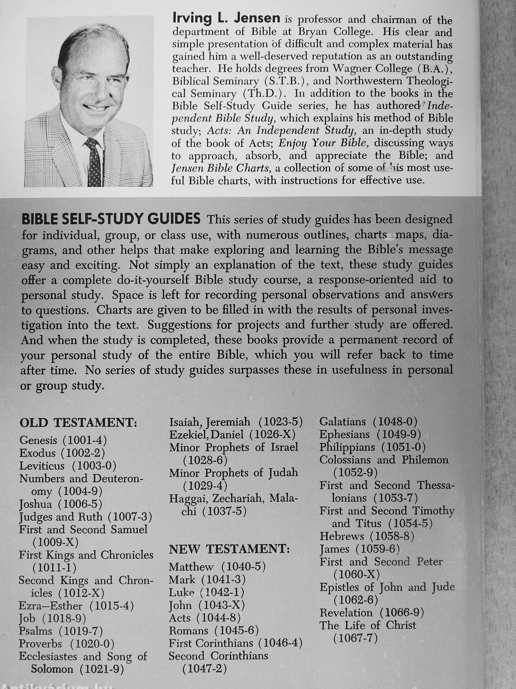 Irving L. Jensen !s professor and chairman of the department of Bible at Bryan College. His clear and simple presentation of difficult and complex material has gained him a well-deserved reputation as an outstanding teacher. He holds degrees from Wagner College (B.A.), Biblical Seminary (S.T.B.), and Northwestern Theological Seminary (Th.D.). In addition to the books in the Bible Self-Study Guide series, he has authored"/nde-pendent Bible Study, which explains his method of Bible study; Acts: An Independent Study, an in-depth study of the book of Acts; Enjoy Your Bible, discussing ways to approach, absorb, and appreciate the Bible; and Jensen Bible Charts, a collection of some of ^is most useful Bible charts, with instructions for effective use.