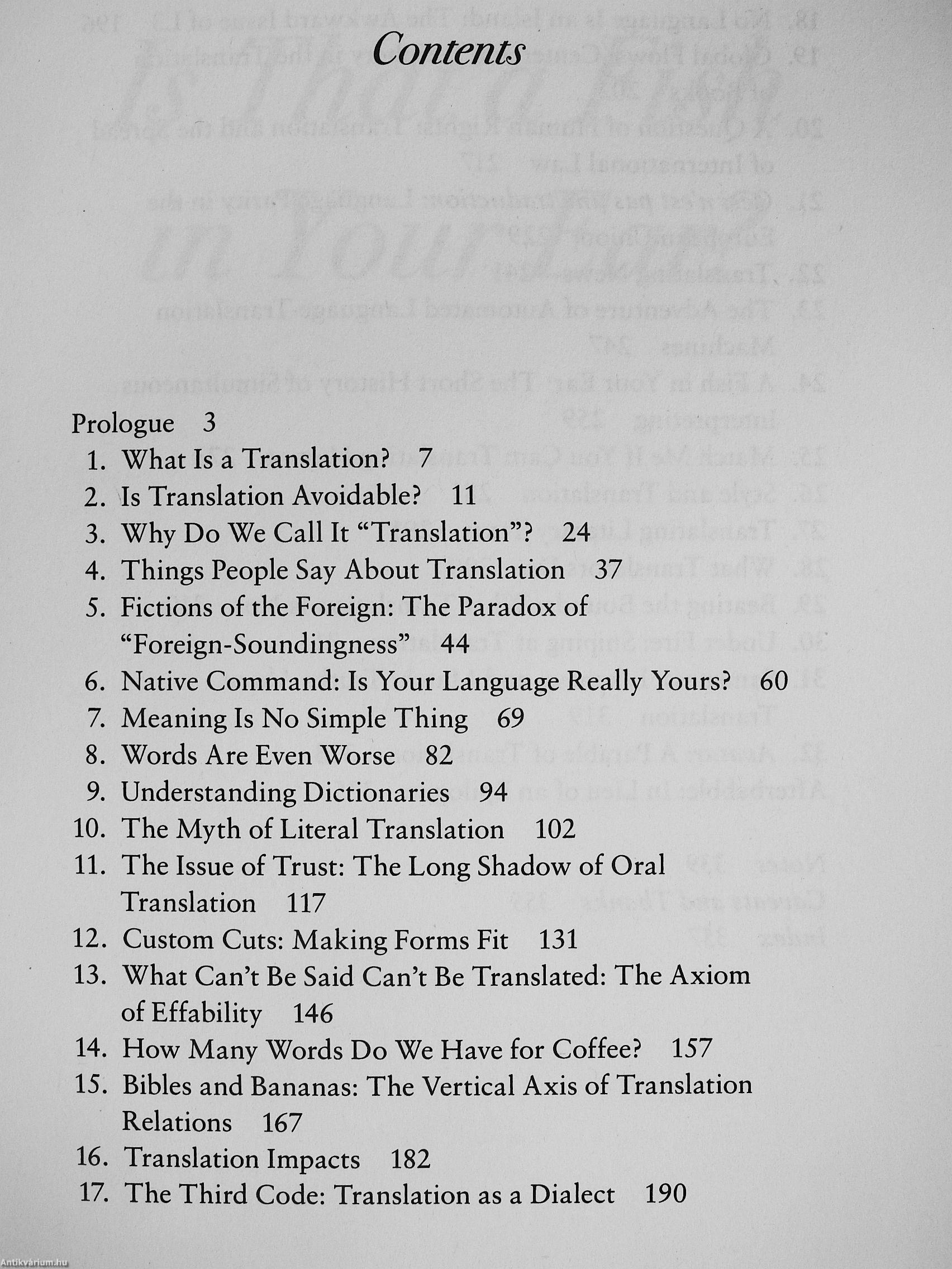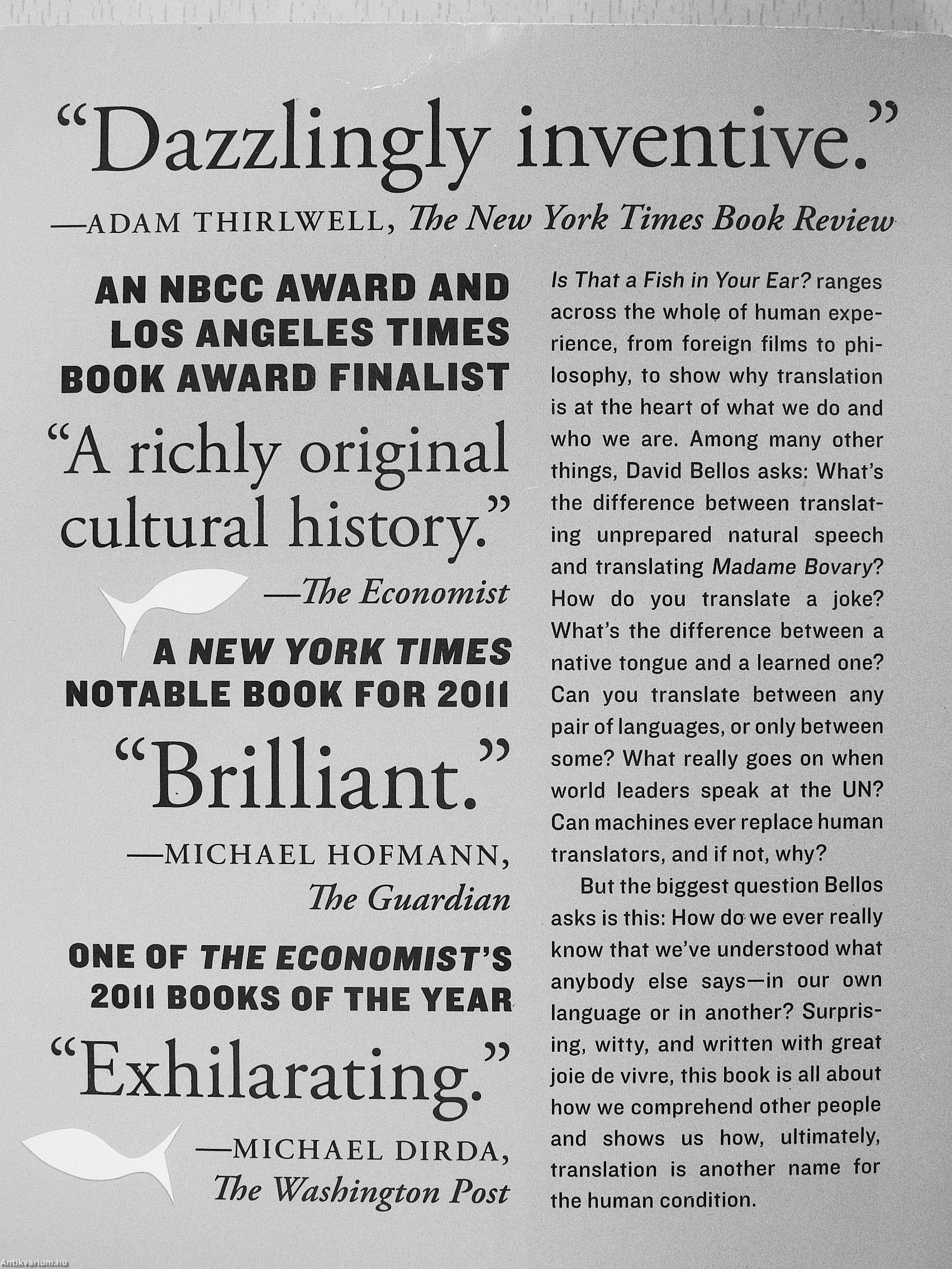 Is That a Fish in Your Ear? ranges across the whole of human experience, from foreign films to philosophy, to show why translation is at the heart of what we do and who we are. Among many other things, David Bellos asks: What's the difference between translating unprepared natural speech and translating Madame Bovary? How do you translate a joke? What's the difference between a native tongue and a learned one? Can you translate between any pair of languages, or only between some? What really goes on when world leaders speak at the UN? Can machines ever replace human translators, and if not, why?