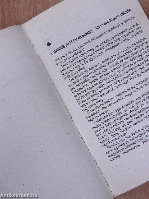 Minden ilyen szereplő kitalált alak, s ha fenn is áll valamiféle tényleges vagy vélt hasonlóság a könyv szereplői és valóságos emberek között, ez merőben véletlen és akaratlan. Tehát Giles Devore (akit nem nagyon szerettem), Darius Just (akit szerettem) és Sarah Voskovek (akit nagyon szerettem) az én képzeletem teremtményei.