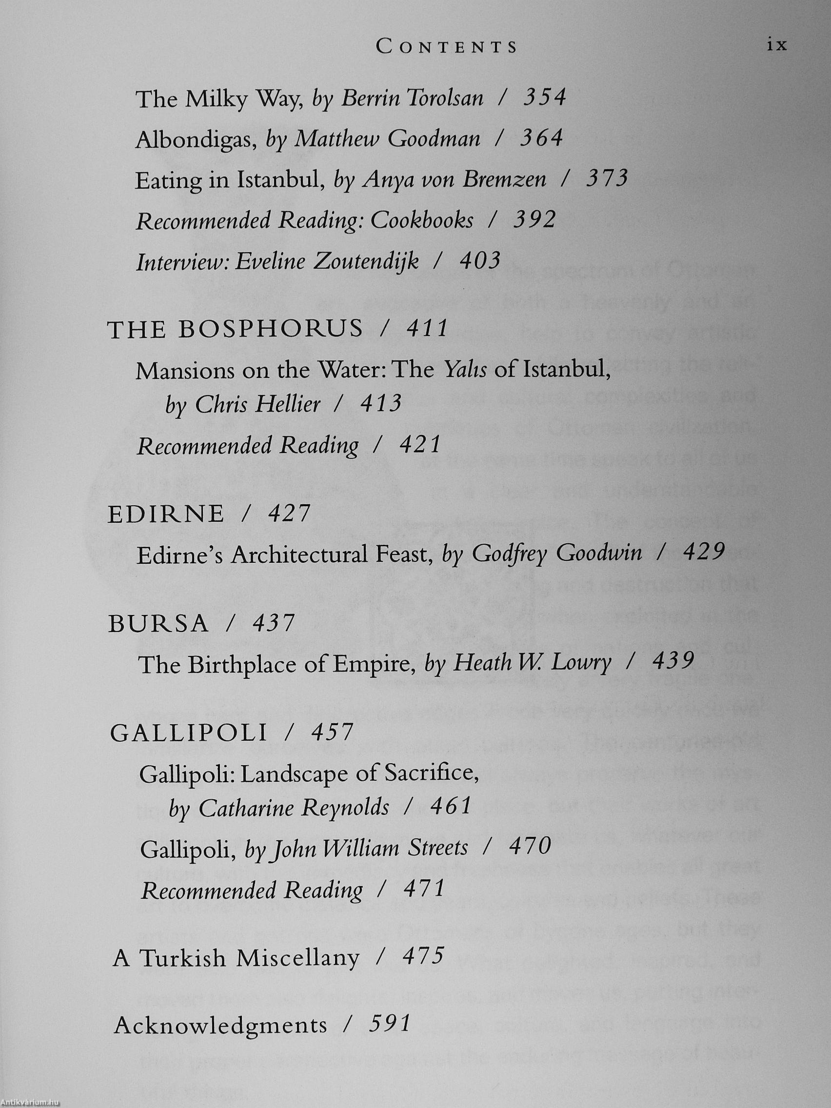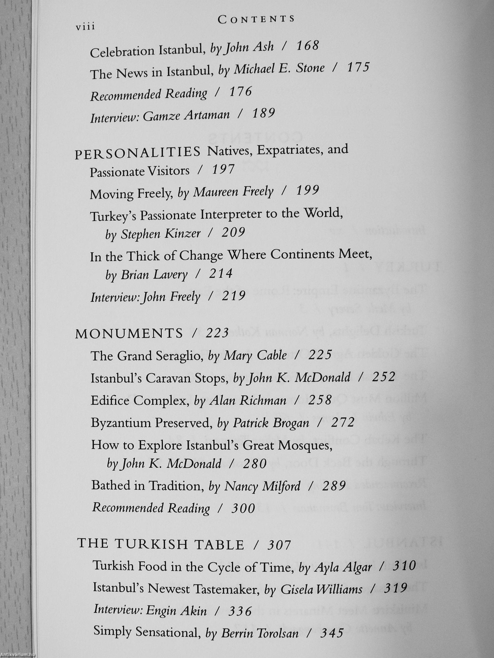 • Interviews, Q&As, and commentary from visitors and residents, including food writers Claudia Roden and Alan Richman, historian John Freely, and Nobel Prize-winner Orhan Pamuk.