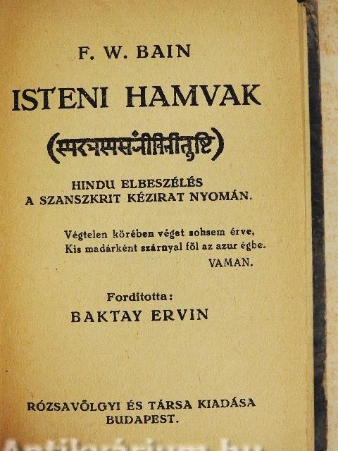 Megjegyzés: F. W. Bain kilenc hindú meséjét követi az "Isteni Hamvak". A művet Sugár Jenő rendezte sajtó alá. Szedték a Korvin Testvérek félkövér Hayduck-antiqua betűivel.