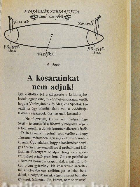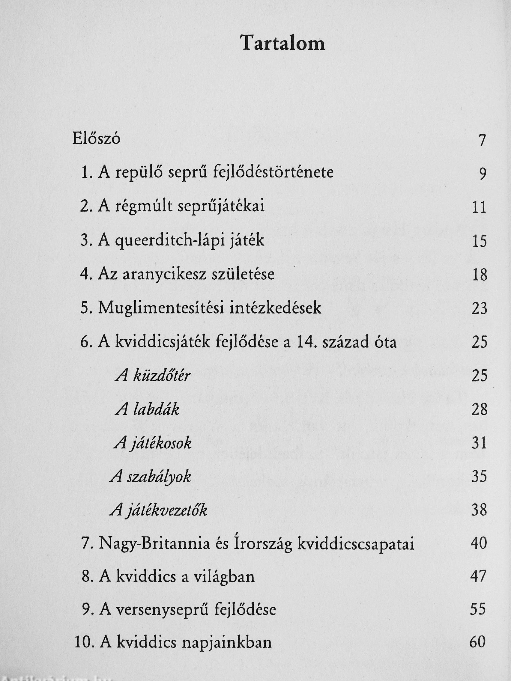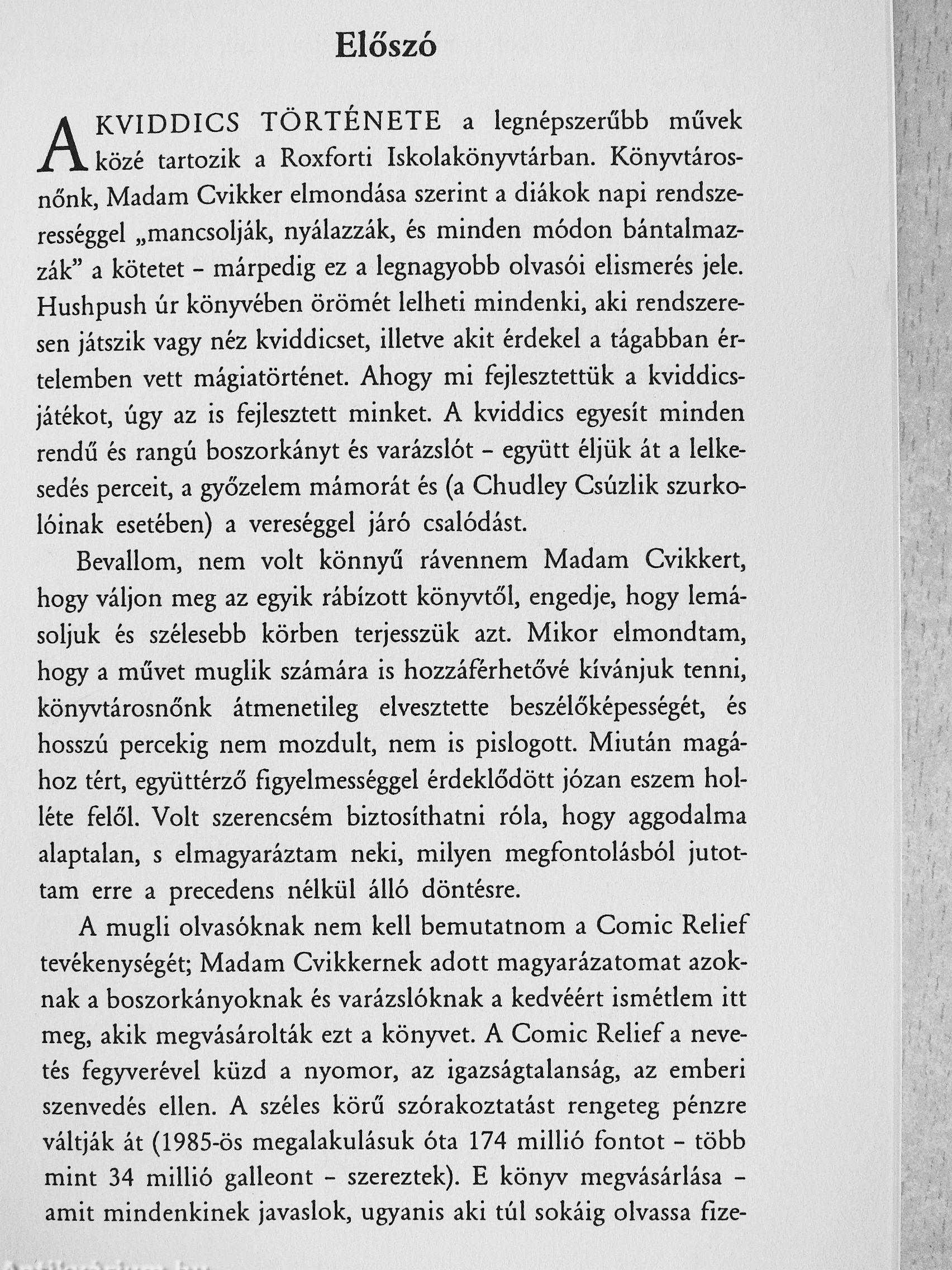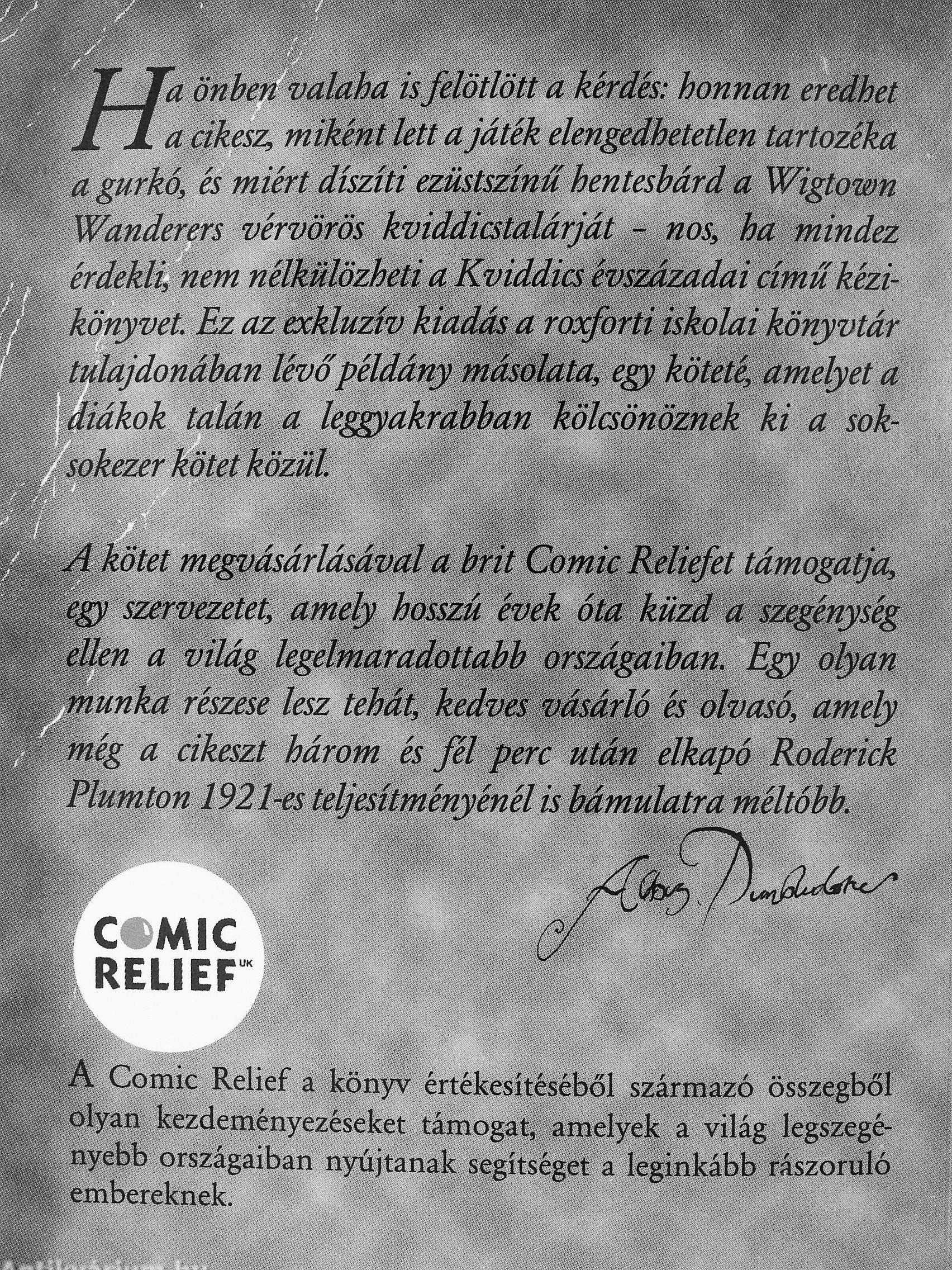 'a önben valaha is felötlött a kérdés: honnan eredhet a cikesz, miként lett a játék elengedhetetlen tartozéka ? a gurkó, és miért díszíti ezüstszínű hentesbárd a Wigtown y Wanderers vérvörös kviddiatalárját - nos, ha mindez érdekli, nem nélkülözheti a Kviddics évszázadai című kézikönyvet. Ez az exkluzív kiadás a roxforti iskolai könyvtár tulajdonában lévő példány másolata, egy köteté, amelyet a 'diákok talán a leggyakrabban kölcsönöznek ki a sok-% , sokezer kötet közül.