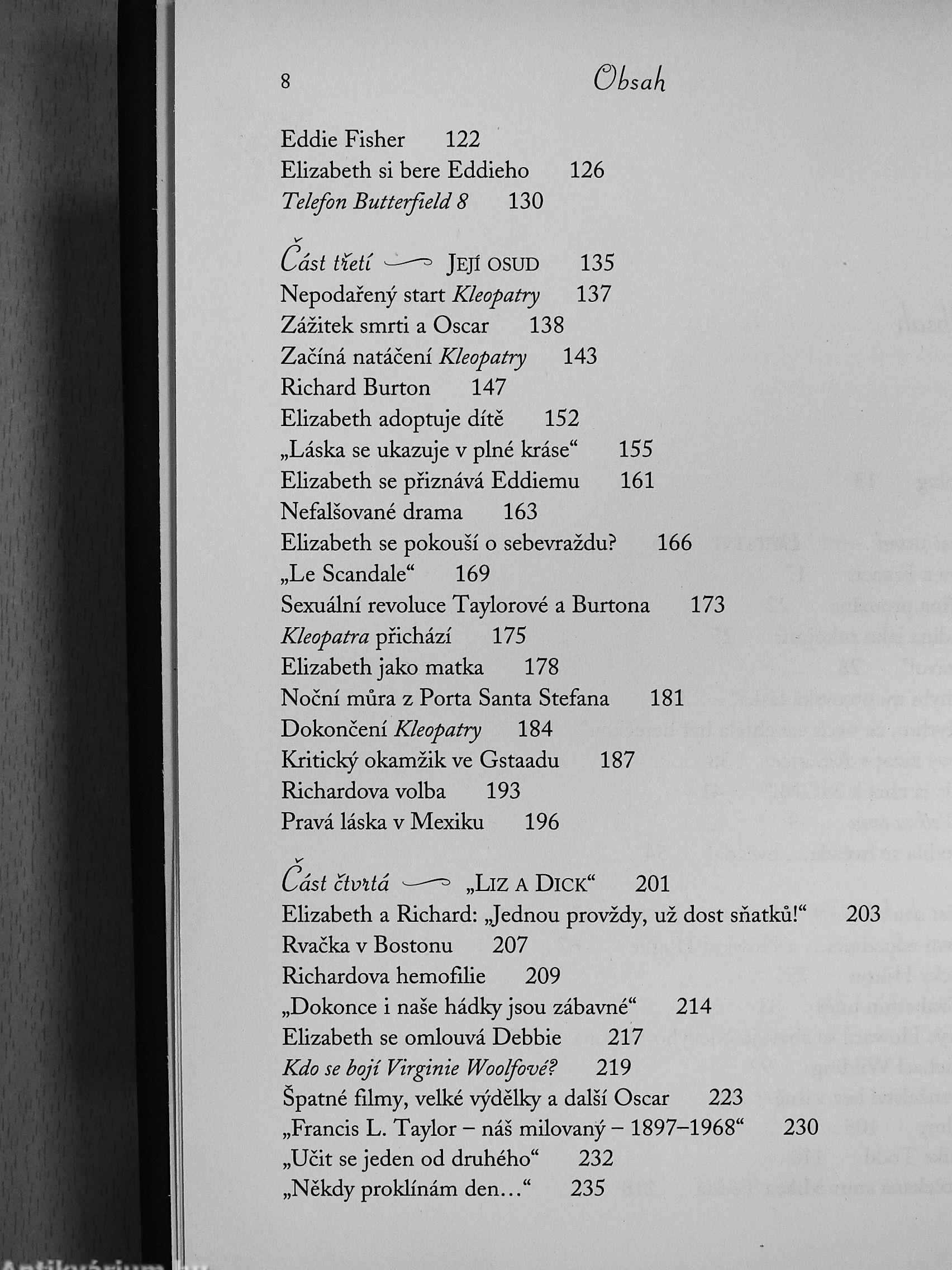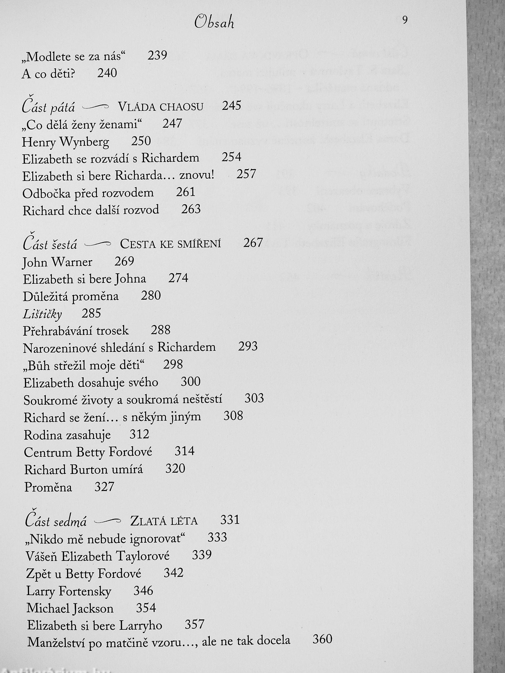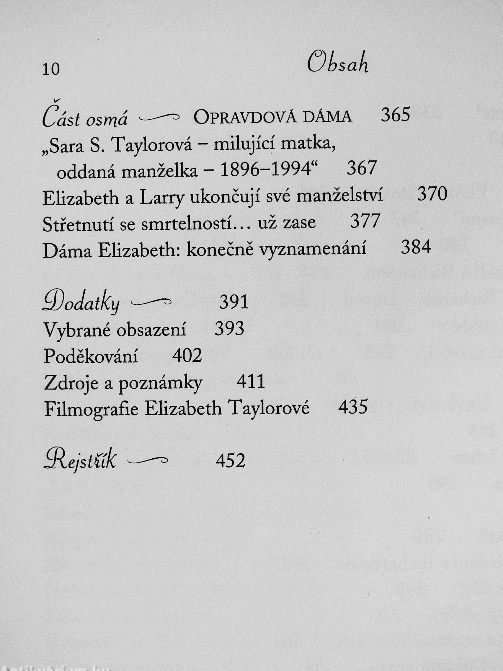 Osmi manzelstvim a sedmi manzelum Elizabeth se dostalo siroké vefejné pozornosti, autor této knihy vsak zkoumá psychologické a emocionálni kofeny vsech tëchto vztahu, vcetnë nesiastného manzelství s Nickym Hil-tonem, vztahu s frajerskym Mikem Toddem a slozité, bouflivé milostné aféry s Richardem Burtonem, která trvala celá desetiletí a nikdy tak docela neskoncila.