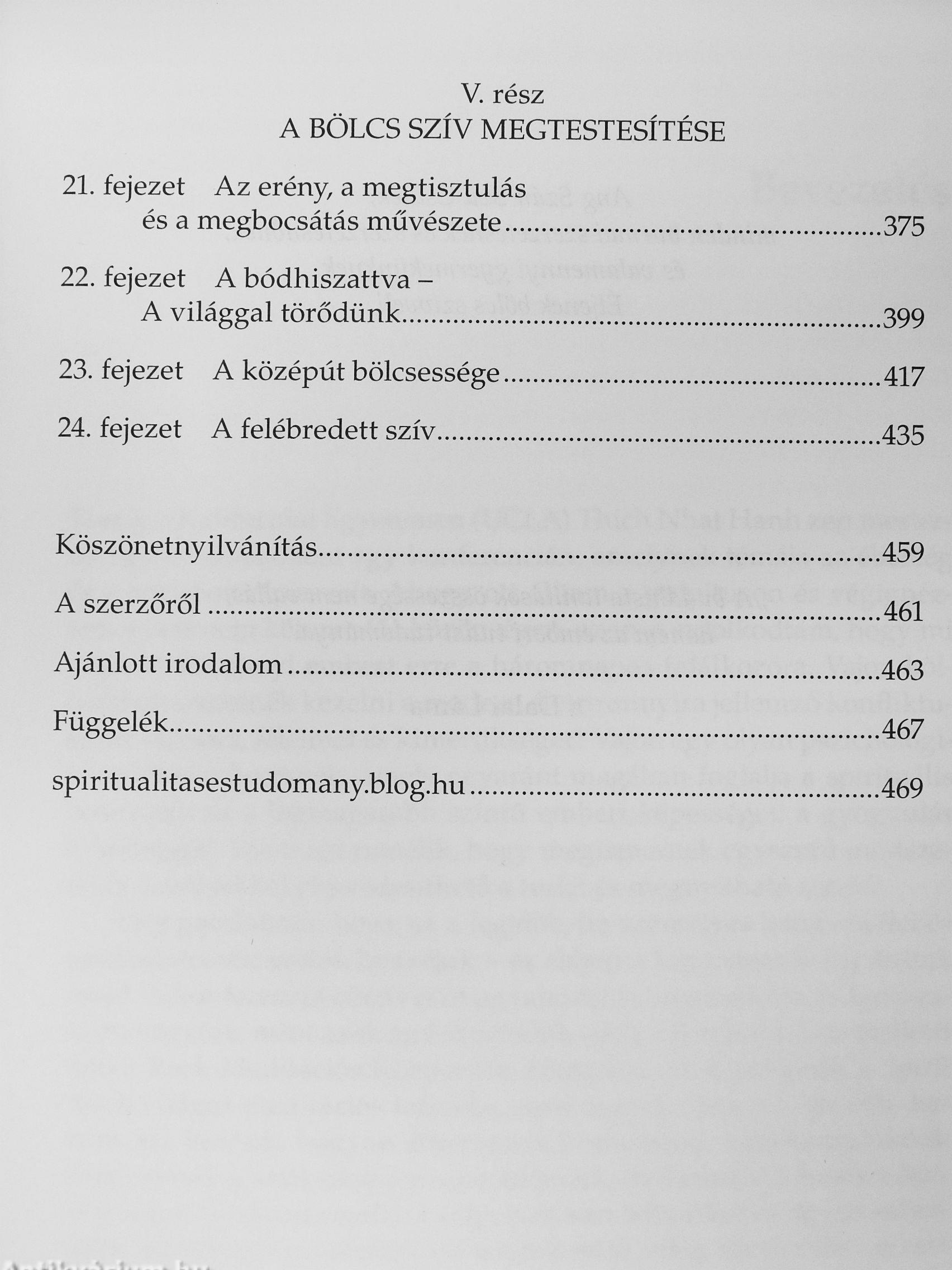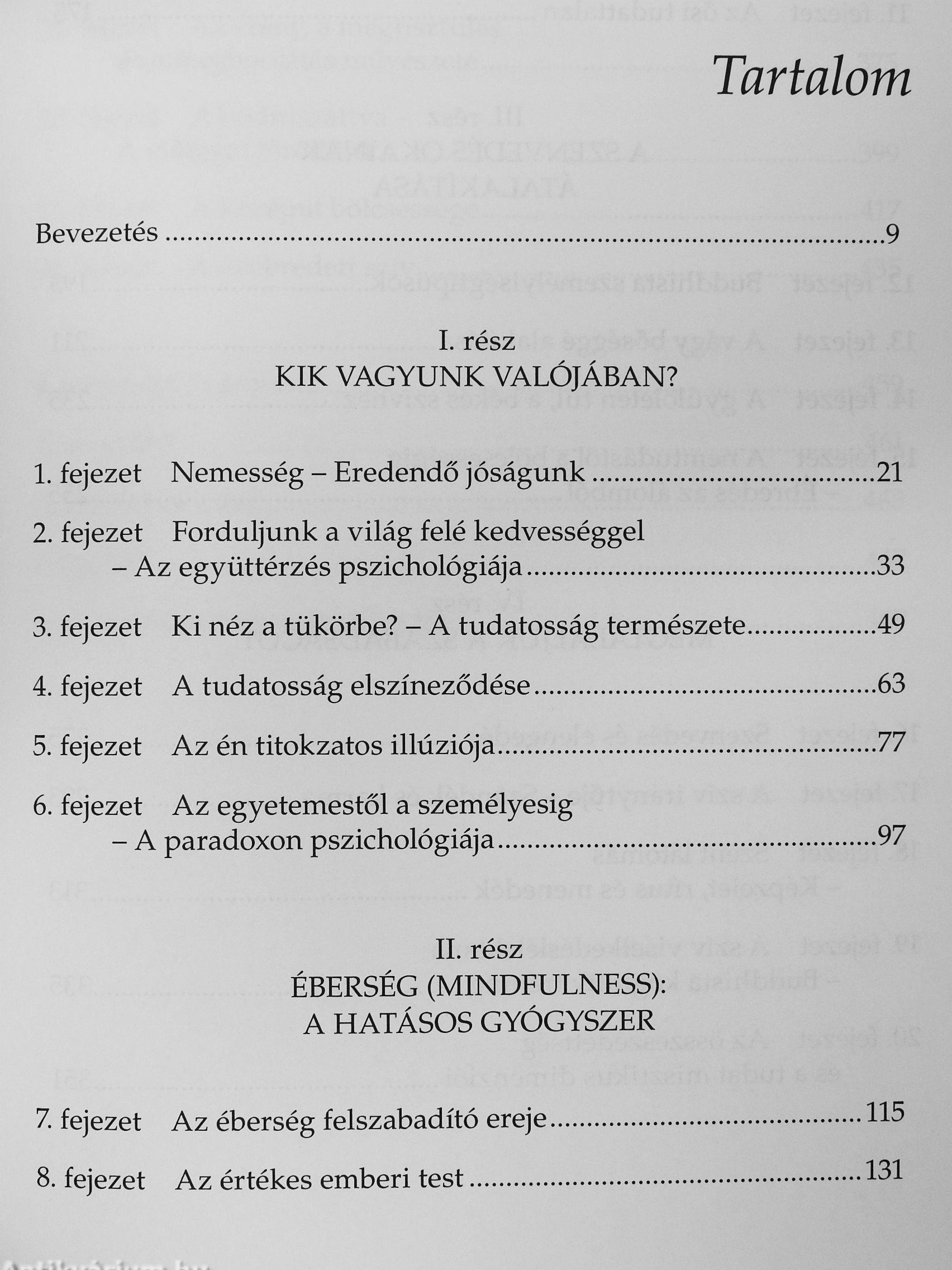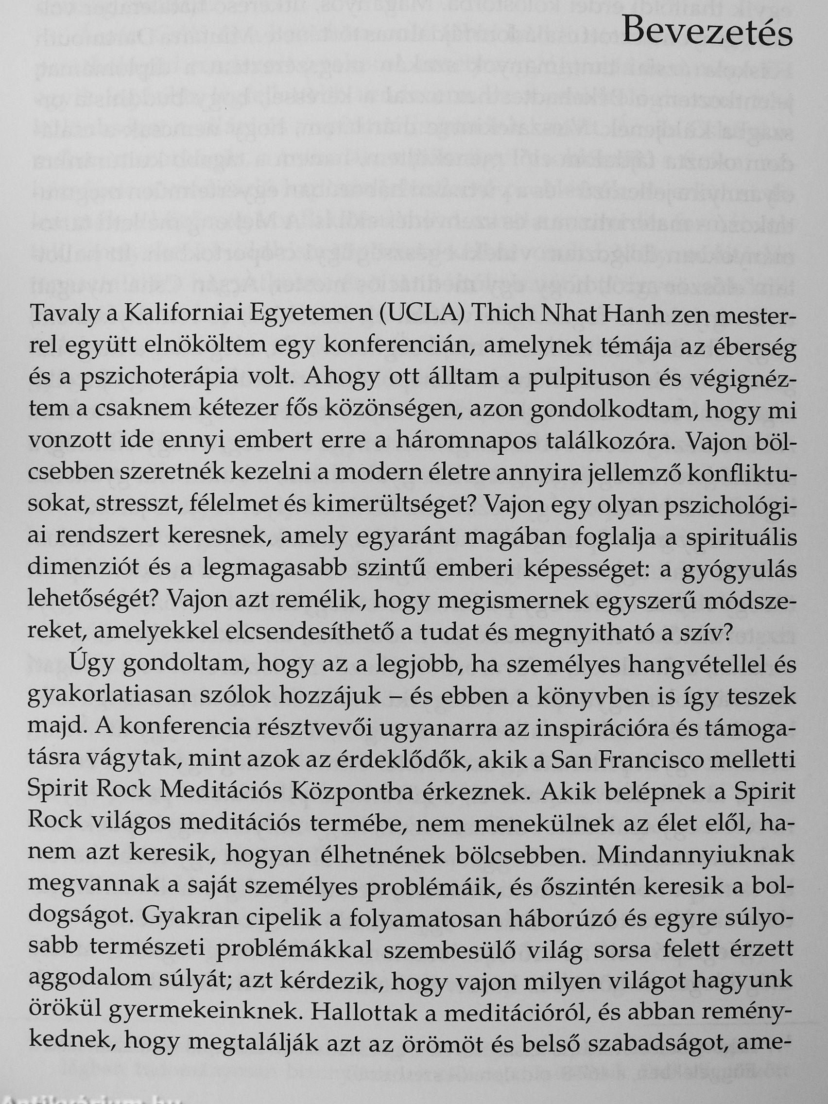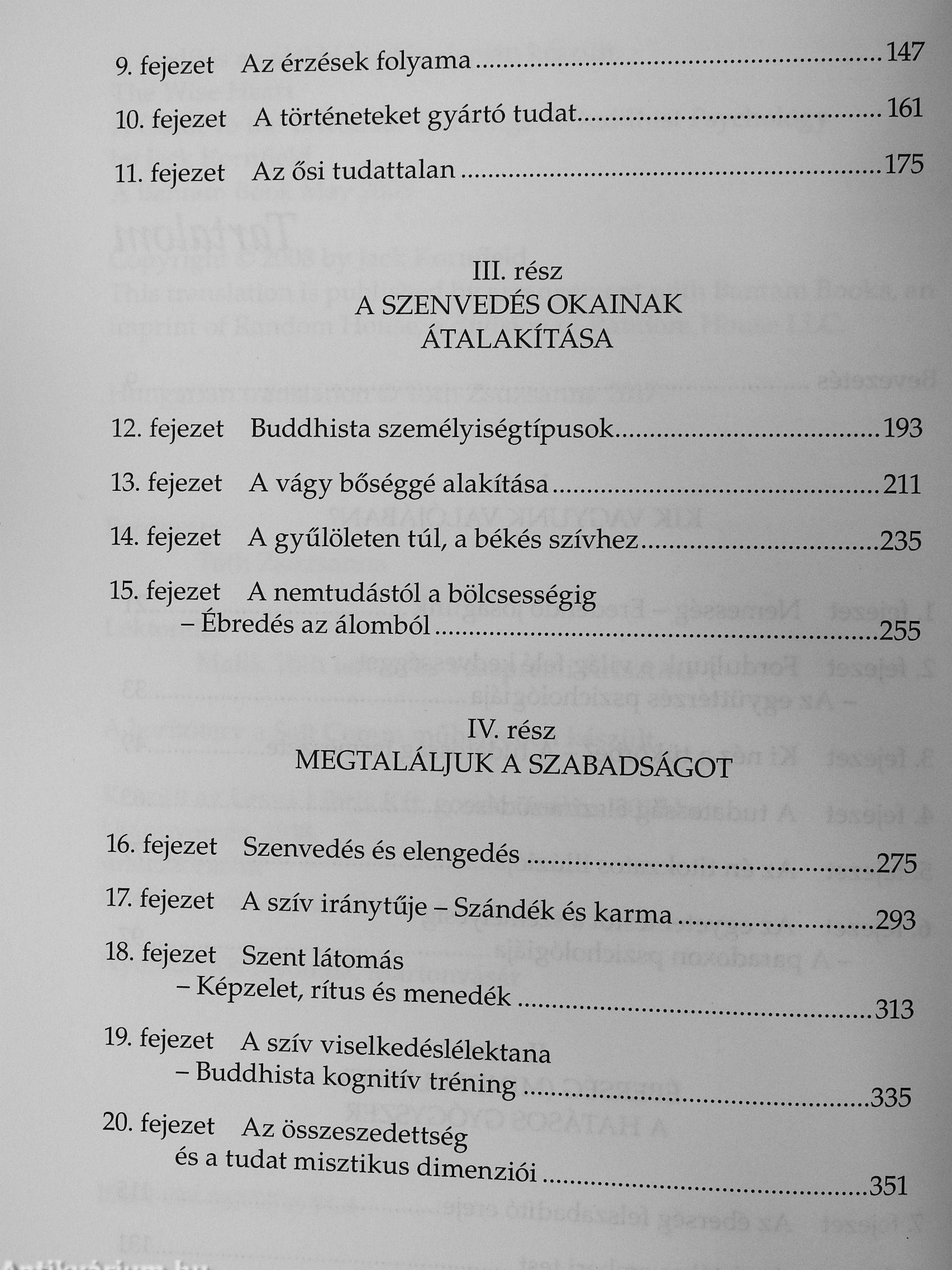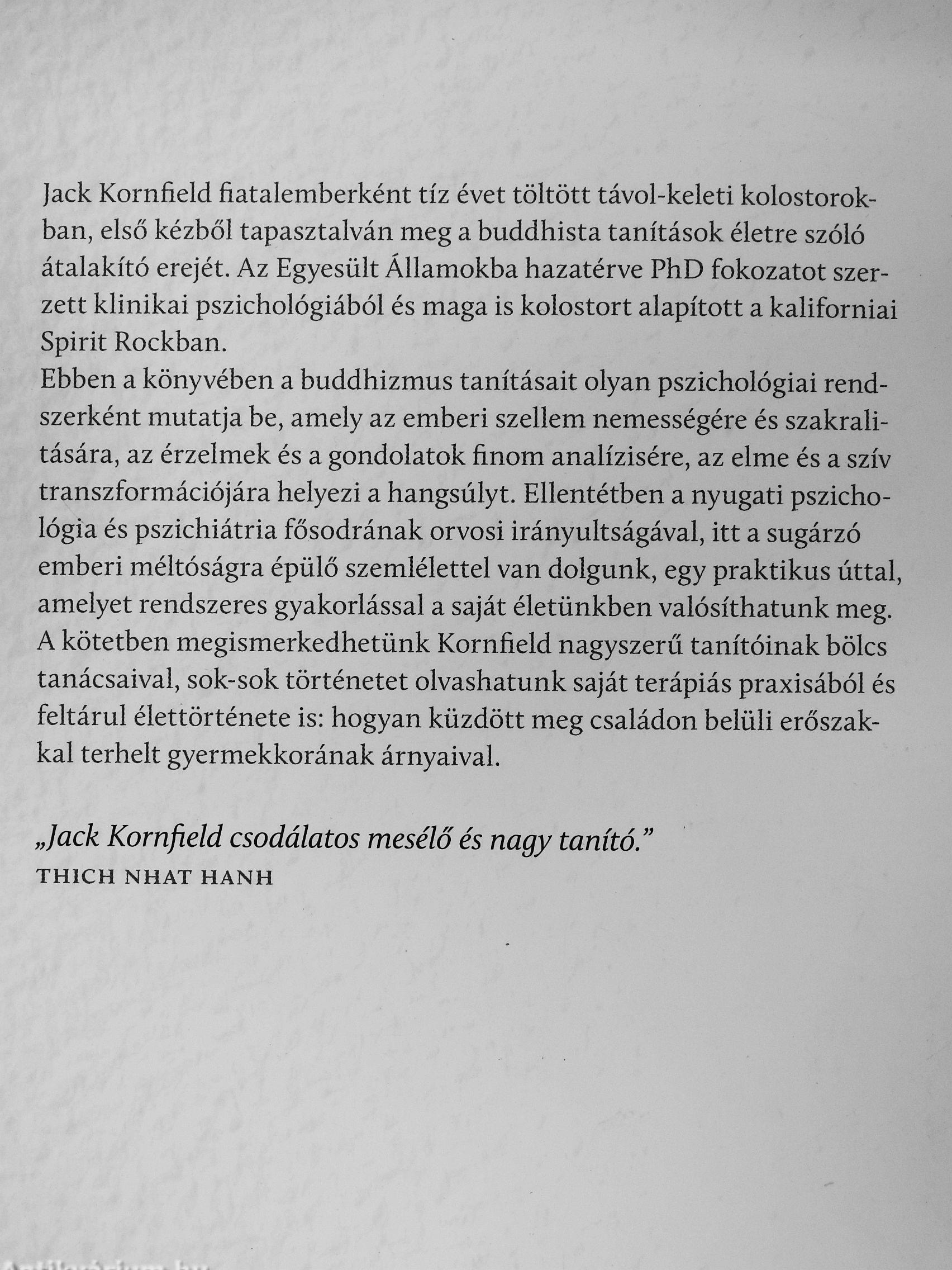 Ebben a könyvében a buddhizmus tanításait olyan pszichológiai rendszerként mutatja be, amely az emberi szellem nemességére és szakrali-tására, az érzelmek és a gondolatok finom analízisére, az elme és a szív transzformációjára helyezi a hangsúlyt. Ellentétben a nyugati pszichológia és pszichiátria fősodrának orvosi irányultságával, itt a sugárzó emberi méltóságra épülő szemlélettel van dolgunk, egy praktikus úttal, amelyet rendszeres gyakorlással a saját életünkben valósíthatunk meg. A kötetben megismerkedhetünk Kornfield nagyszerű tanítóinak bölcs tanácsaival, sok-sok történetet olvashatunk saját terápiás praxisából és feltárul élettörténete is: hogyan küzdött meg családon belüli erőszakkal terhelt gyermekkorának árnyaival.