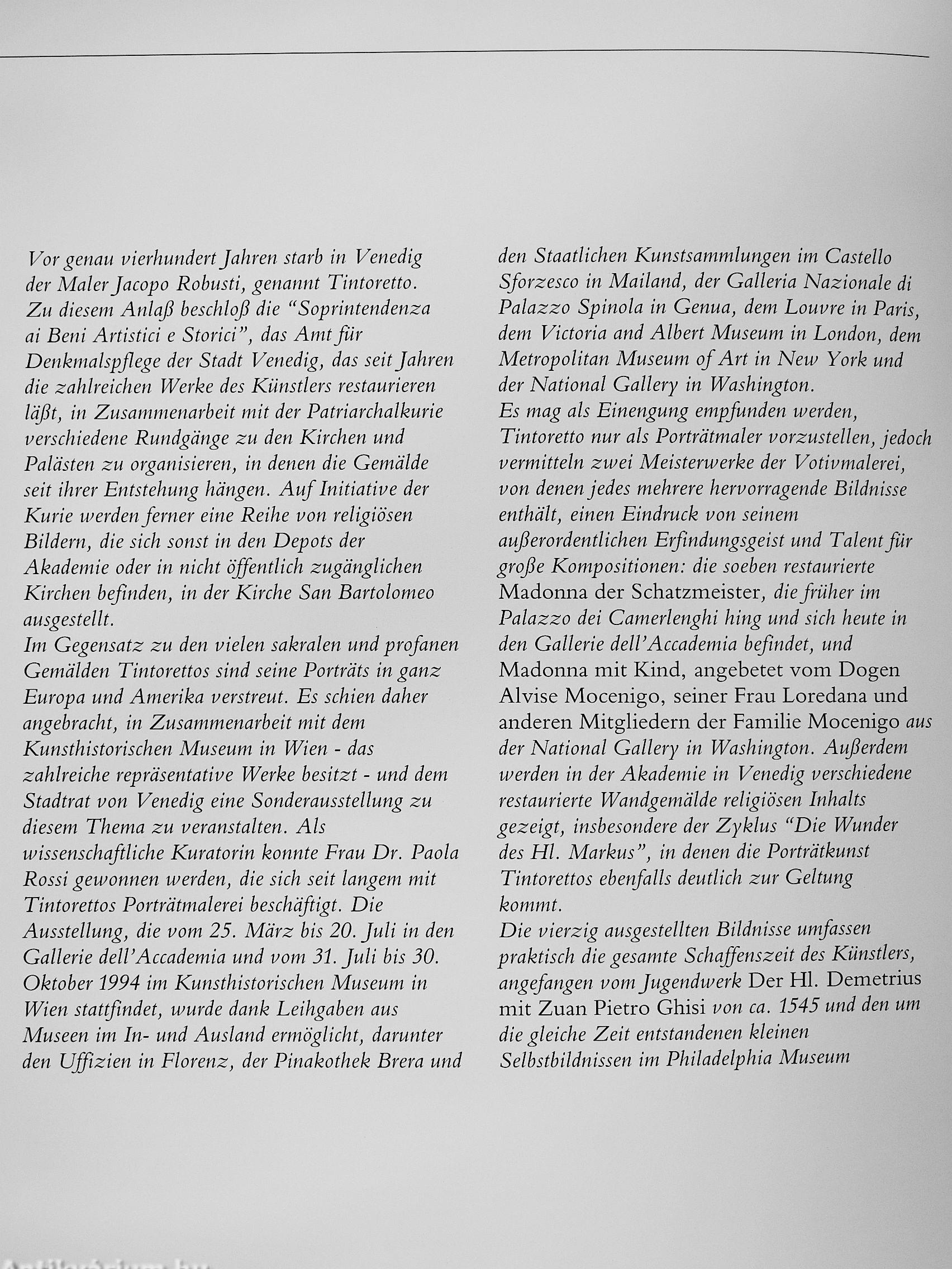 Im Gegensatz zu den vielen sakralen und profanen Gemälden Tintorettos sind seine Porträts in ganz Europa und Amerika verstreut. Es schien daher angebracht, in Zusammenarbeit mit dem Kunsthistorischen Museum in Wien - das zahlreiche repräsentative Werke besitzt - und dem Stadtrat von Venedig eine Sonderausstellung zu diesem Thema zu veranstalten. Als wissenschaftliche Kuratorin konnte Frau Dr. Paola Rossi gewonnen werden, die sich seit langem mit Tintorettos Porträtmalerei beschäftigt. Die Ausstellung, die vom 25. März bis 20. Juli in den Gallerie dell'Accademia und vom 31. Juli bis 30. Oktober 1994 im Kunsthistorischen Museum in Wien stattfindet, wurde dank Leihgaben aus Museen im In- und Ausland ermöglicht, darunter den Ufftzien in Florenz, der Pinakothek Brera und