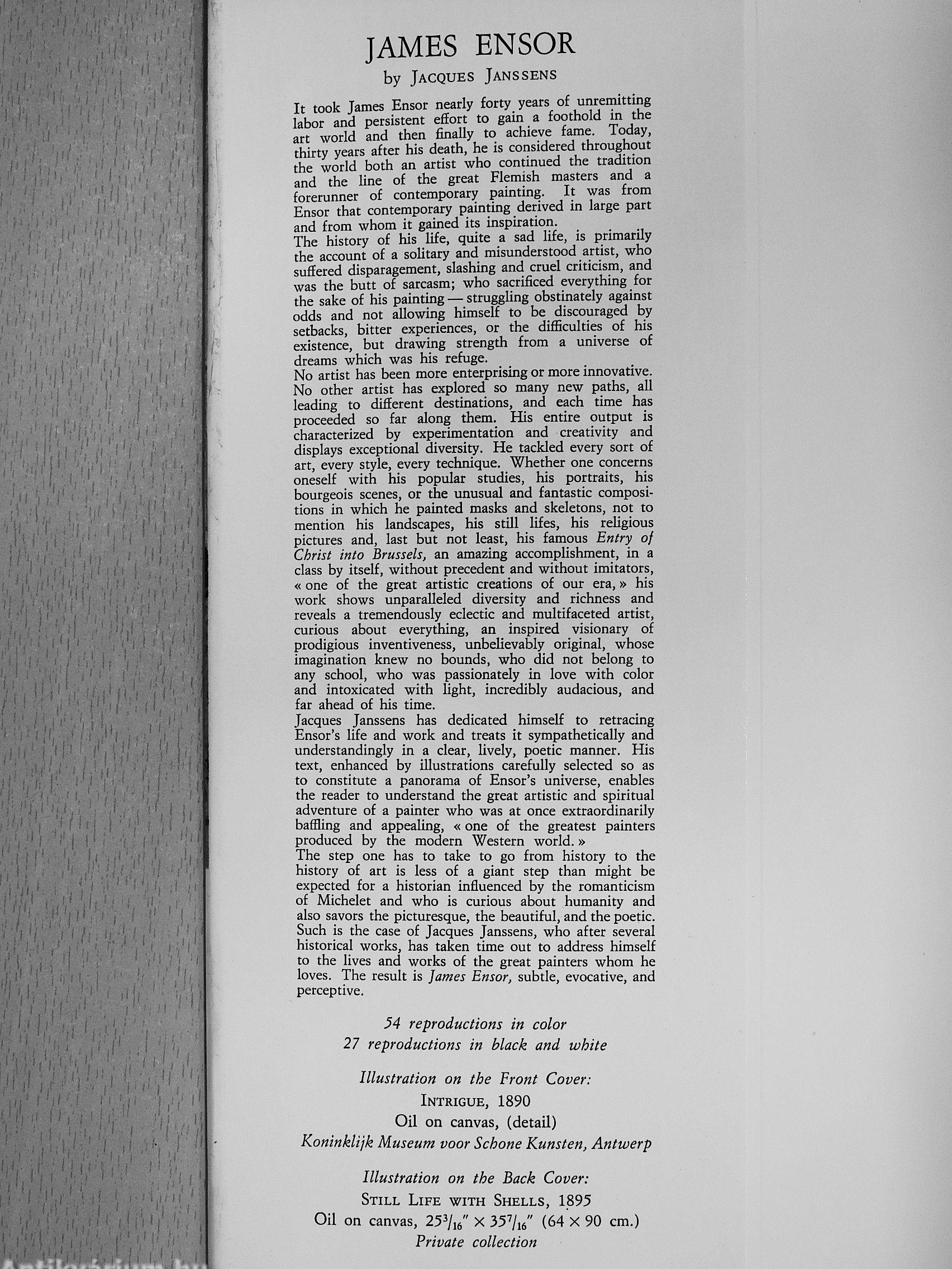 Jacques Janssens has dedicated himself to retracing Ensor's life and work and treats it sympathetically and understandingly in a clear, lively, poetic manner. His text, enhanced by illustrations carefully selected so as to constitute a panorama of Ensor's universe, enables the reader to understand the great artistic and spiritual adventure of a painter who was at once extraordinarily baffling and appealing, « one of the greatest painters produced by the modern Western world.» The step one has to take to go from history to the history of art is less of a giant step than might be expected for a historian influenced by the romanticism of Michelet and who is curious about humanity and also savors the picturesque, the beautiful, and the poetic. Such is the case of Jacques Janssens, who after several historical works, has taken time out to address himself to the lives and works of the great painters whom he loves. The result is James Ensor, subtle, evocative, and perceptive.